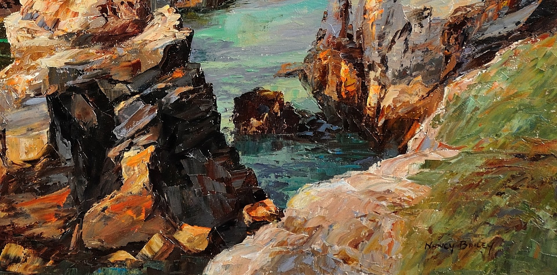 Nancy only started painting seriously when she returned to Cornwall in her fifties. Her painting career, though started somewhat late, continued over forty years. Nancy worked with a palette knife and never used a brush. This gives her work its distinctive texture and captures the landscape and light. Nancy became acclaimed as one of the leading palette knife artists in the UK.