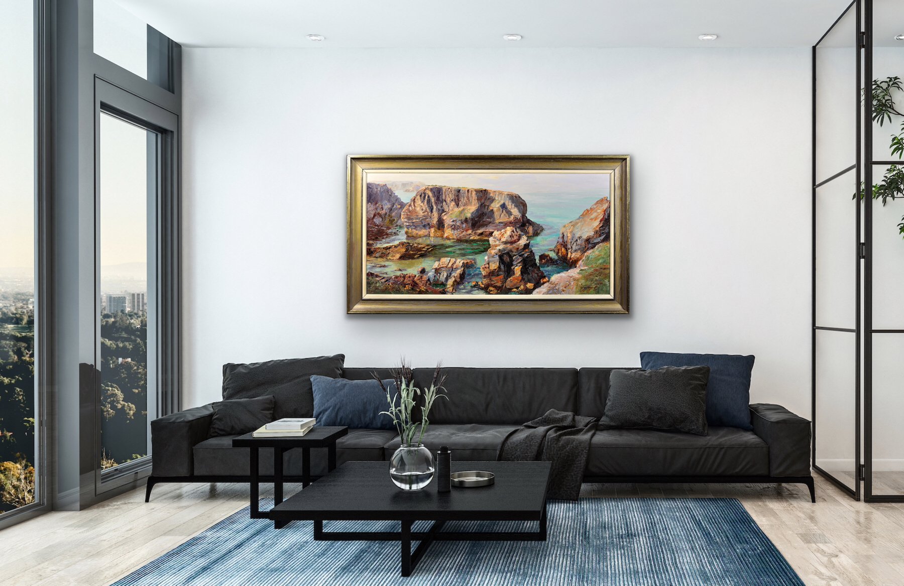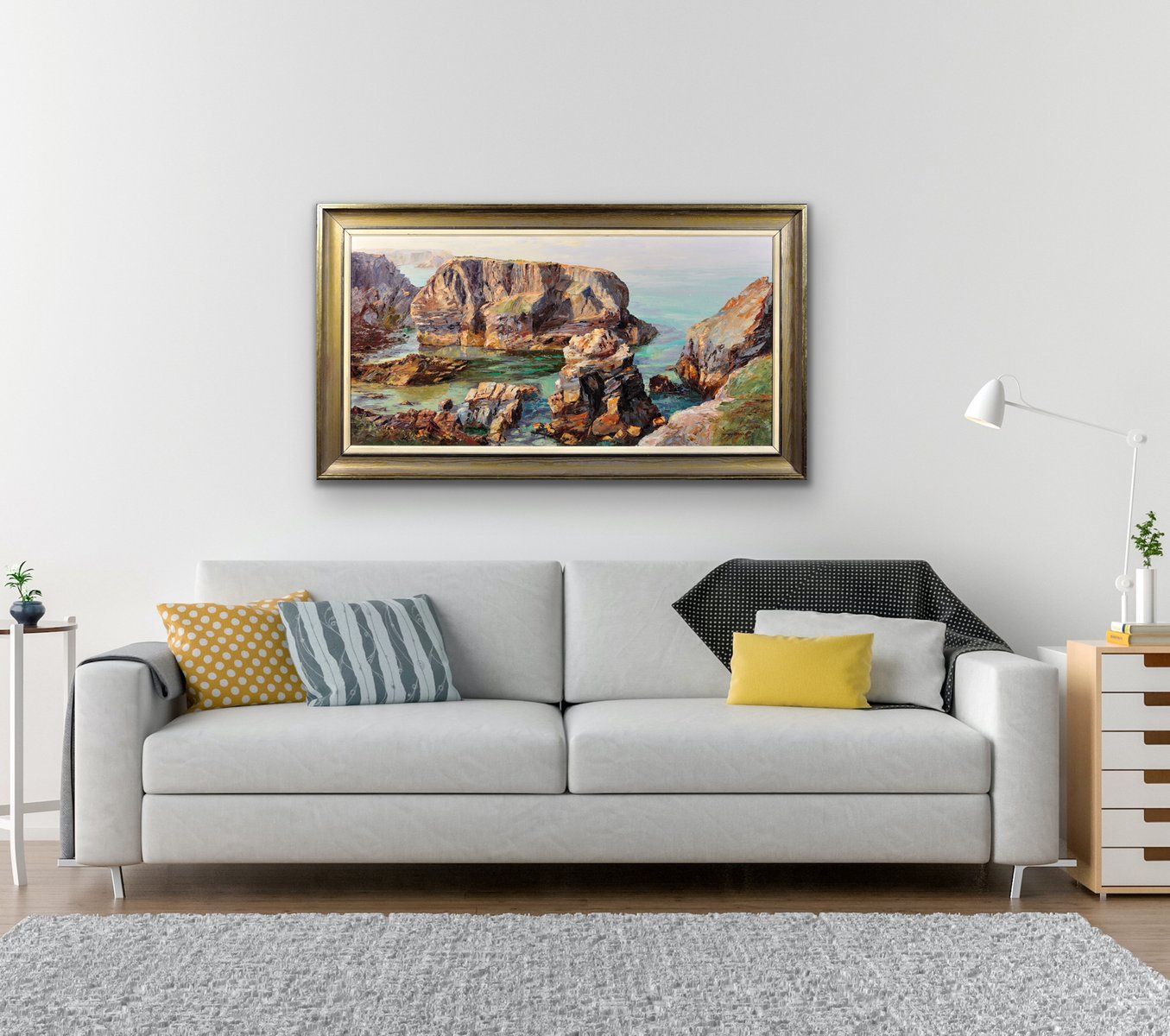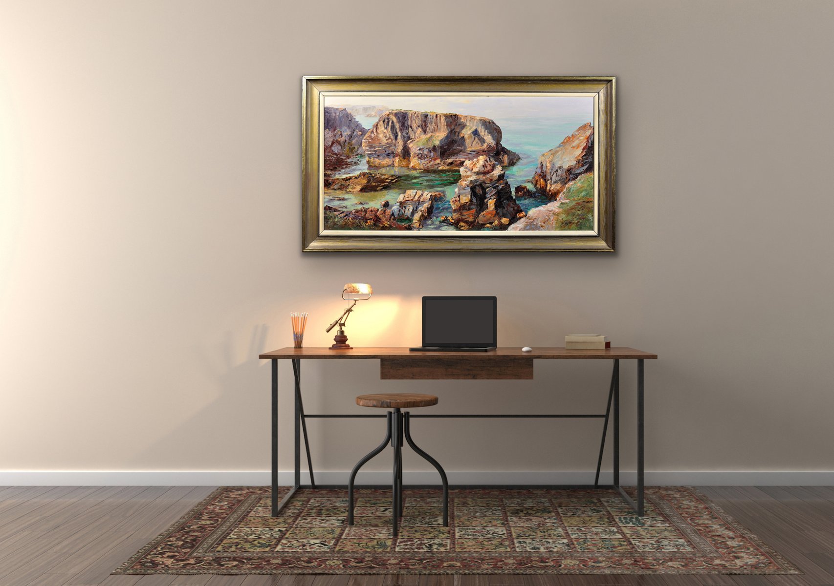 Le Minnows Islands sono un gruppo di grandi scogli nel mare al largo della costa della Cornovaglia, a nord di Porthcothan, vicino a Fox Cove. Fanno parte di una costa particolarmente drammatica e bella. Questo olio su tela originale mostra una vista delle Minnows dalla riva, da un punto di osservazione elevato. Le rocce scoscese, nelle delicate tonalità della pietra e del marrone, si ergono solide e orgogliose, mentre il mare sotto di loro appare limpido e calmo. L'uso del turchese nelle acque è particolarmente efficace, in quanto conferisce al mare una proprietà traslucida. In lontananza il cielo è pallido e l'orizzonte è quasi indistinguibile dall'oceano.