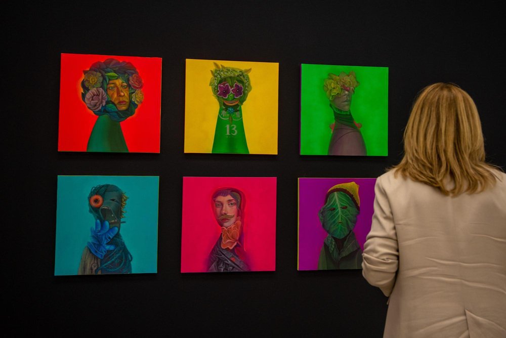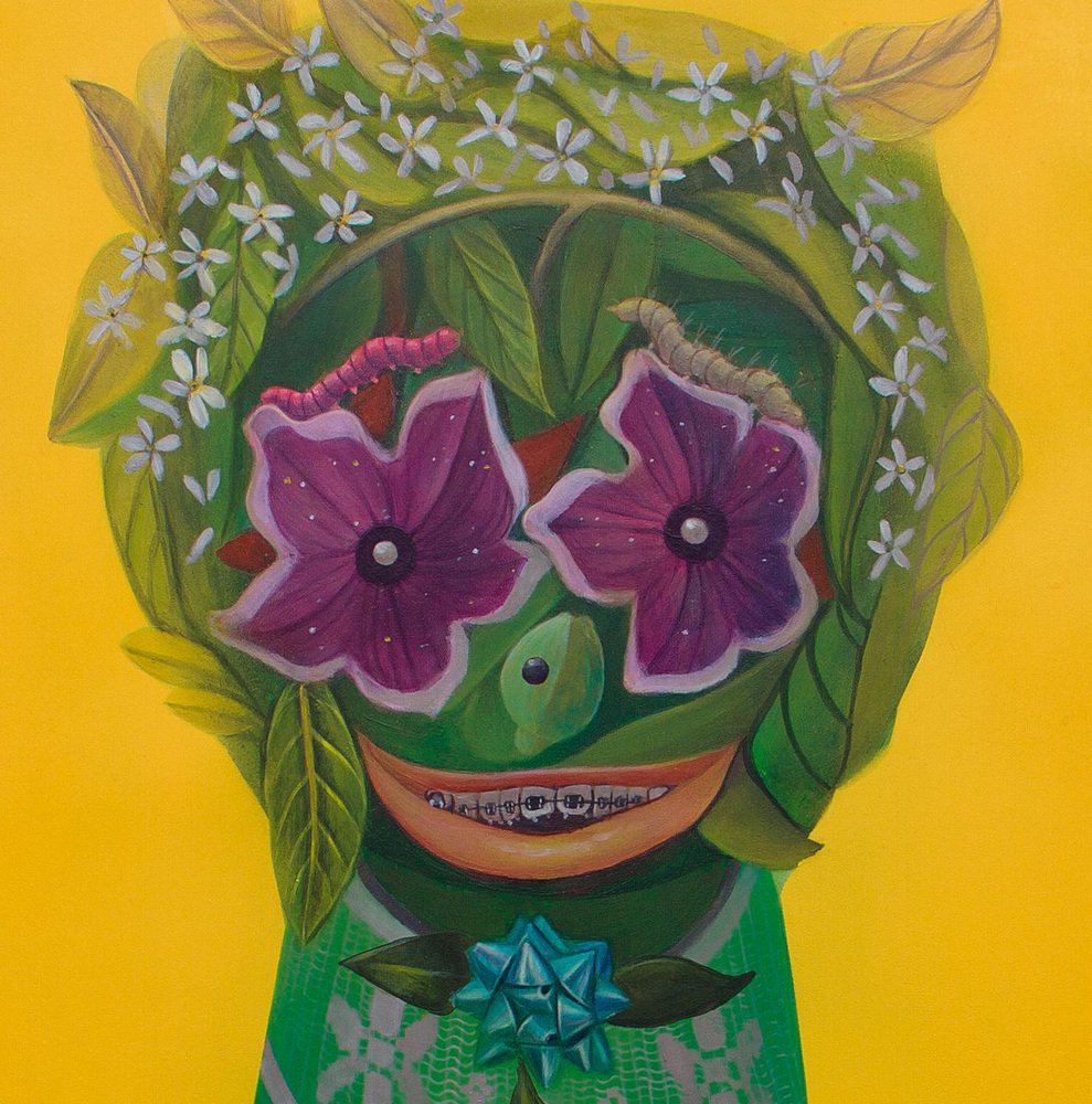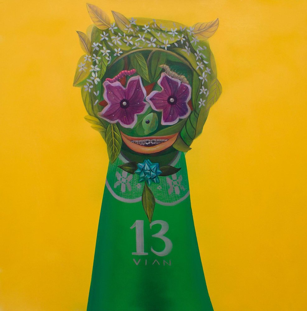 "Vian 13" is one of the pieces from the "Fetishes" series created by Natasha Lelenco in 2022. A suggestion of a face comes to sight in artist Natasha Lelenco's surrealist yellow and green composition. She creates an anthropomorphic figure using floral elements, visually shaping an old teenage game. Its body reads Vian 13, a fictional group named after an acronym of four friend's names, against the boyband from the 90s, East 17. Part of her Fetishes series, drawing from musical memory in conjunction with her visual memory. The pieces merge popular imagery and botanical elements, exploring the intertwining of humans with the living world. This painting was originated as a commission for the exhibition "Imaxinaria, Mostra Internacional de Ilustración Contemporánea" in Santiago de Compostela and A Coruña, Spain. It is part of the "Fetishes" series where the artist addresses themes such as the human position in nature, questioning anthropocentrism as an unquestionable stance. The piece has been conceived as an absolute whole and does not require a frame. The sides have been worked on and are an integral part of its composition. Lelenco's "Fetiches" series melds portraiture and anthropomorphic forms, achieved through a meticulous accumulation of elements. These elements intertwine with a nuanced thematic exploration, touching upon both kitsch and popular iconography. The series also delves into the inseparable connection between humanity and the larger living community. Drawing from her personal biography, Natasha Lelenco constructs a dialogue between memory and imagery. Through a skillful process, she resurrects fragments of her past to craft fresh narratives that challenge conventional perceptions of existence. This narrative depth, coupled with psychological complexity, echoes classical influences, seamlessly bridging the gap between Renaissance portraiture and contemporary expression. Notably, Lelenco's "Fetiches" series echoes the artistic echoes of Italian painter Giuseppe Arcimboldo. These pieces have been designed to function individually or to be combined into multiple panels, engaging in dialogue with other artworks from the same series. Note: The use of fluorescent colors makes it difficult to reproduce it completely faithfully, so the reproductions shown do not do justice to the intensity and brightness of the original piece, which could vary subtly.
