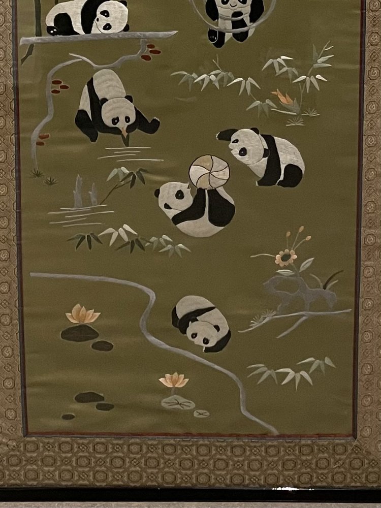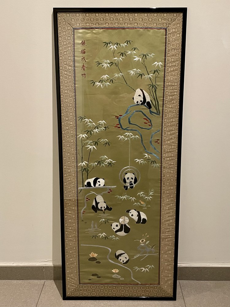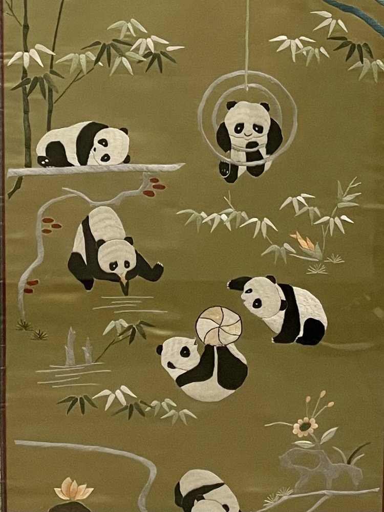 Pannello con orsetto in seta ricamato con cornice, 1935