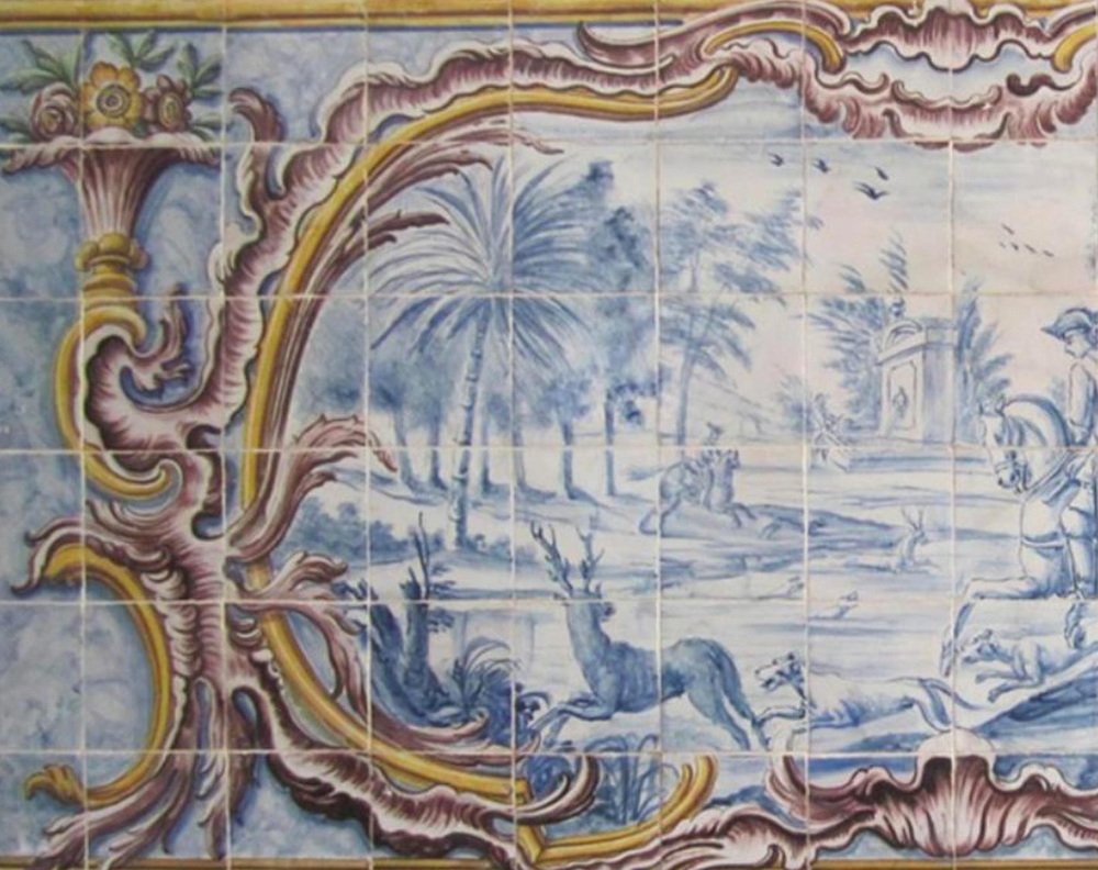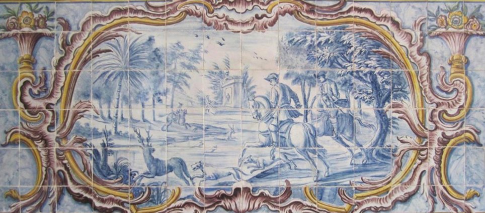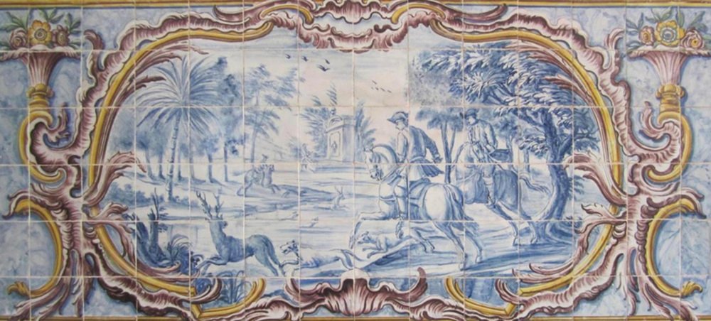 Questo pannello è con le tessere restaurate del XVIII secolo. Il pannello viene consegnato come se fosse un dipinto con uno scheletro di legno in modo che le piastrelle siano nella loro posizione originale. L'antica piastrella portoghese "Azulejo" Al-zuleique è la parola araba da cui deriva la piastrella e designa la "piccola pietra liscia e levigata" utilizzata dai musulmani nel Medioevo. Il modo in cui applicavano le piastrelle per decorare pavimenti e pareti piacque ai re portoghesi e così, a partire dal XV secolo, esse assunsero un posto di rilievo nell'architettura. Si può dire che il Portogallo le adottò in modo unico, come nessun altro Paese europeo. Nel XVIII secolo la piastrella "invase" chiese e conventi, palazzi e case, giardini, fontane e scalinate. Con motivi geometrici, raccontando storie della vita dei santi o temi profani come le favole di La Fontaine, a volte con un testo come se fosse un antenato del fumetto, diventarono uno dei principali elementi decorativi portoghesi. Oggi l'antica piastrella portoghese è un oggetto da collezione di grande prestigio ed è ricercata dalle migliori case d'asta del mondo per offrire ai propri clienti questa magnifica opera d'arte mondiale.
