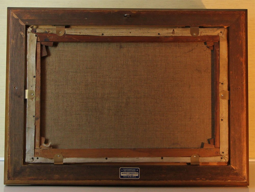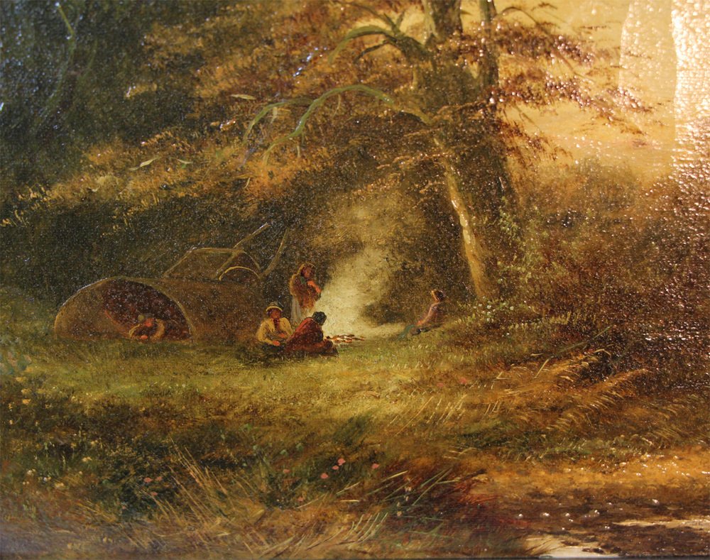 Un gioiello romantico magistralmente dipinto dall'artista britannico Peter Leslie (1877- ). A prima vista, lo sguardo è attratto dal piccolo ma vivace accampamento gitano situato sulla sinistra della composizione. Un gruppo di quattro figure si riunisce attorno a un ipnotico falò. Un'altra figura fa capolino da una delle tende. Le figure, dipinte con sorprendente maestria, danno vita alla scena. Al centro della composizione si trova la pittoresca costa di un sereno stagno o lago, ornata da delicati fiori di campo. Sullo sfondo si apre un ampio paesaggio romantico, con un prato abbracciato da erbe alte e alberi sparsi sotto un cielo splendente. Il cielo, ornato da un affascinante tramonto, dipinge uno sfondo ipnotico per la scena. Le sue tonalità di gialli e rossi caldi gettano una luce serena e incantevole sull'intero dipinto. Questo notevole dipinto reca la firma "P. Leslie" nell'angolo in basso a destra. L'opera è incorniciata con cura in una cornice dorata di alta qualità.