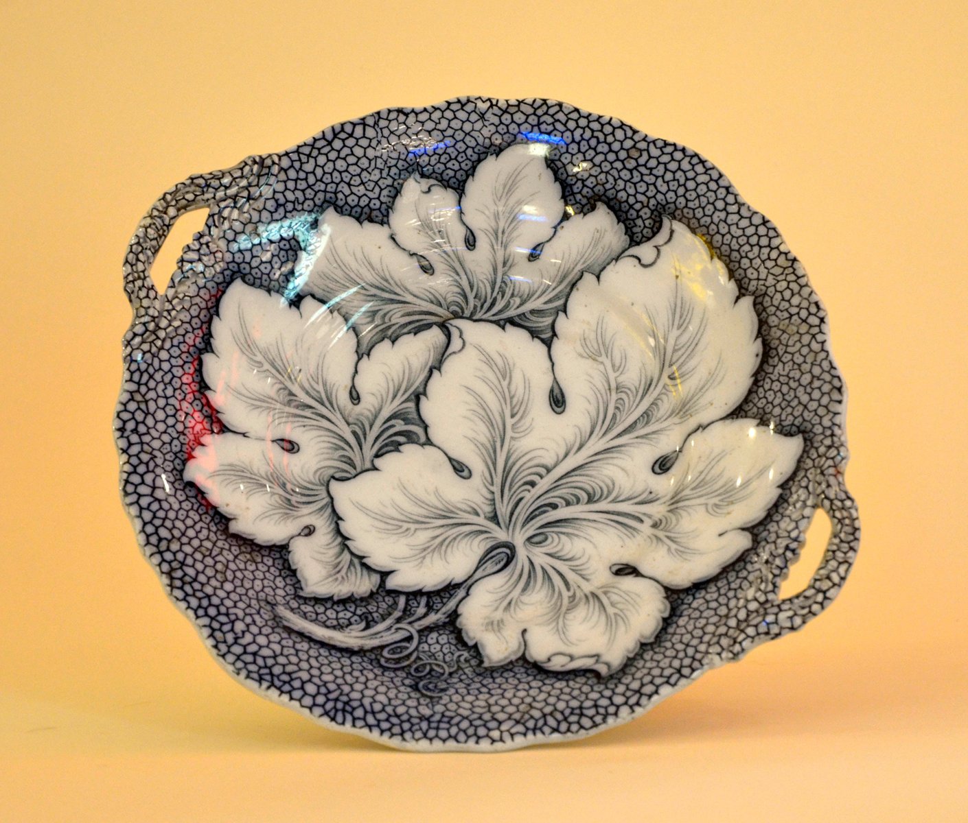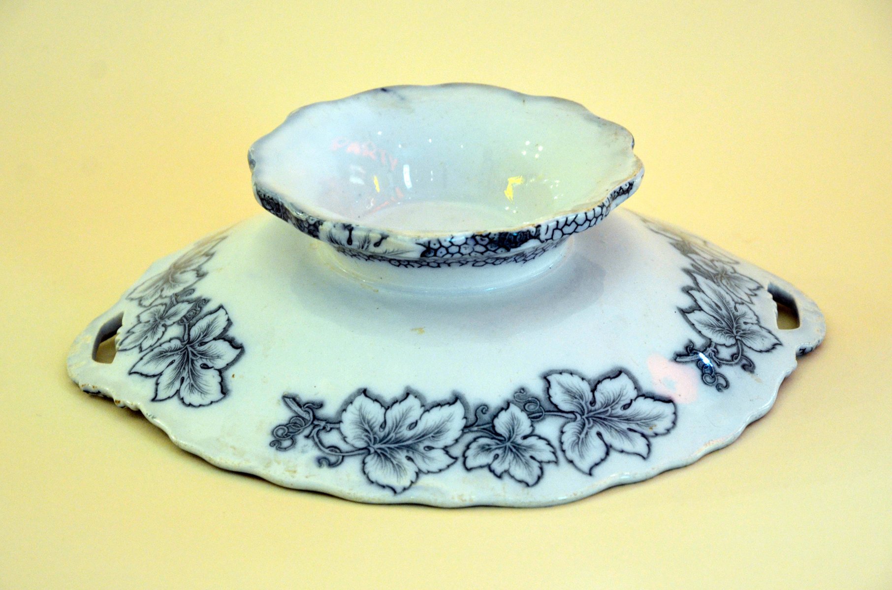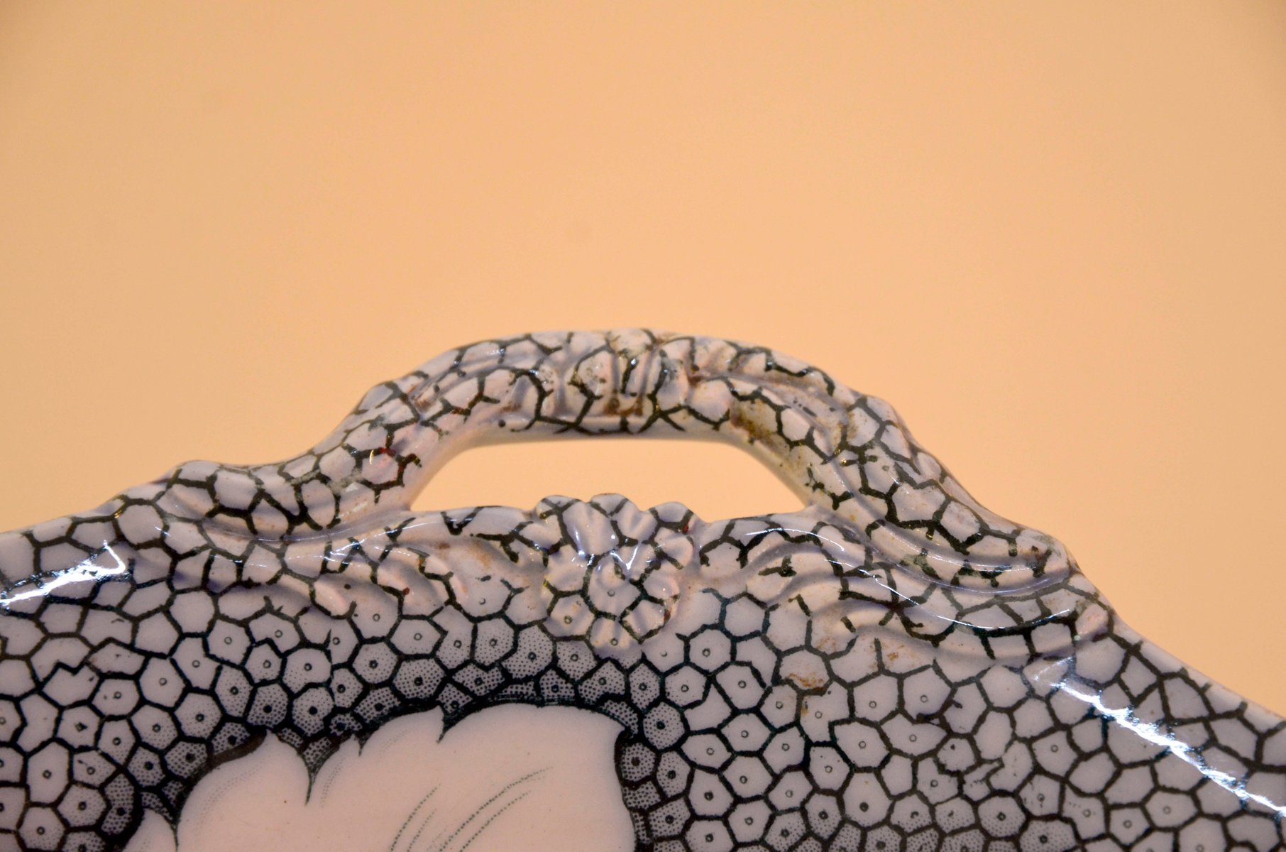 1830s antique Thomas Dimmock pearlware footed and handed platter made in England.This piece in very good condition have a rare dark blue grape leaf pattern and is marked PEARL WARE and Thomas Dimmock monogram.Collector's note:Thomas Dimmock & Co was active between 1828 and 1859 in Shelton, an area of the city of Stoke-on-Trent in Staffordshire, England, between Hanley and Stoke-upon-Trent.Pearlware is an earthenware made by Josiah Wedgwood in 1779. It was copied by other potters in England such a Thomas Dimmock. Pearlware is only slightly different in color from creamware and for many years collectors have confused the terms. Only certain colors like blue, yellow, and green were used as underglaze painting for pearlware because materials for other colors could not stand the heat necessary to fire the glaze.