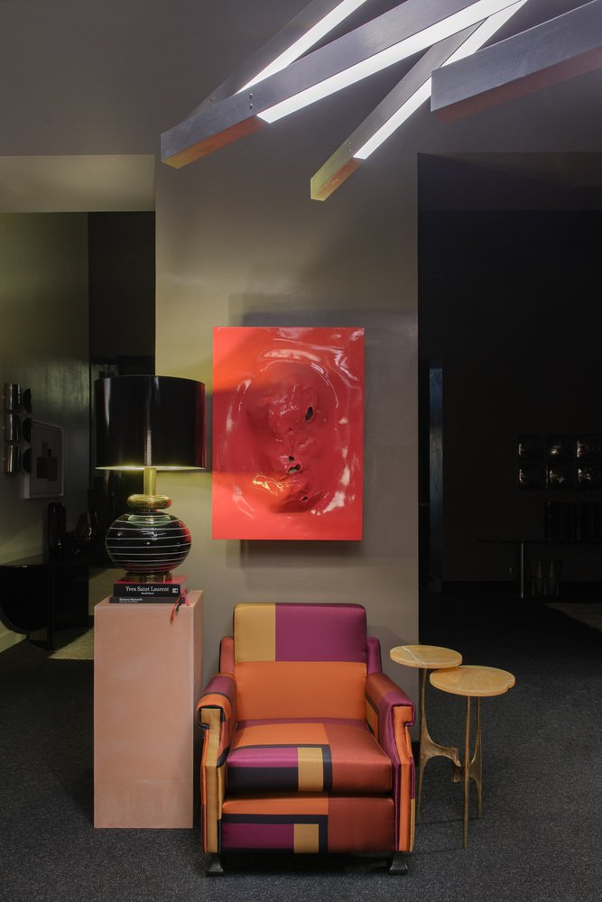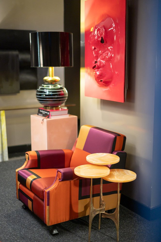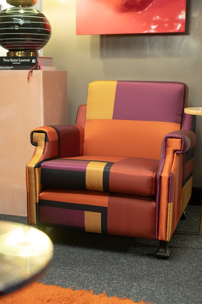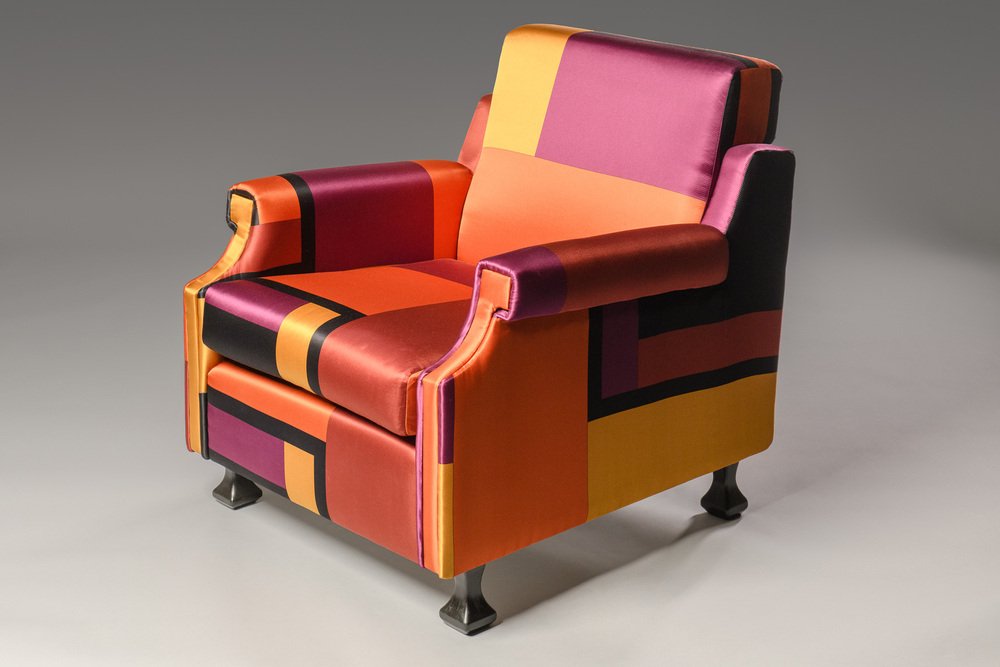 La poltrona, che è stata interamente restaurata (è stata sostituita l'imbottitura in gommapiuma del cuscino della seduta e restaurato uno dei piedi in legno) ha una struttura molto semplice e lineare, impreziosita dal tessuto di rivestimento. Si tratta di una seta stampata (True colors) disegnata da Dimore Studio, Milano, nel 2015.
