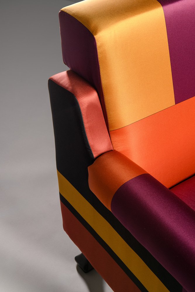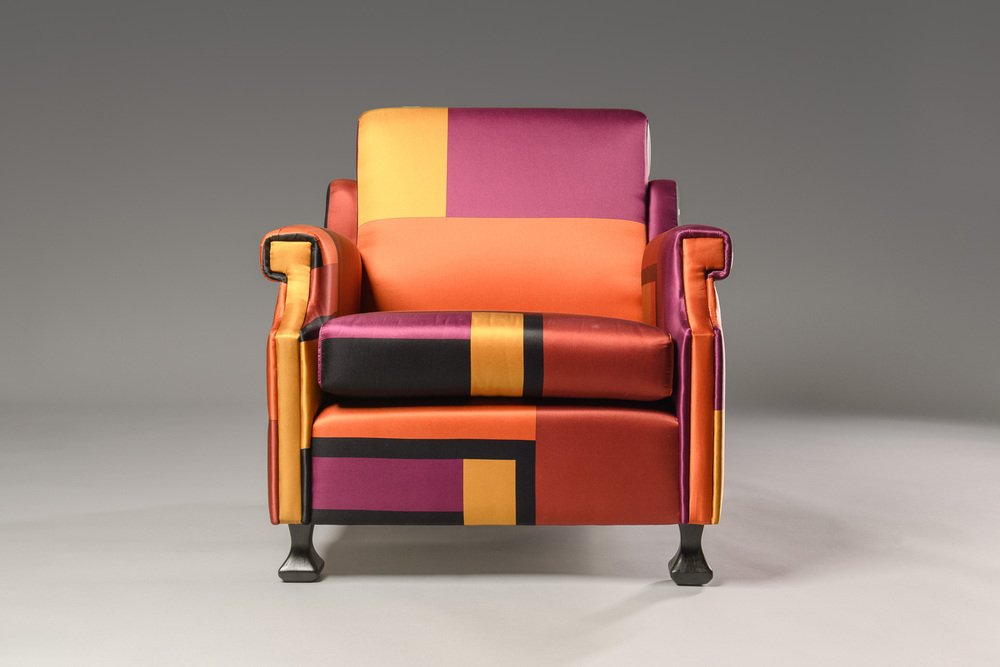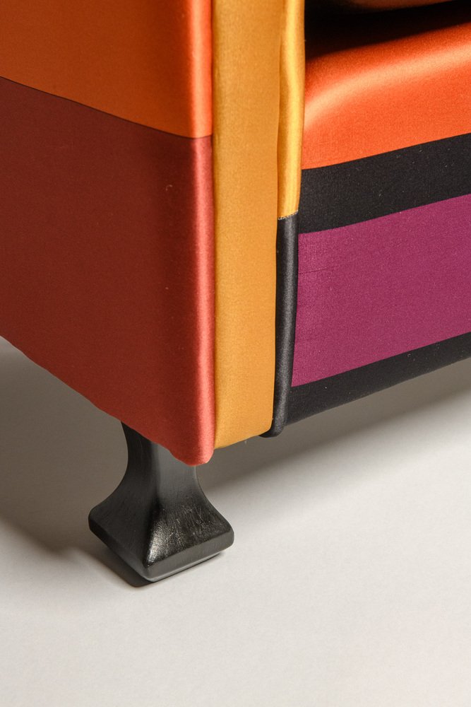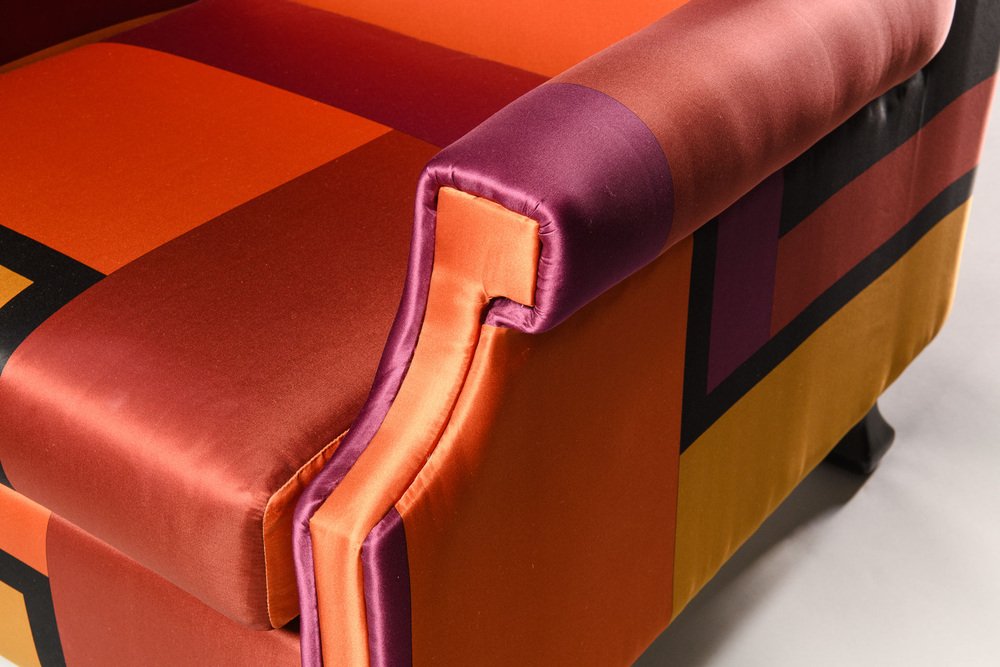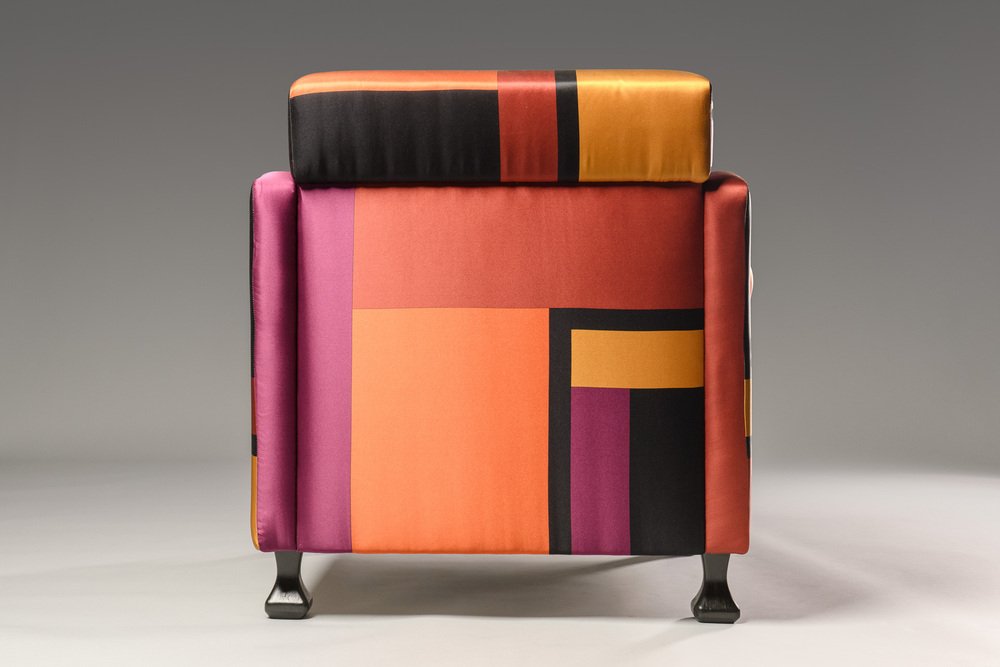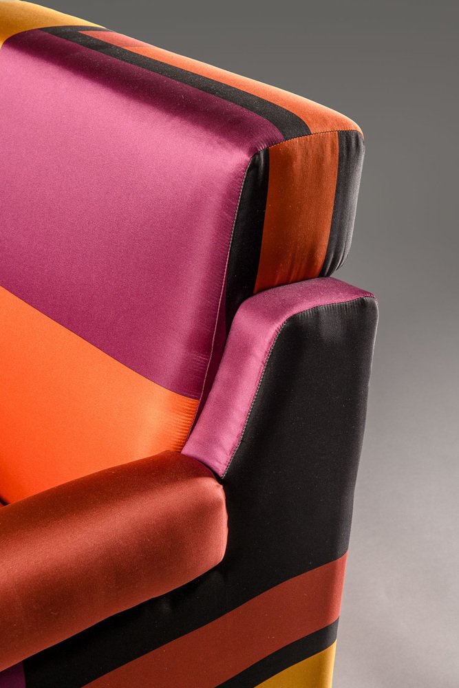 The armchair, which has been entirely restored (the foam padding of the seat cushion was replaced and one of the wooden feet restored) has a very simple and linear structure, embellished with the upholstery fabric. It is a printed silk (True colors) designed by Dimore Studio, Milan, in 2015.