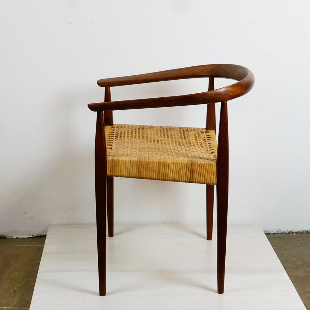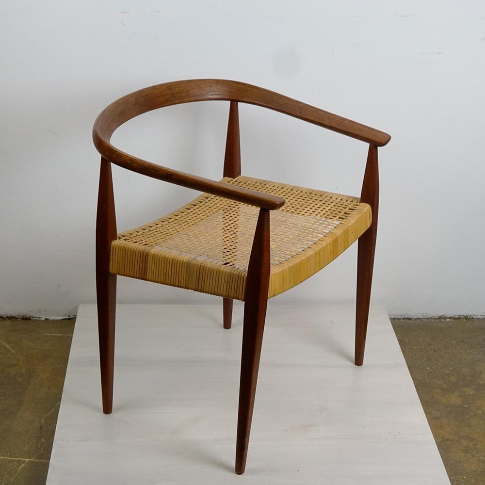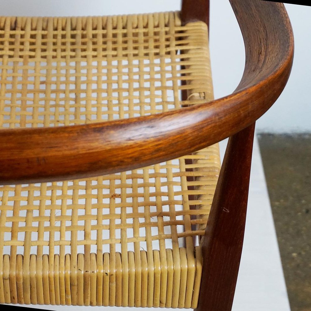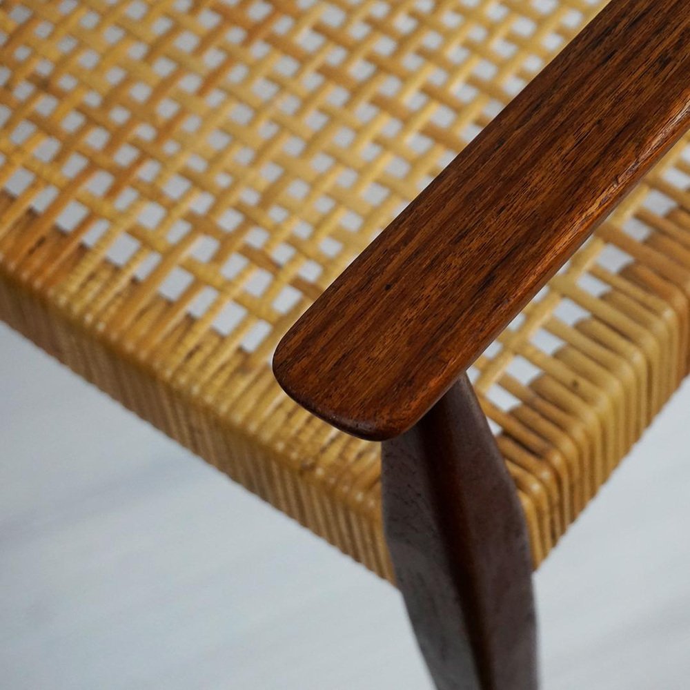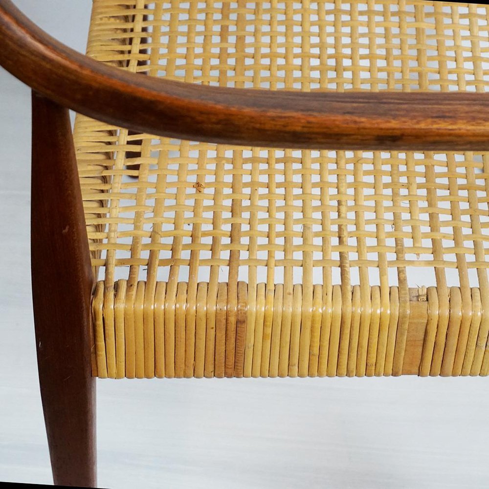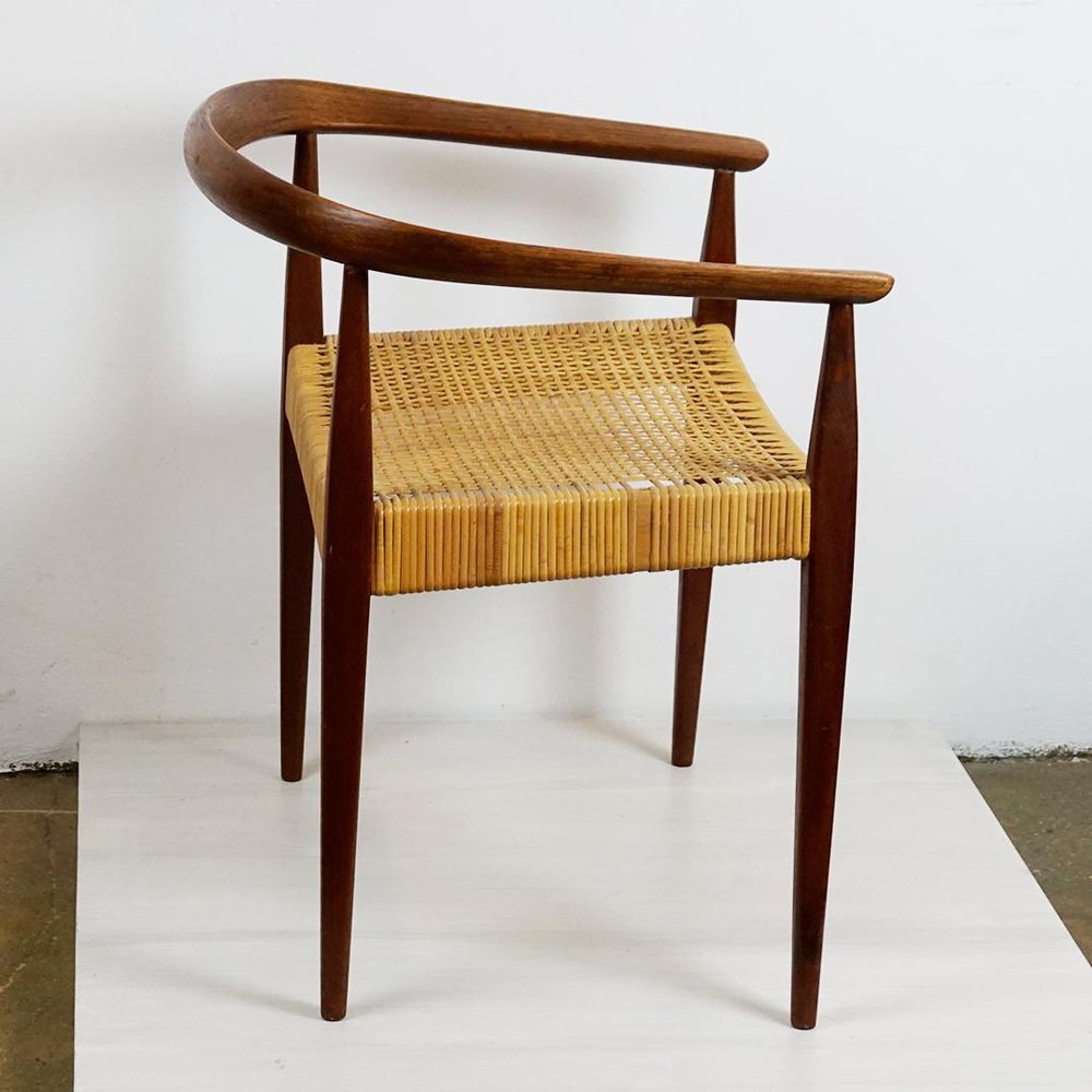 This very beauytiful and rare scandinavian Modern Oak armchair was designed by Nanna Ditzel for Kolds Savvaerk, made in Denmark. This Model 113 chair, with it's elegant and ergonomic shape, is instantly recognizable as being Danish Mid-Century Modern. As with most of Ditzel’s designs, like her iconic “Egg Chair” (c. 1959), the Model 113 chair is based on a circular shape as shown with the deep curvature of the backrest. This graceful curve is contrasted with the square, tapered shape of the legs and the smooth oak softens this juxtaposition; resulting in a balanced and clean-lined frame. The delicately hand-woven, multi-colored cane seat perfectly offset the deep richness of the solid oak frame. The slight bow of the seat flows with the curves of the frame, making the chair both cohesive and comfortable. This delicate chair, with it's use of premium materials and subtle elegance, showcases all of the best qualities of Danish Mid-Century Modern design. This Mod. 113 armchair comes in very good original condition with some slight wear due to its age and small loss in the cane seat, please have a look at the pictures!