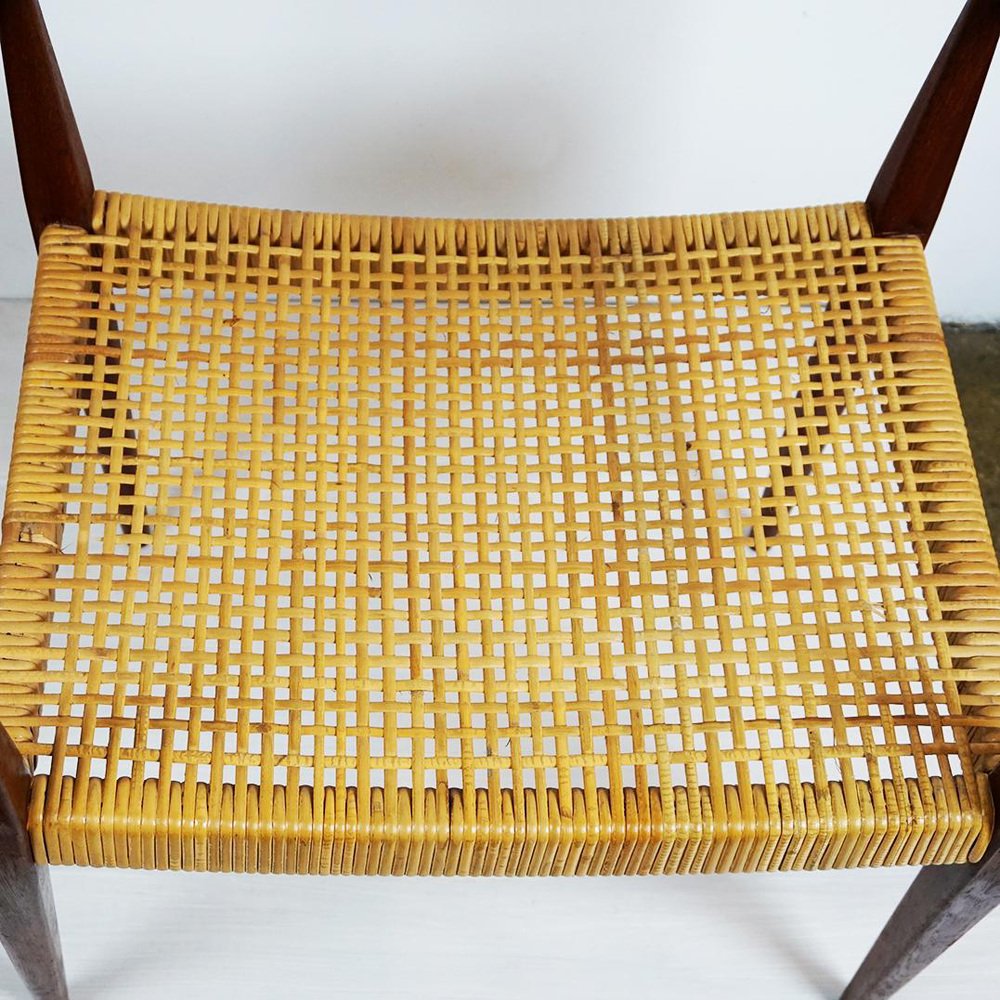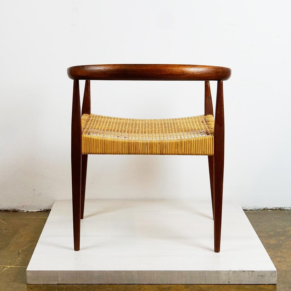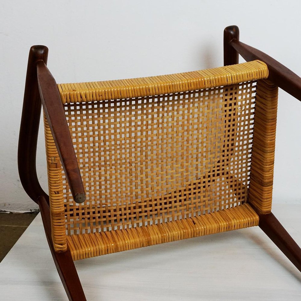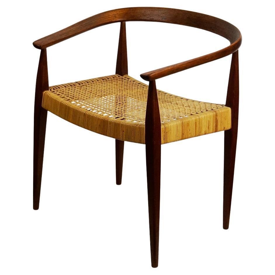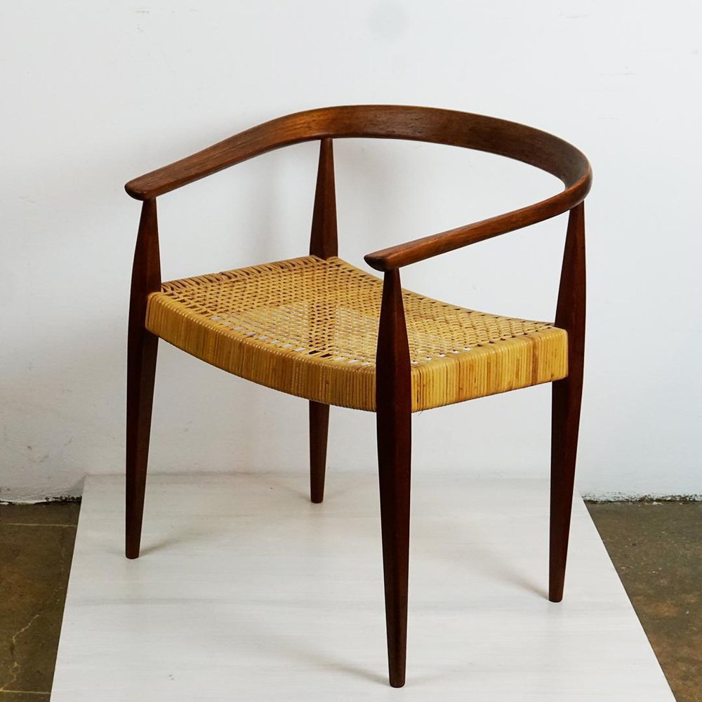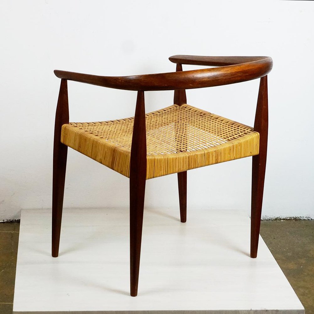 This very beauytiful and rare scandinavian Modern Oak armchair was designed by Nanna Ditzel for Kolds Savvaerk, made in Denmark. This Model 113 chair, with it's elegant and ergonomic shape, is instantly recognizable as being Danish Mid-Century Modern. As with most of Ditzel’s designs, like her iconic “Egg Chair” (c. 1959), the Model 113 chair is based on a circular shape as shown with the deep curvature of the backrest. This graceful curve is contrasted with the square, tapered shape of the legs and the smooth oak softens this juxtaposition; resulting in a balanced and clean-lined frame. The delicately hand-woven, multi-colored cane seat perfectly offset the deep richness of the solid oak frame. The slight bow of the seat flows with the curves of the frame, making the chair both cohesive and comfortable. This delicate chair, with it's use of premium materials and subtle elegance, showcases all of the best qualities of Danish Mid-Century Modern design. This Mod. 113 armchair comes in very good original condition with some slight wear due to its age and small loss in the cane seat, please have a look at the pictures!