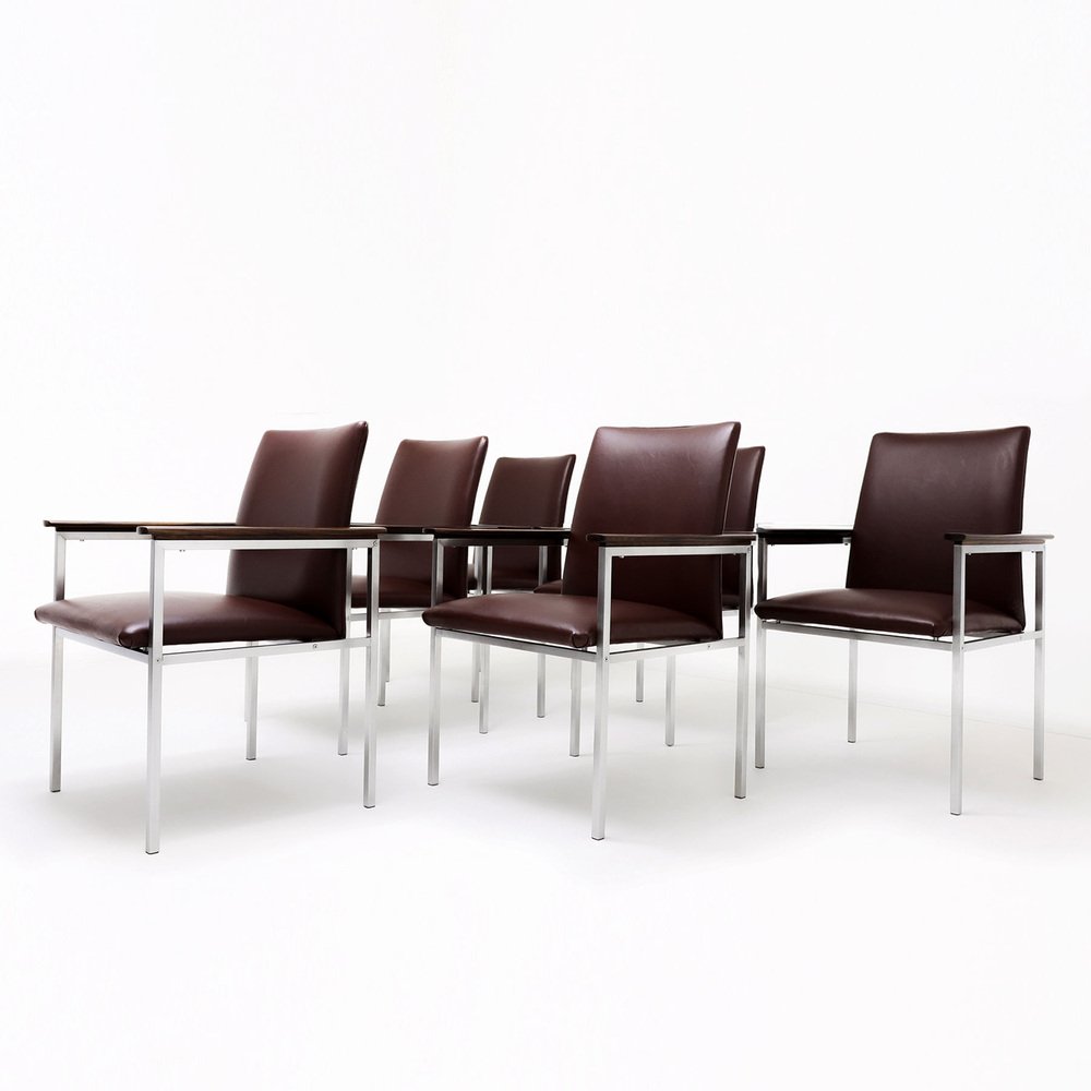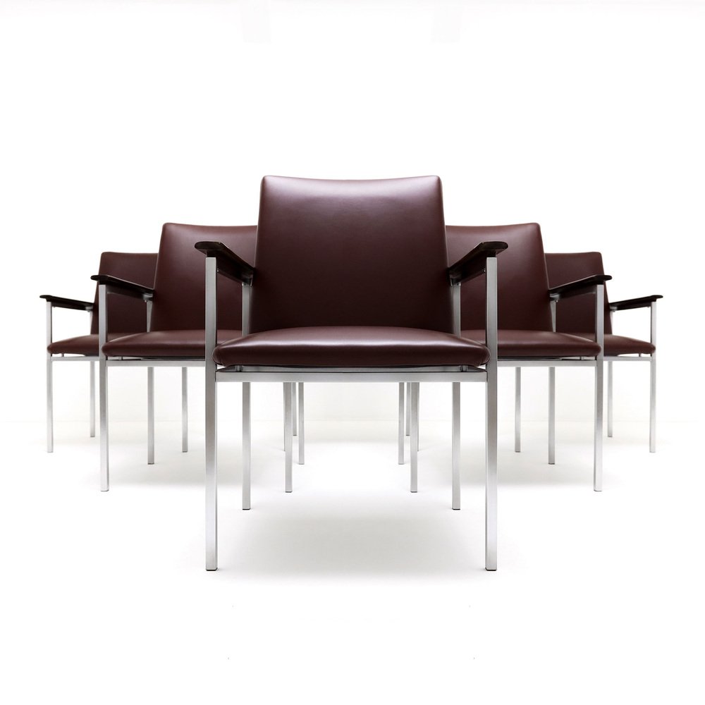 A rare complete set of 6 Sigvard Bernadotte H-line Danish armchairs in dark burgundy leather with brushed steel frames and solid Walnut arms for France & Son.