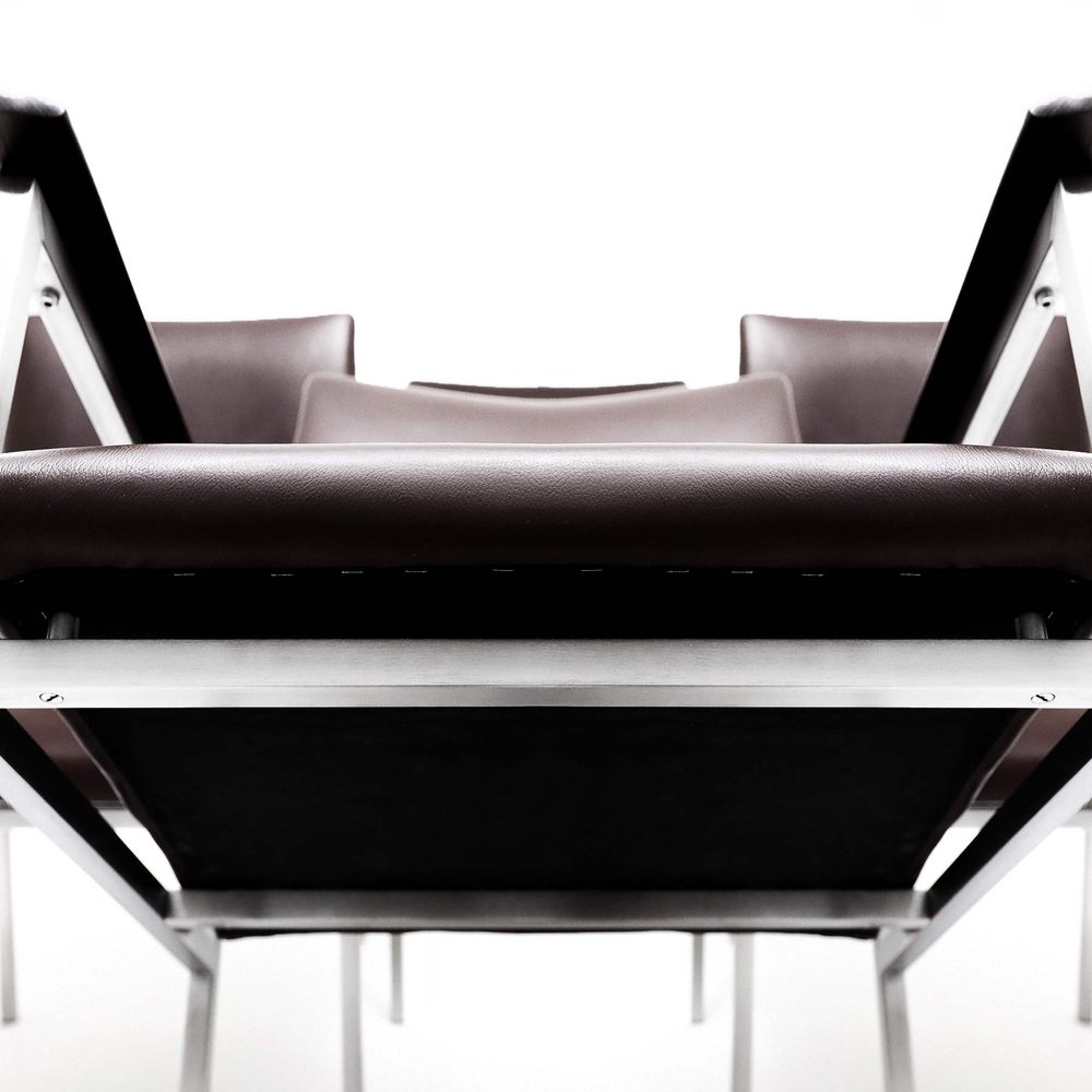 The quality, as always associated with both France & Son and Cado, shines through on these chairs. from the almost seamless welding of the joints on the square tubing to how all the bolts and screws are recessed to be flush with the frame; everything exhibits an impressive attention to detail. It’s therefore reassuring to note that the renovation of the chairs follows the same ideal. It looks like the frames have been meticulously cleaned, stripped, brushed and polished and the chairs beautifully reupholstered in high quality dark burgundy leather. These details combined with the contoured, waxed and polished solid Walnut arms creates a truly sophisticated and elegant set of chairs that would work well as dining chairs or even as a set of impressive board room chairs.