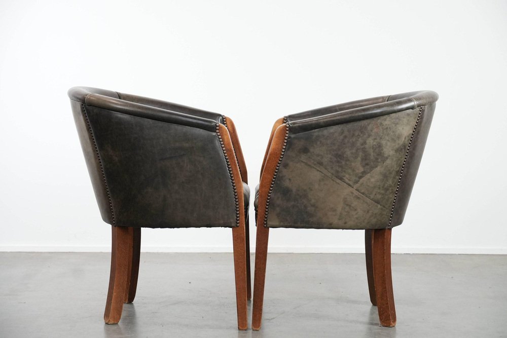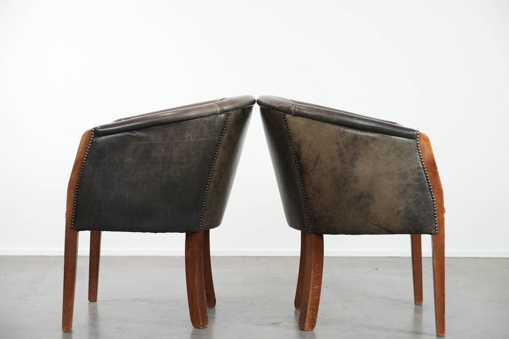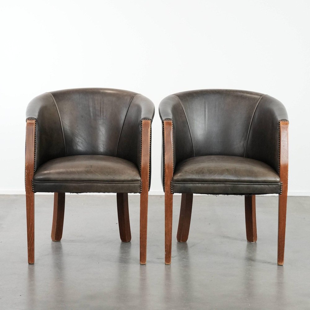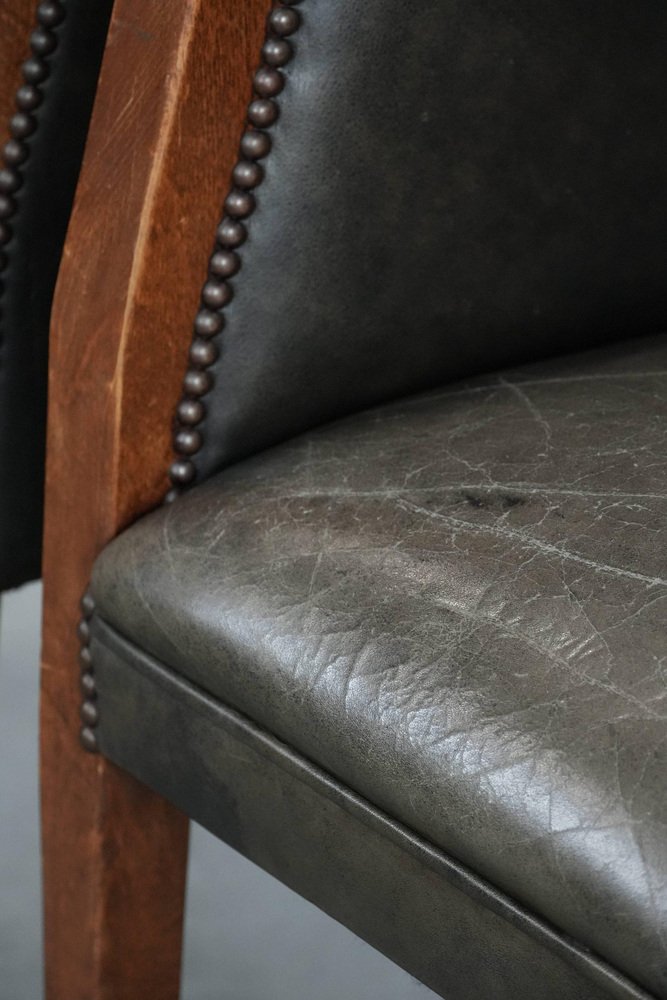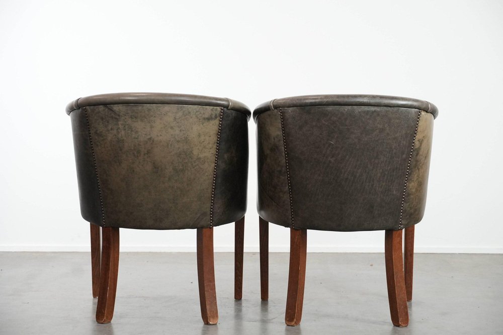 This characterful set of two cowhide tub chairs/side chairs is finished with decorative nails and can easily be placed in both classic and modern interiors. They are perfect not only in a home environment, but also in an office or hospitality setting, for example. They are multifunctional, partly due to their modest size and higher seat height. This makes them suitable as side chairs, office chairs, or dining chairs. Due to responsible use, they have sustained normal wear and tear. Structurally, they are in good condition and ready for immediate use. Where will you place them? Please note: The dimensions stated in our advertisement are the leading dimensions. Photos are part of the . Dimensions: Height: 80 cm, Width: 64 cm, Depth: 65 cm, Seat height: 49 cm, Seat depth: 48 cm