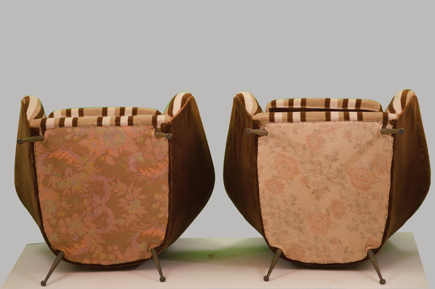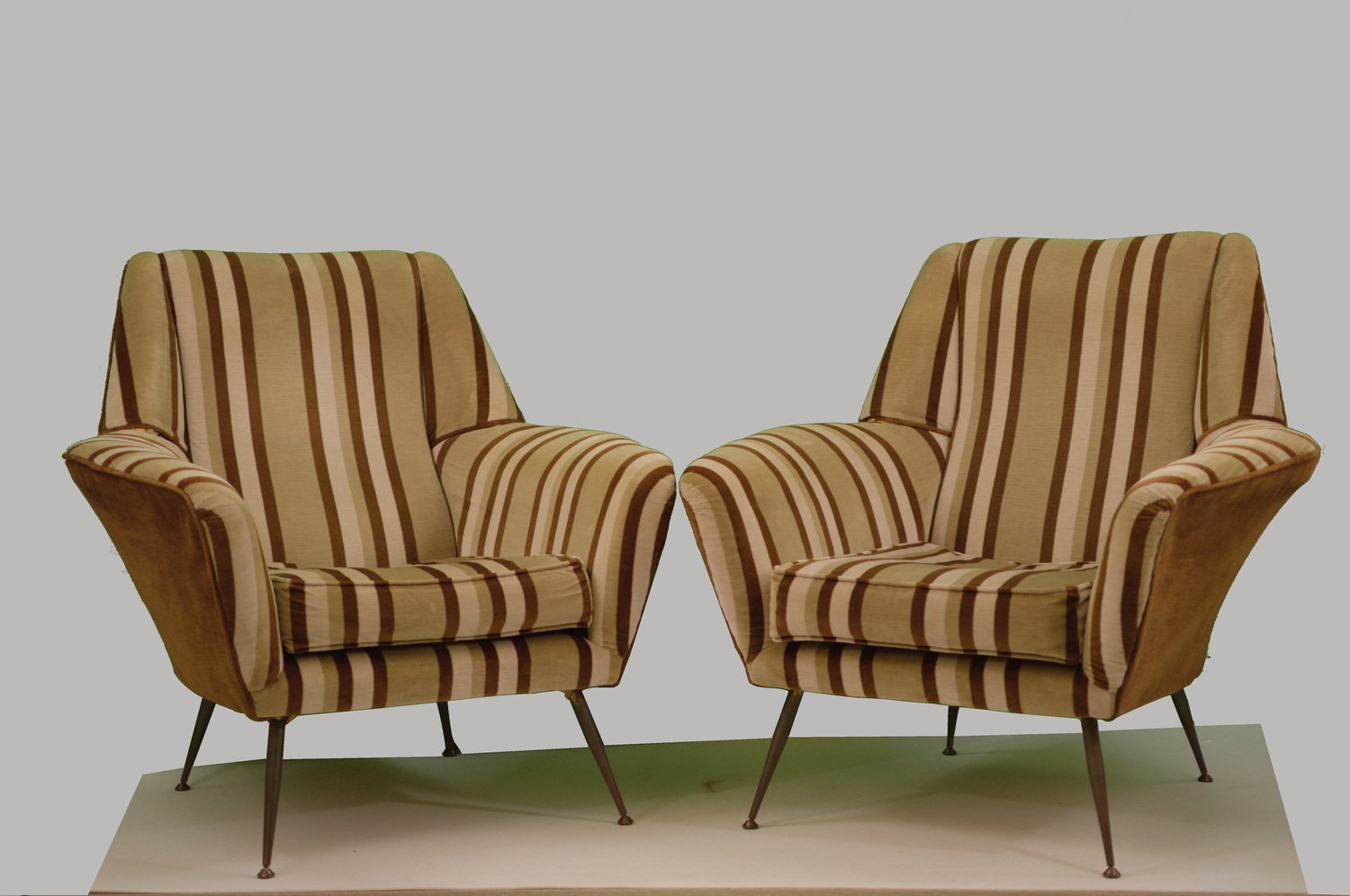 It has not been possible to certify the attribution with certainty. However, many congruences with Minotti items designed by Gigi Radice and dating back to the '50s are detectable. Among these congruences there is the model, that results to other documented models and beaten to the auction, as also the fantasy and the fabric. In particular, the shape of the support feet of the two armchairs leads back to the well-known designer. The two armchairs are in excellent condition. At the time of the quality check, no major imperfections were found on the upholstery. The seat is comfortable.