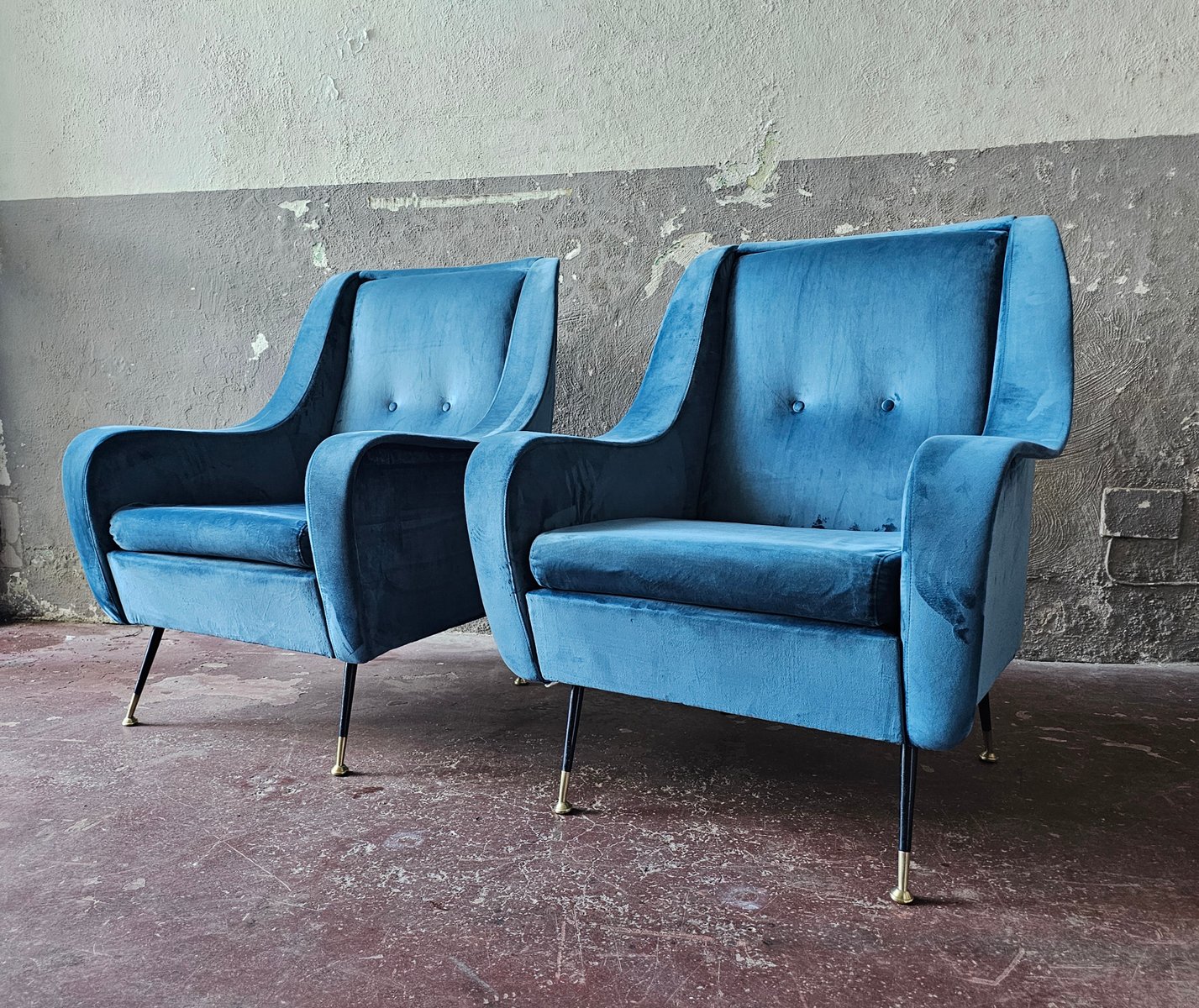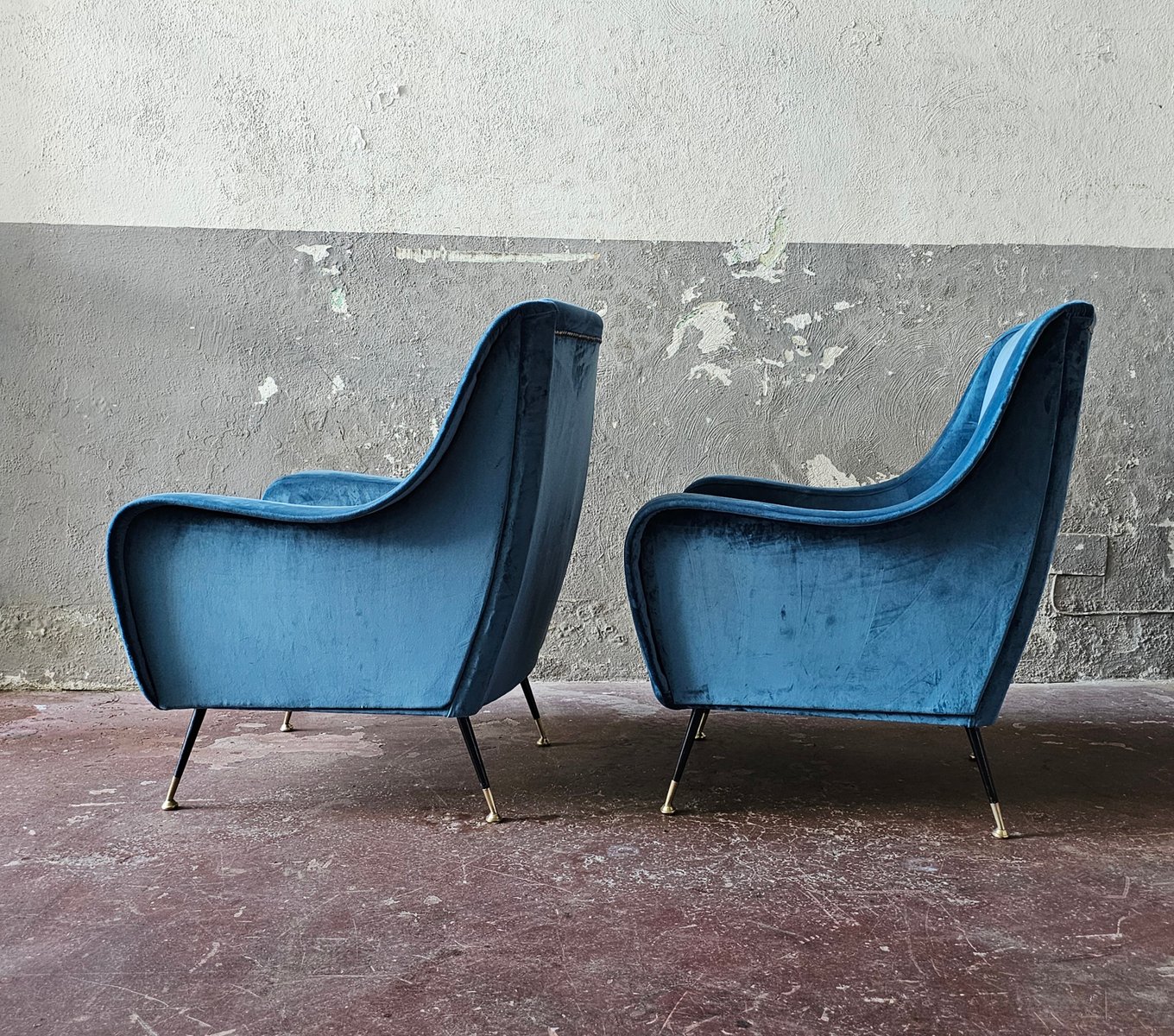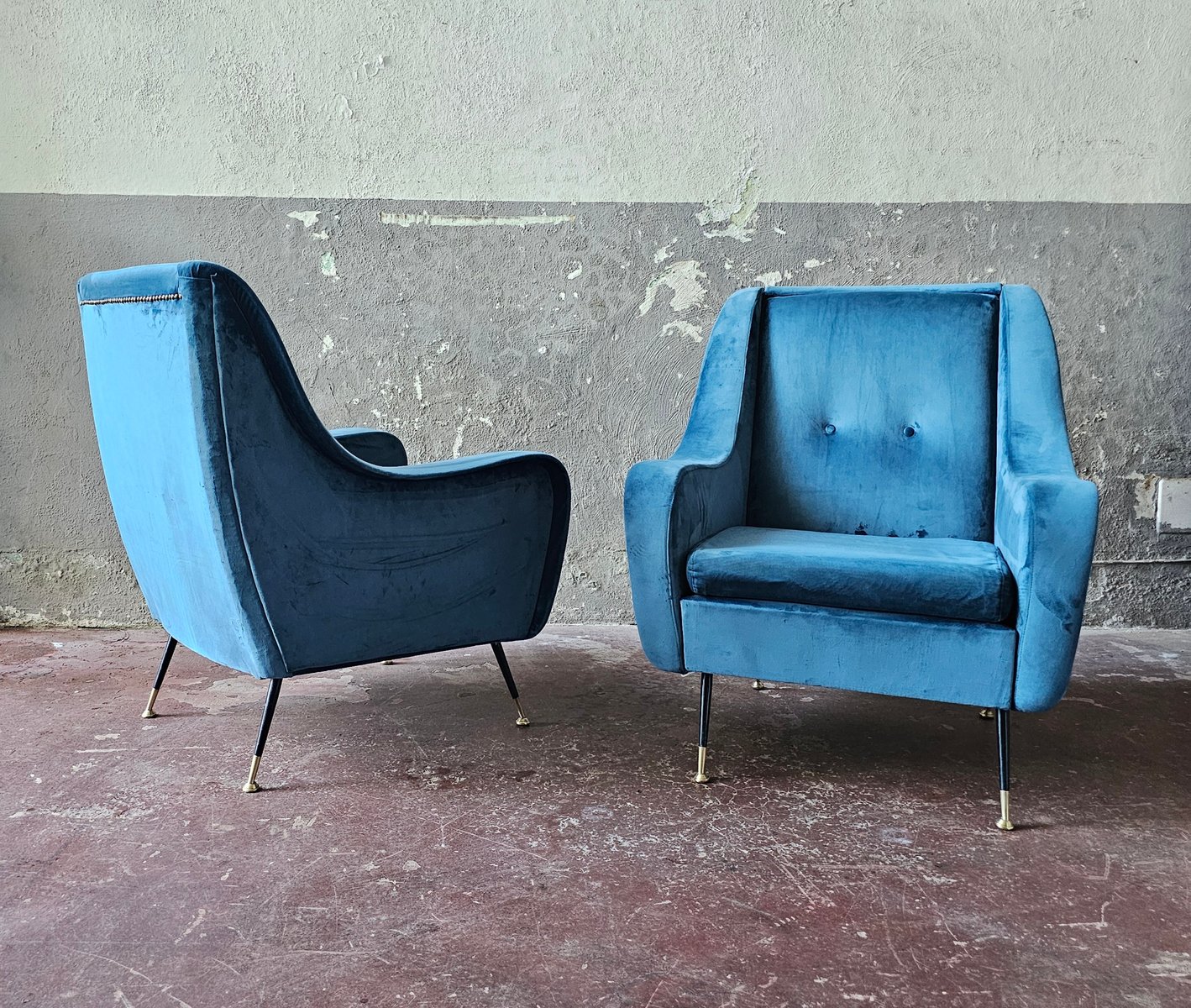 Poltrone Mid-Century in velluto blu, Italia, anni '50, set di 2