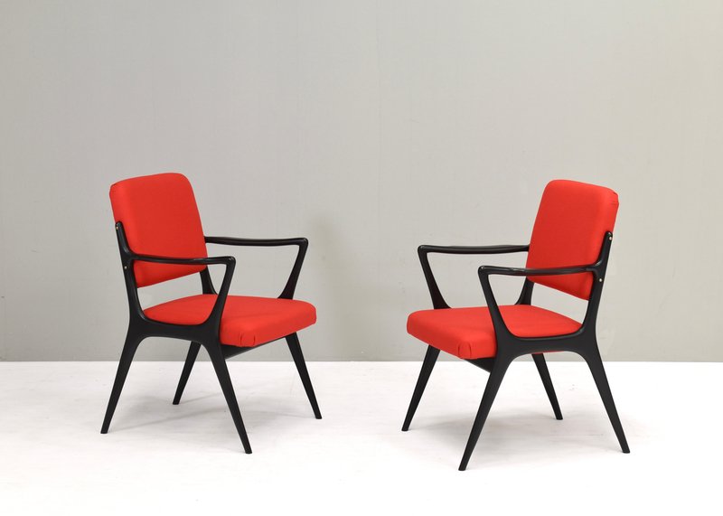 Key Features: Designer: Alfred Hendrickx Manufacturer: Belform Model: S5 armchairs Material: Black lacquered beech / Brass / Wool fabric Size in cm. WxDxH: 59x60x87 Seat height 43 / Arm height 46.5 cm Year: Circa 1958 Origin: Belgium Frame: Sculpted beech in refinished black lacquer Upholstery: Seen here in bold red wool fabric, reupholstered Design Style: Mid-Century Modern meets Atomic Age, with a touch of Art Deco geometry Design Highlights: Distinctive angular armrests and splayed legs create a dynamic, modern silhouette Elegant proportions and floating seat/backrest design showcase Hendrickx’s architectural sensibility Highly collectible and increasingly rare on the international vintage market