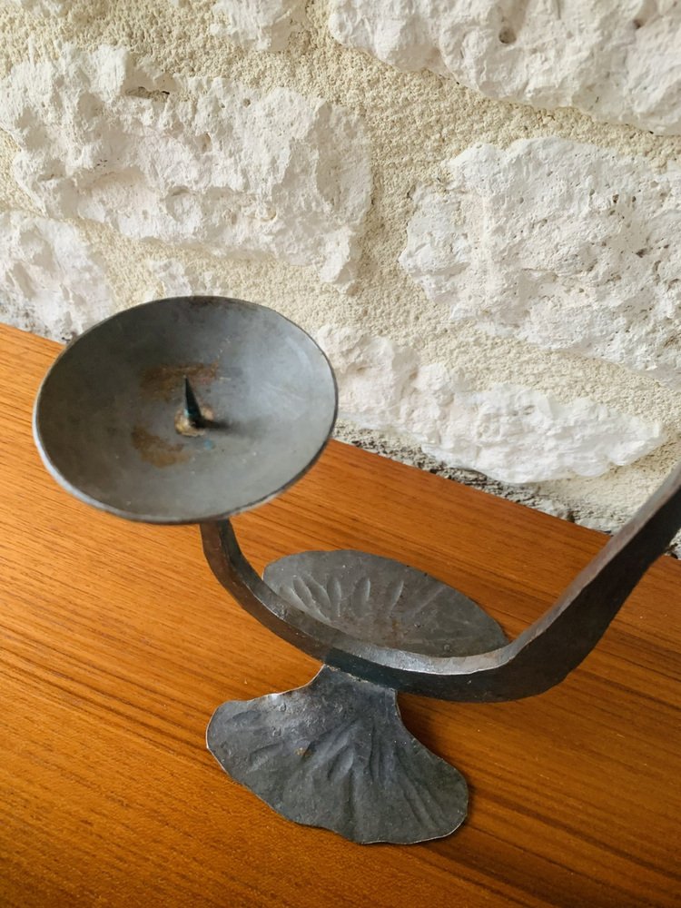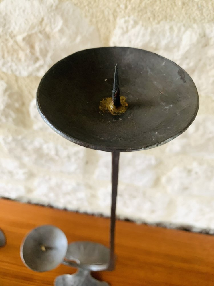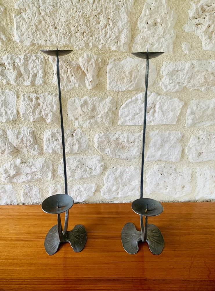 Pair of vintage, French, two-tiered, iron candlestick holders, resting on hammered bases with two feet