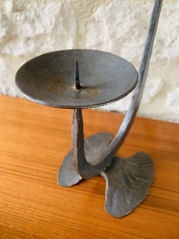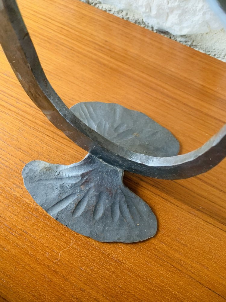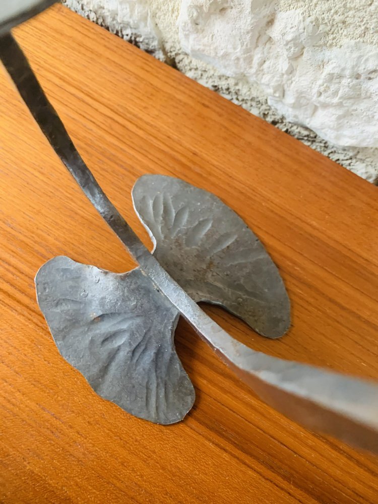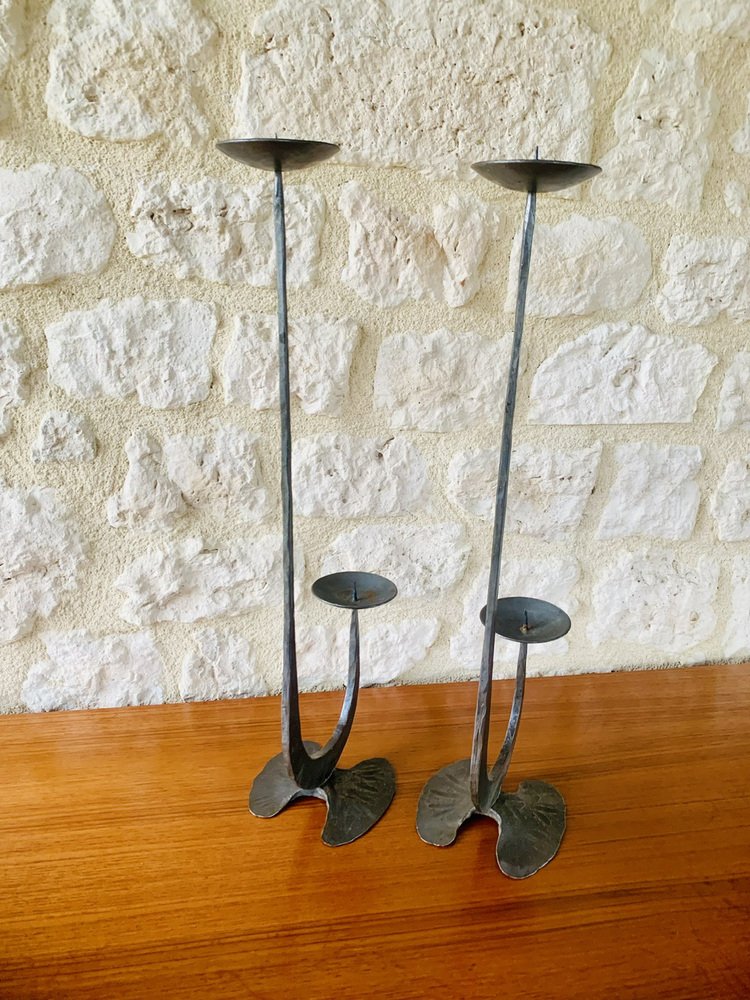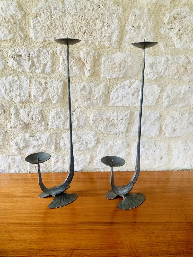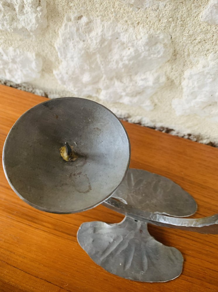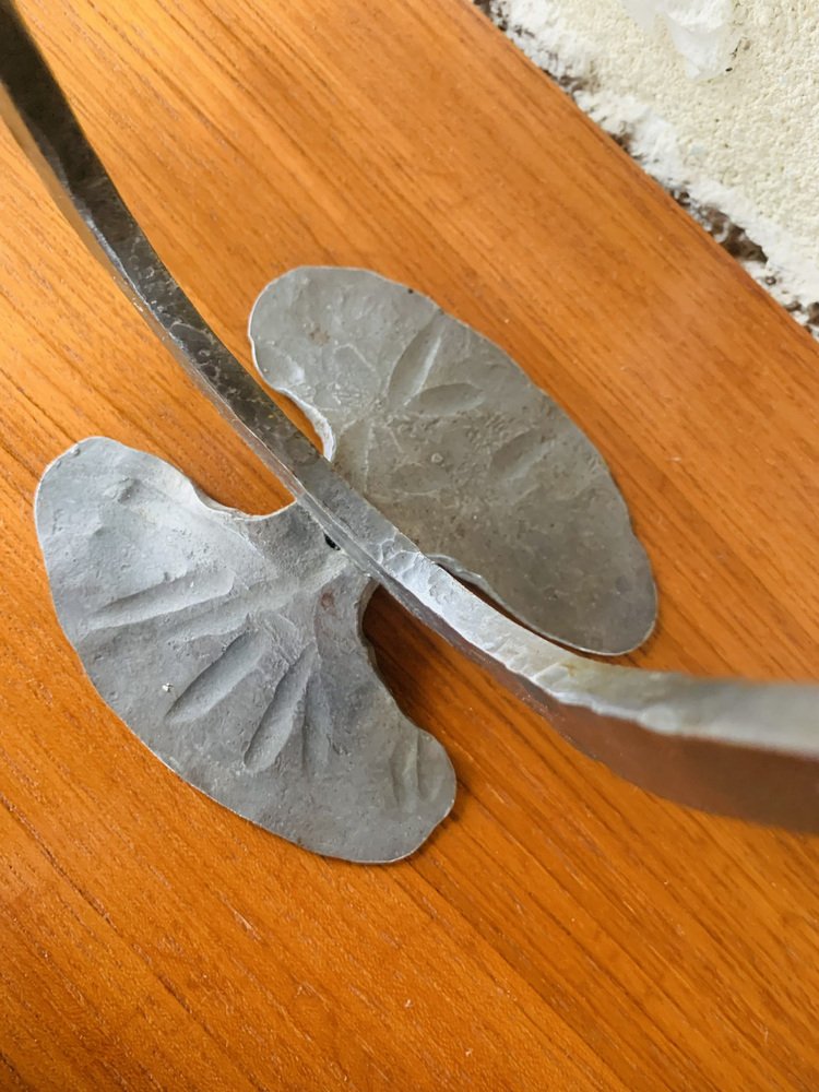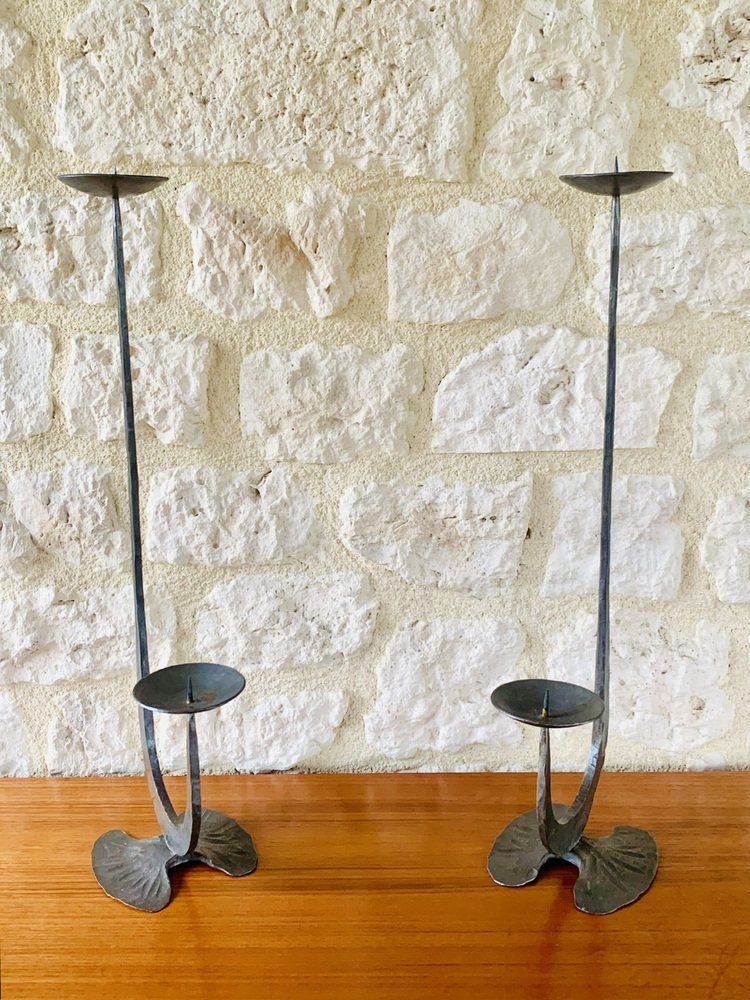 Questi bei candelieri hanno un bel design brutalista, leggermente martellato, a forma di "J", con due bracci ritorti a due livelli sotto ciascun portacandele, entrambi simili a ciotole o piattini poco profondi, con punte affilate al centro, e misurano circa 7,5-8 cm di diametro. Ogni base è composta da due piedini martellati in stile art nouveau, che ricordano le ali di una farfalla (vedi foto)