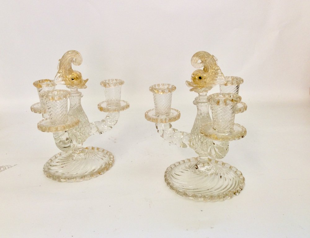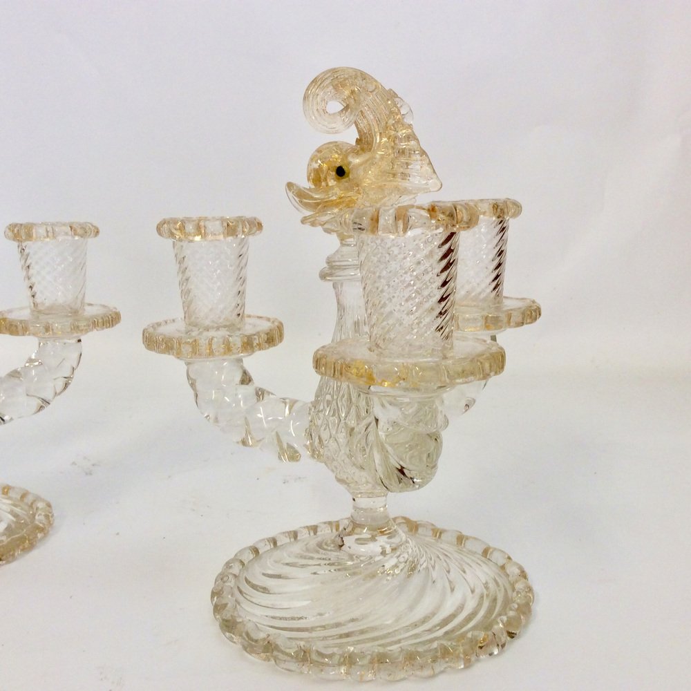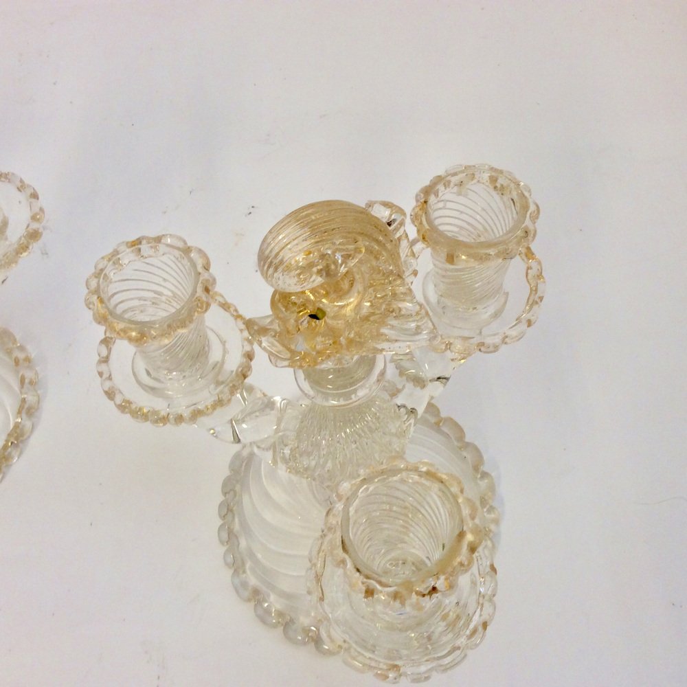 Portacandele in vetro di Murano decorato con foglie dorate di Barovier & Toso, anni '50, set di 2