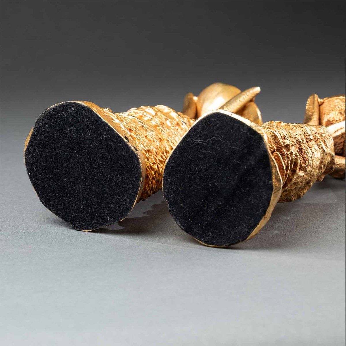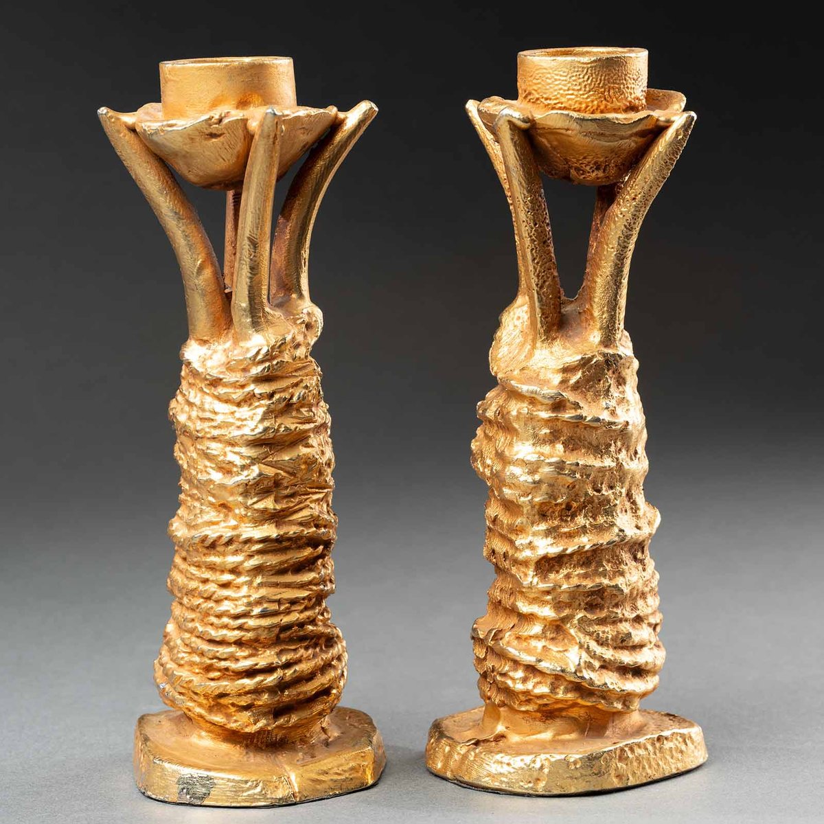 This remarkable pair of gilded cast aluminum candlesticks is a creation by Pierre Casenove for Fondica, produced in the 1990s. True sculptures in their own right, these pieces are distinguished by their organic forms and raw texture, evoking both nature and the sculptor's hand. Their hammered and irregular surface, enhanced by a luminous golden patina, subtly captures the light, giving each candlestick an almost architectural presence. Faithful to the Fondica spirit, this creation blends fine craftsmanship and contemporary design in a perfect balance of strength and elegance. These candlesticks embody the singular aesthetic of Pierre Casenove, an emblematic figure of French design in the 1980s and 90s, known for his sculptural forms and expressive materials.