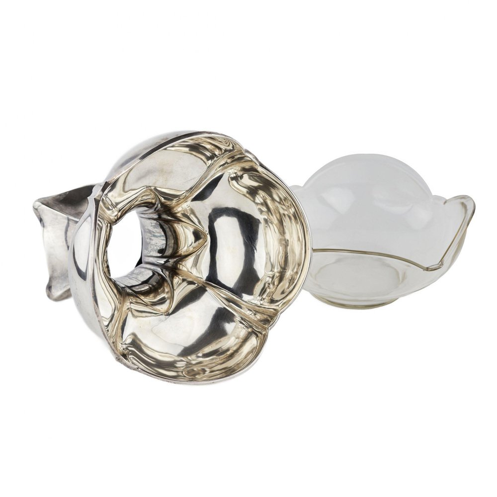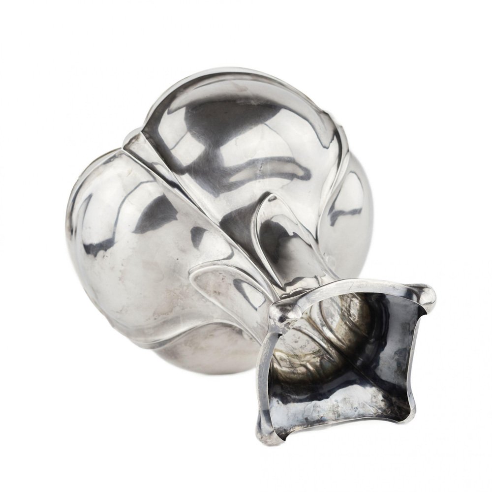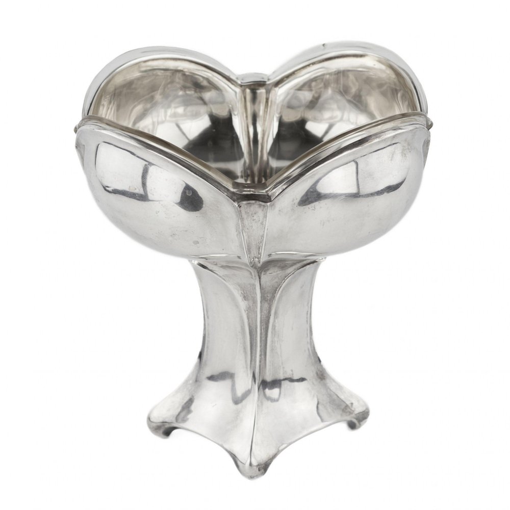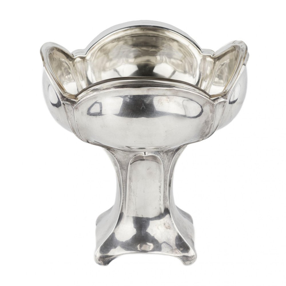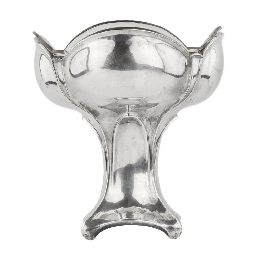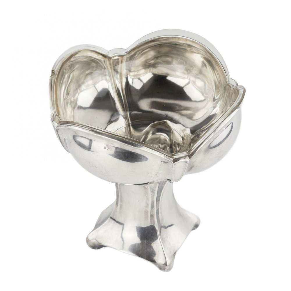 Fruttiera alta con una grande ciotola a forma di bocciolo di fiore dispiegato con quattro petali. La ciotola poggia su una graziosa gamba a quattro lati, che si allarga nella parte inferiore, e su quattro piccole gambe. Ogni lato della gamba è decorato con l'immagine in rilievo di una foglia di fiore. Il vaso è realizzato nello stile dell'Art Nouveau scandinavo. La produzione di vasi di questa forma era popolare tra gli artigiani finlandesi che lavoravano a San Pietroburgo tra la fine del XIX e il primo quarto del XX secolo. Nella cavità interna della ciotola è inserita una coppa in vetro fuso. Argento, timbro, sbalzo, vetro, fusione. Finlandia, Helsinki, 1910, laboratorio Hjalmar Fagerroos. Buono stato, patina naturale d'argento.