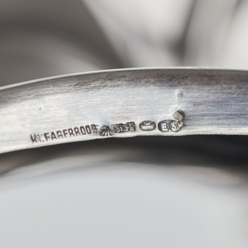 Marchi: marchio dell'officina H.Fagerroos in uno scudo rettangolare; marchio della Finlandia - corona; marchio d'argento 813 H, in uno scudo rettangolare; marchio dell'anno di fabbricazione E.5, in uno scudo ovale. Corrisponde al 1910. Altezza - 25,5 cm, diametro della coppa - 23,5 cm, peso del vaso - 700 g (senza vetro), peso del vaso con vetro - 1,47 kg.
