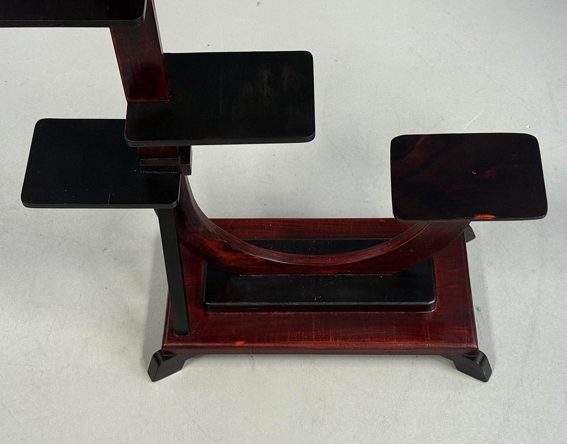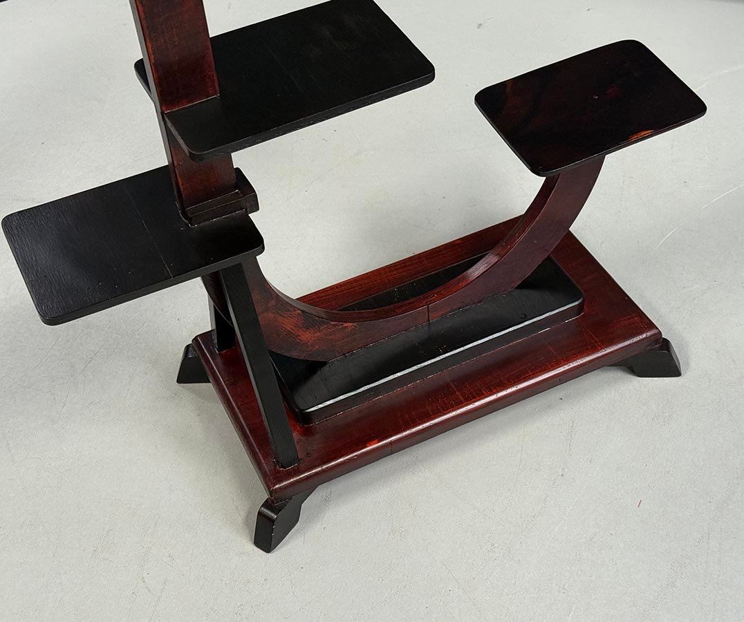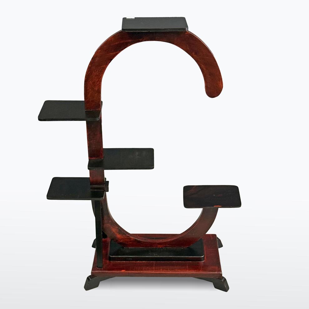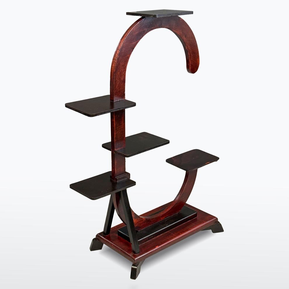 Piantana Art Déco, 1930 circa. La dinamica struttura ad arco presenta diverse piattaforme espositive a gradini, perfette per esporre più piante o oggetti decorativi. Il legno tinto scuro e la forma geometrica evidenziano l'estetica moderna del periodo Art Déco. Un bell'esempio di design tra le due guerre, che unisce funzionalità e valore decorativo.