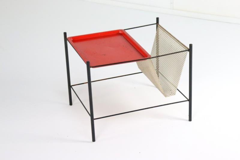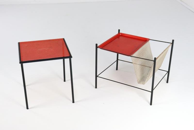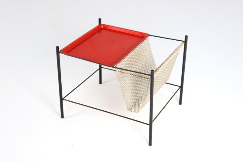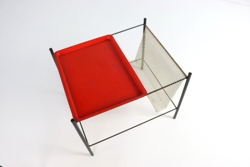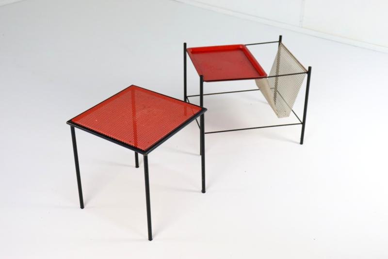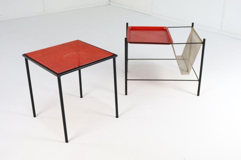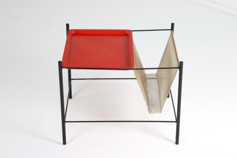 The Pilastro Gazette, magazine rack and side table were designed by Tjerk Reijenga for Pilastro in the late 1950s and was marketed until the early 1960s. These pieces are characterized by their clean lines and use of perforated metal, which both gives a modern look and is functional for storing magazines and other items. It is a very minimalist and modern / timeless design with metal frames and perforated surfaces. The side table has a solid red top with a fine mesh pattern, while the magazine rack has an open design with, among other things, two sloping surfaces that meet in the middle, and can thus serve as a magazine holder. The tray in red lacquered steel is loose and is therefore removable. There is 1 sheet included with this set. This set combines functionality with a sleek, minimalist design. Specifications: Country of origin: Netherlands Manufacturer: Pilastro Designer: Tjerk Reijenga Period: 1950s Magazine rack: Height: 35 cm Width: 45 cm Depth: 36.5 cm Side table: Height: 35 cm Width: 33 cm Depth: 33 cm This is a very rare Dutch Design item in an original used vintage condition with a characteristic beautiful patina, be sure to take a look at the photos for a complete picture.