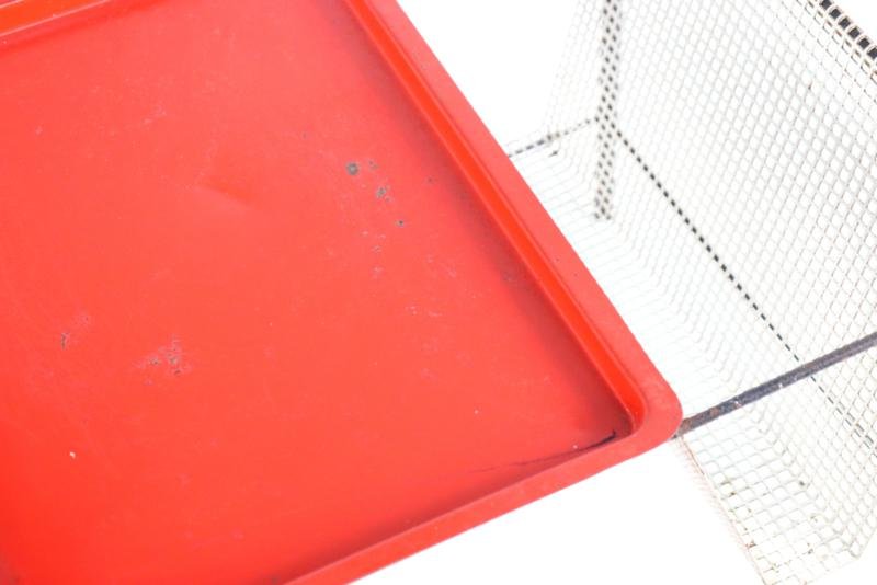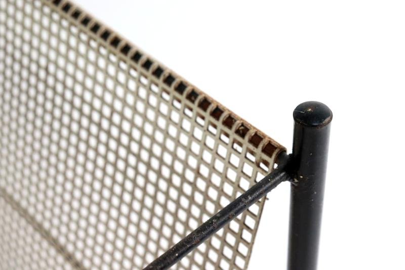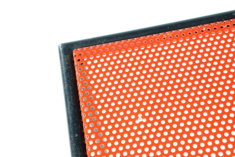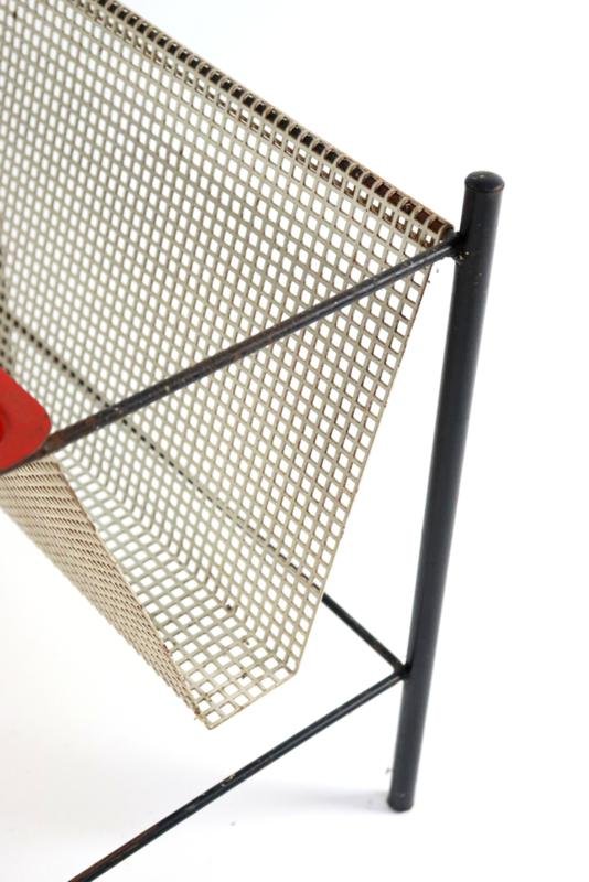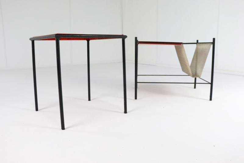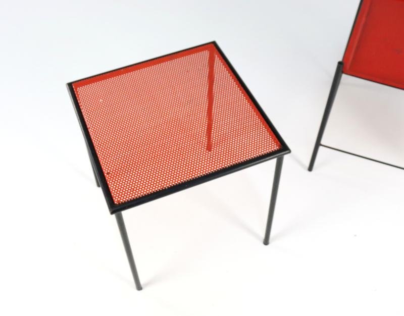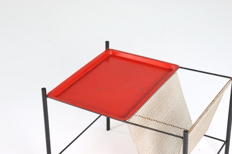 The Pilastro Gazette, magazine rack and side table were designed by Tjerk Reijenga for Pilastro in the late 1950s and was marketed until the early 1960s. These pieces are characterized by their clean lines and use of perforated metal, which both gives a modern look and is functional for storing magazines and other items. It is a very minimalist and modern / timeless design with metal frames and perforated surfaces. The side table has a solid red top with a fine mesh pattern, while the magazine rack has an open design with, among other things, two sloping surfaces that meet in the middle, and can thus serve as a magazine holder. The tray in red lacquered steel is loose and is therefore removable. There is 1 sheet included with this set. This set combines functionality with a sleek, minimalist design. Specifications: Country of origin: Netherlands Manufacturer: Pilastro Designer: Tjerk Reijenga Period: 1950s Magazine rack: Height: 35 cm Width: 45 cm Depth: 36.5 cm Side table: Height: 35 cm Width: 33 cm Depth: 33 cm This is a very rare Dutch Design item in an original used vintage condition with a characteristic beautiful patina, be sure to take a look at the photos for a complete picture.