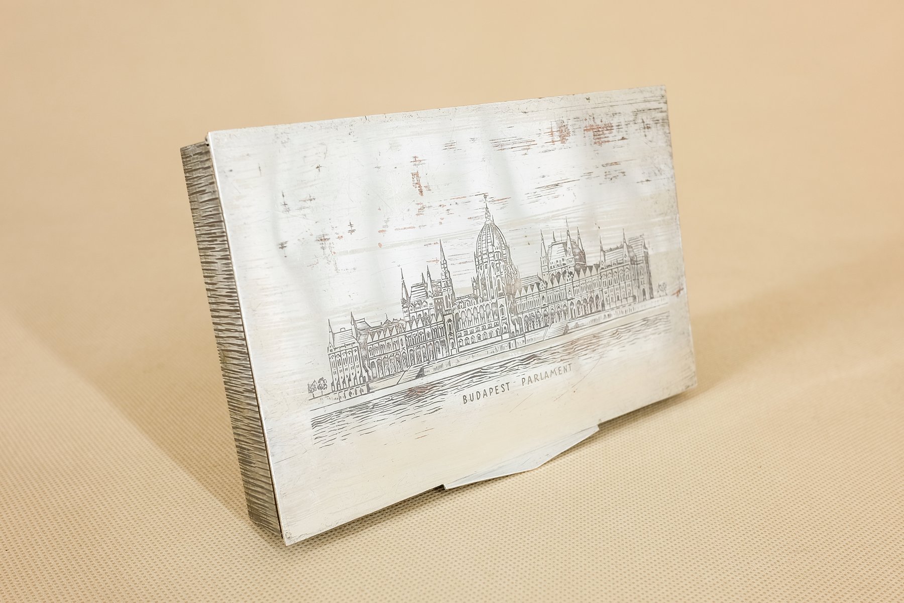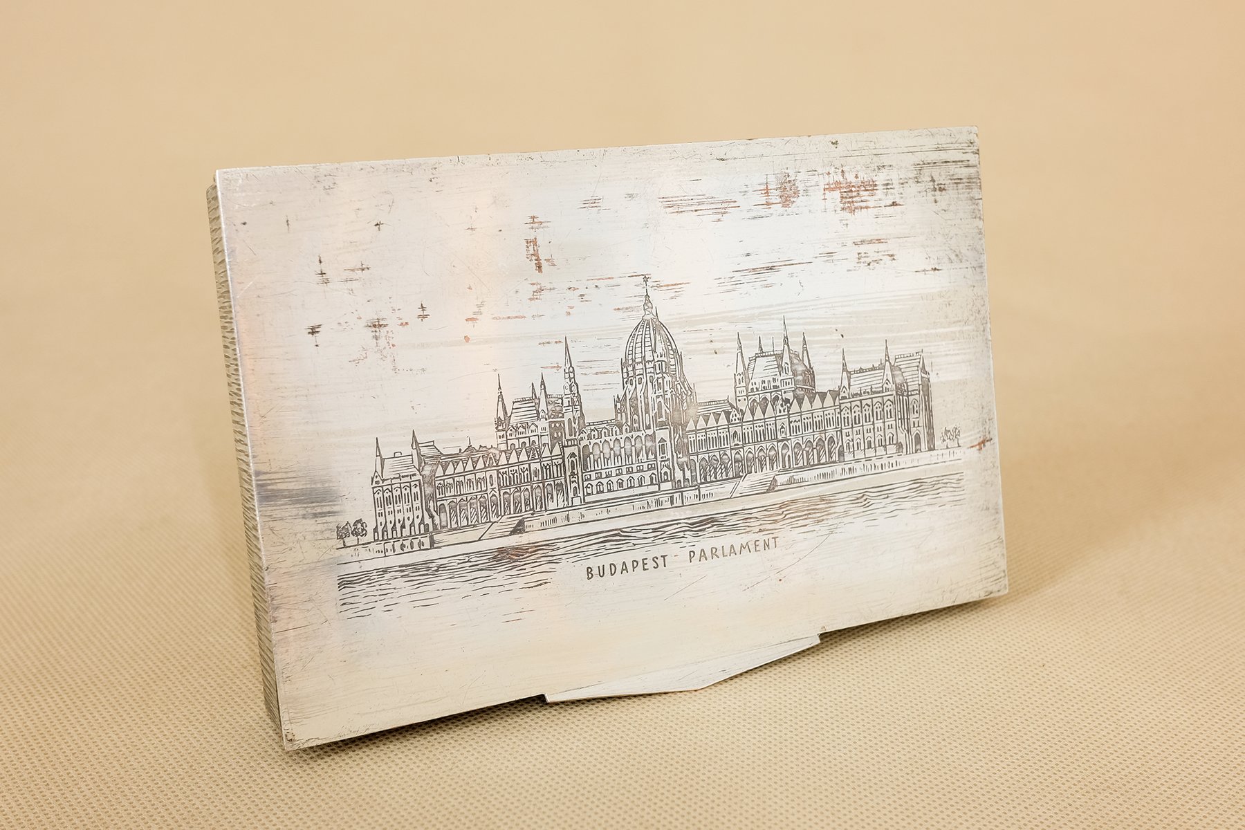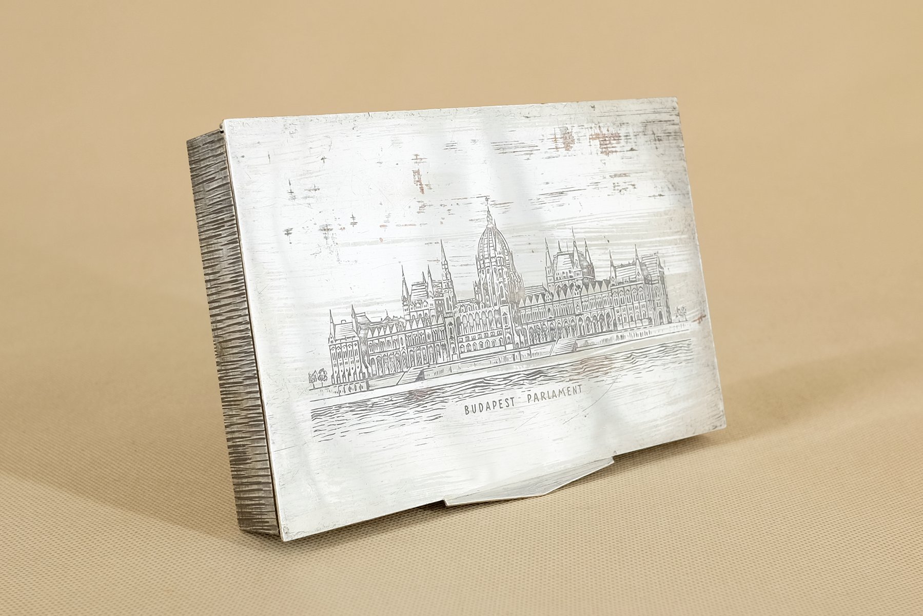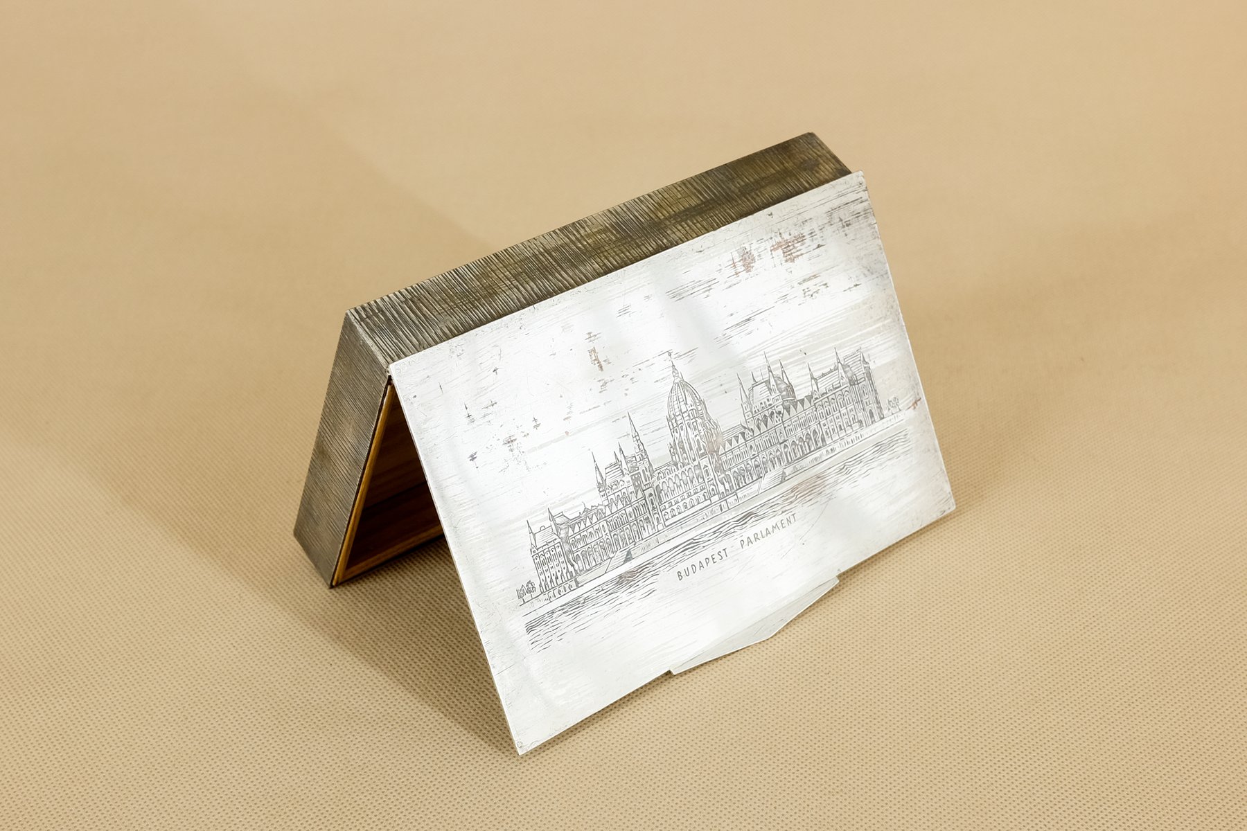 Portasigarette Mid-Century in metallo e legno di Budapest Parliament