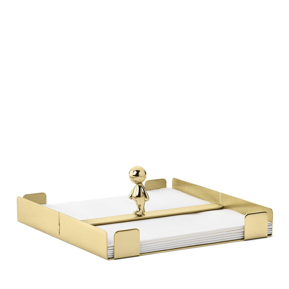 Part of the Omini Collection, this brass napkin tray is distinguished for its geometric silhouette and whimsical design. The square frame is composed of two tall sides connected by a long, flat rod, whose height is adjustable according to the quantity of napkins in the tray. A small figurine of a man stands atop the rod, resembling a tightrope walker suspended in air. An everyday kitchen item reinvented with creative flair, this innovative piece will transform any modern kitchen.