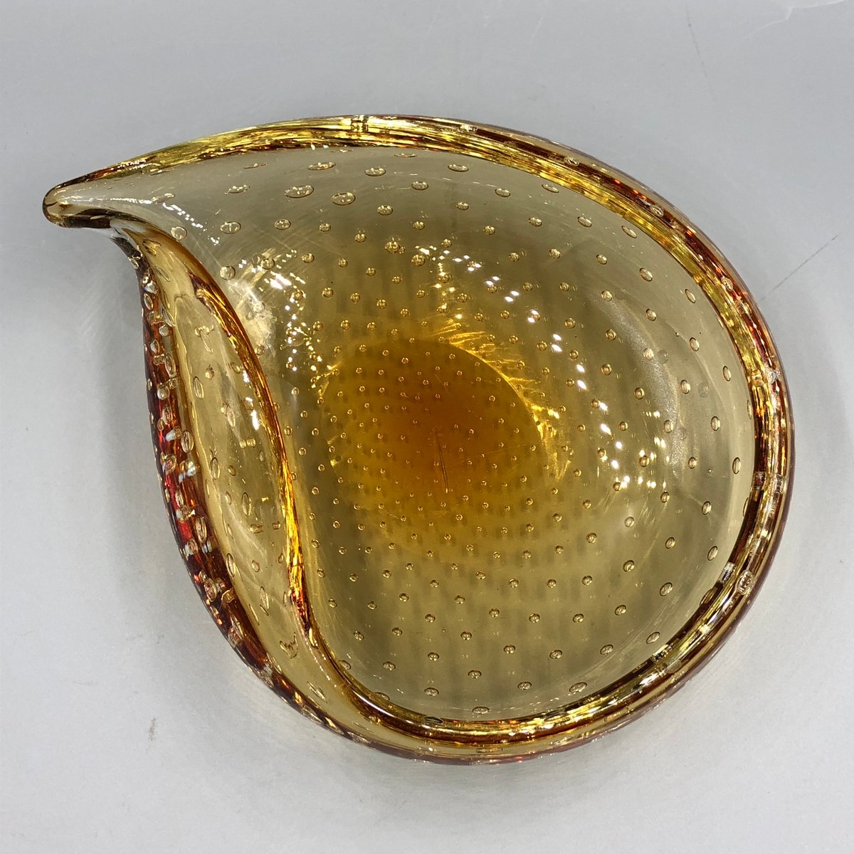 Questo elegante posacenere in vetro di Murano in stile bullicante è un esempio unico della squisita maestria dei famosi vetrai veneziani. Si ritiene che sia stato realizzato a metà del XX secolo e incarna l'estetica classica del design della metà del secolo, nota per l'amore per le forme organiche e i materiali pregiati.