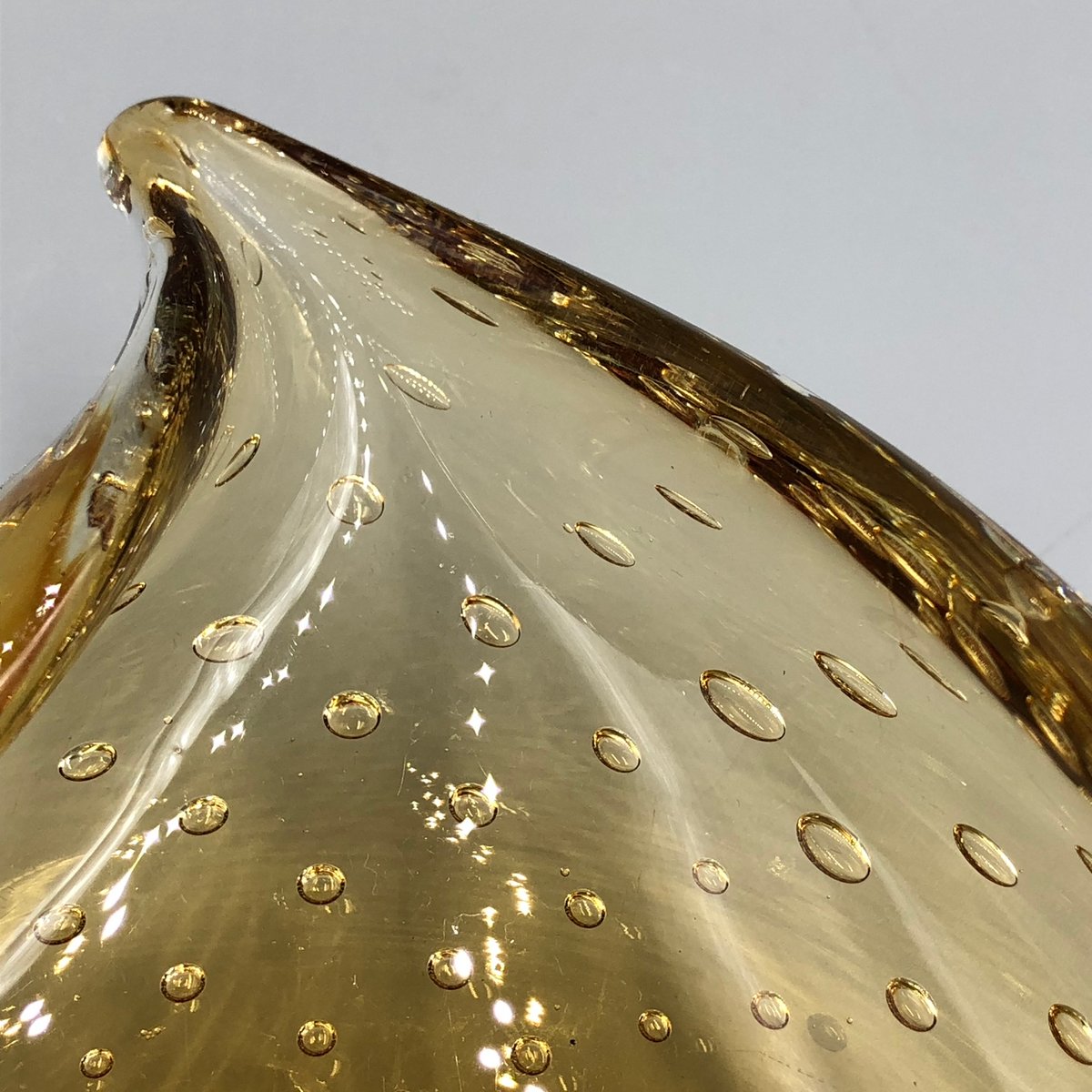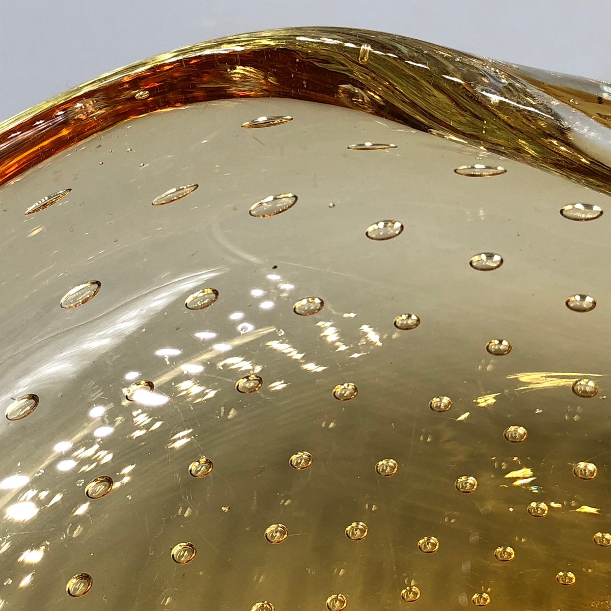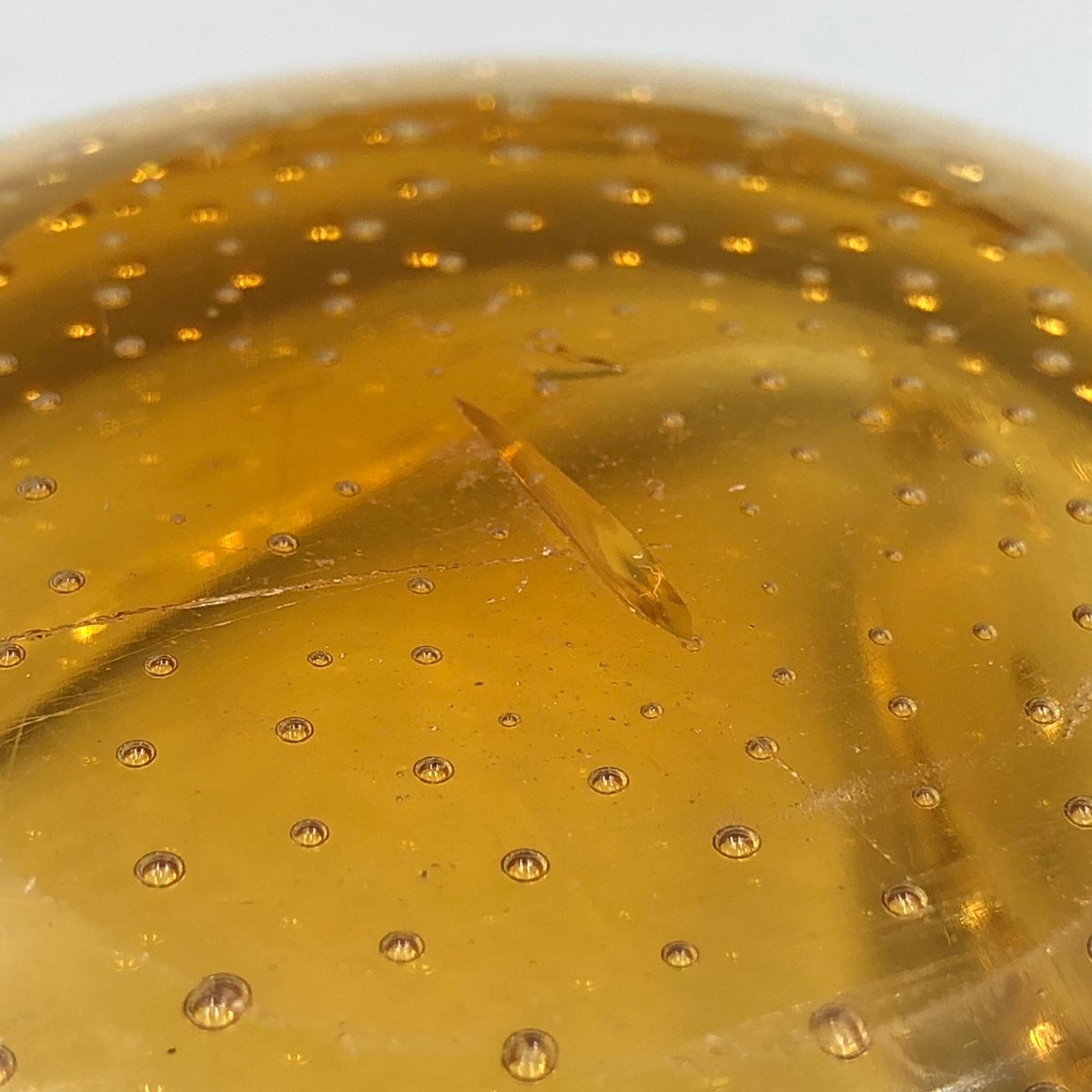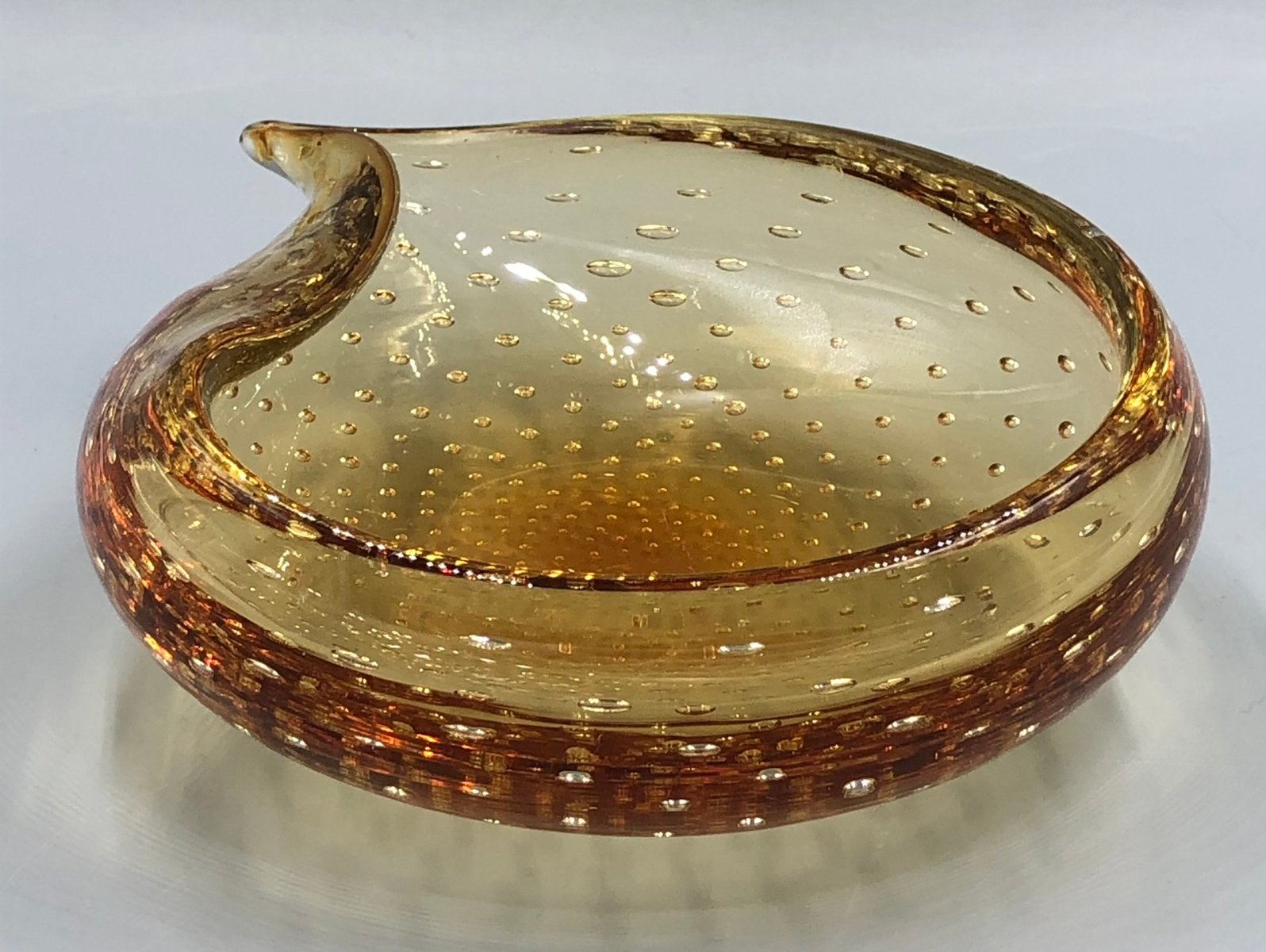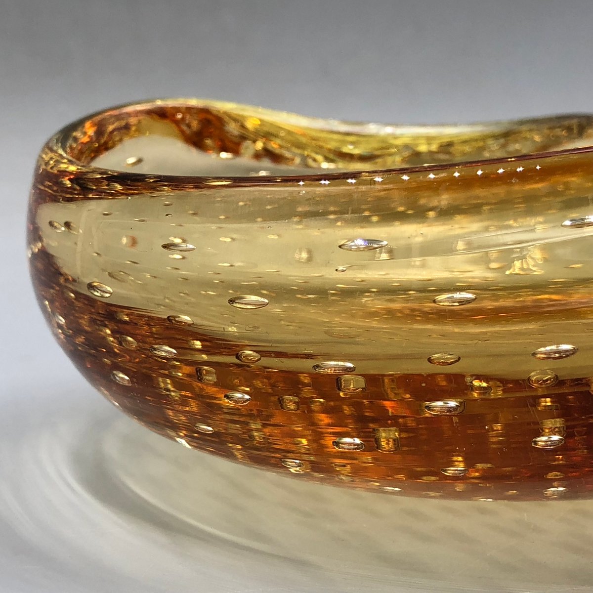 The glass has a warm, amber-colored tint, which gives the piece a particularly elegant and timeless look. The defining feature of this design is the bullicante pattern: small, perfectly placed air bubbles trapped at even intervals within the glass. This technique gives the ashtray a fascinating visual depth and a special feel.