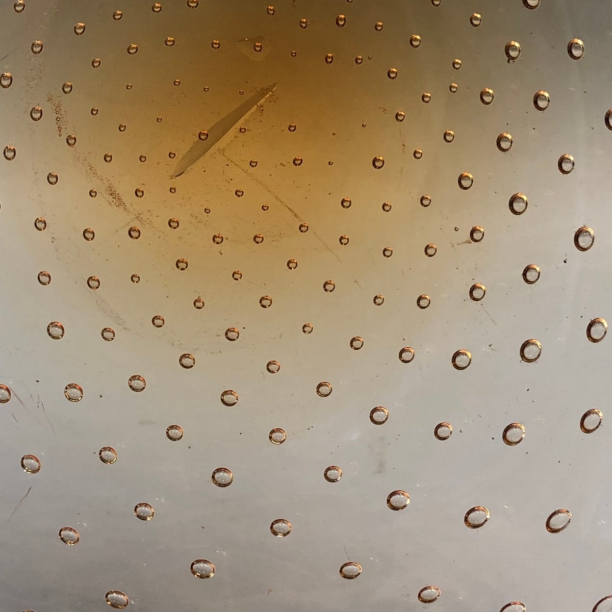 Il vetro ha una tonalità calda e ambrata, che conferisce al pezzo un aspetto particolarmente elegante e senza tempo. La caratteristica principale di questo design è il motivo bullicante: piccole bolle d'aria perfettamente posizionate e intrappolate a intervalli regolari nel vetro. Questa tecnica conferisce al posacenere un'affascinante profondità visiva e una sensazione speciale.