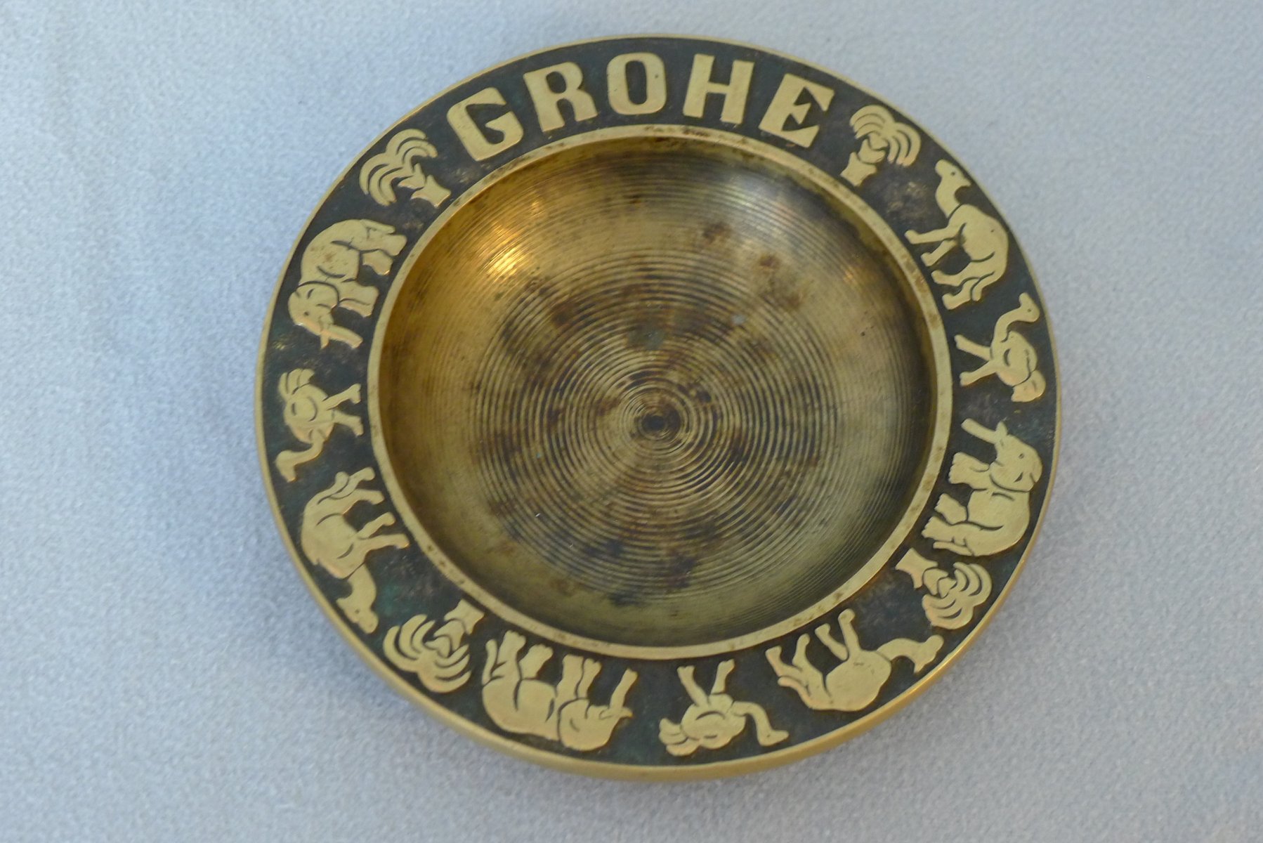 Posacenere in ottone bronzato. Rilievo circolare con raffigurazioni di elefante, struzzo, cammello e palma, e la scritta ''Grohe''.