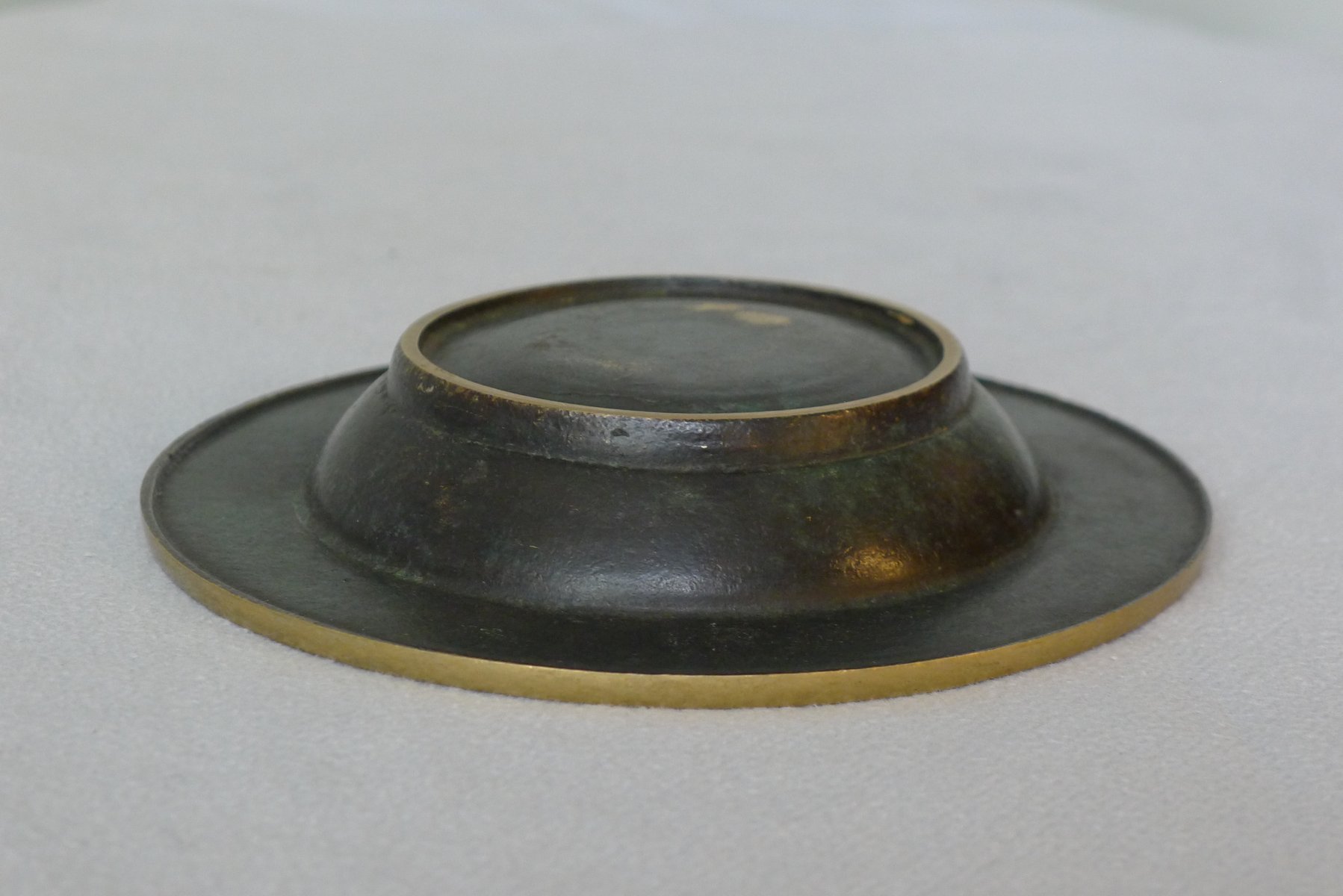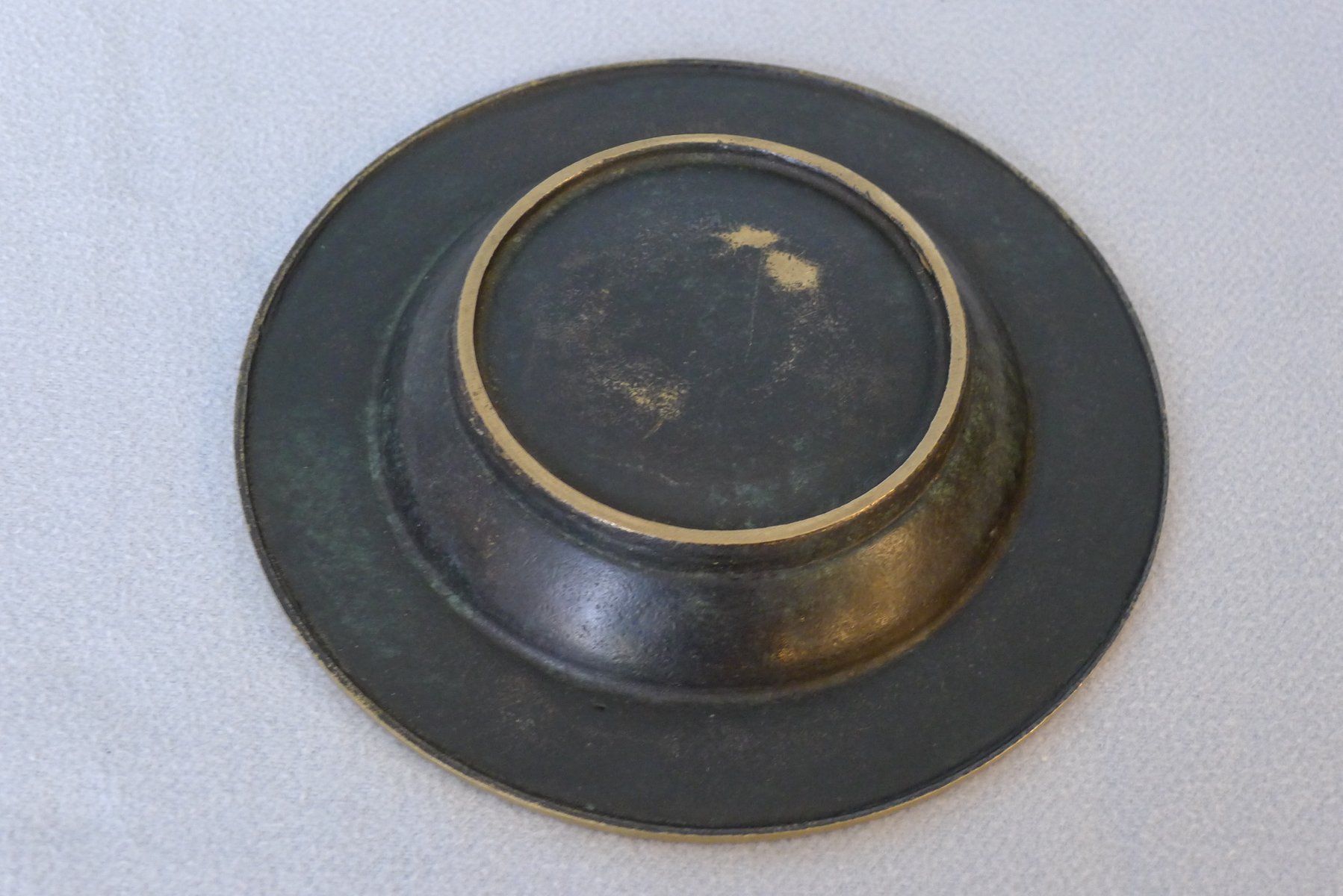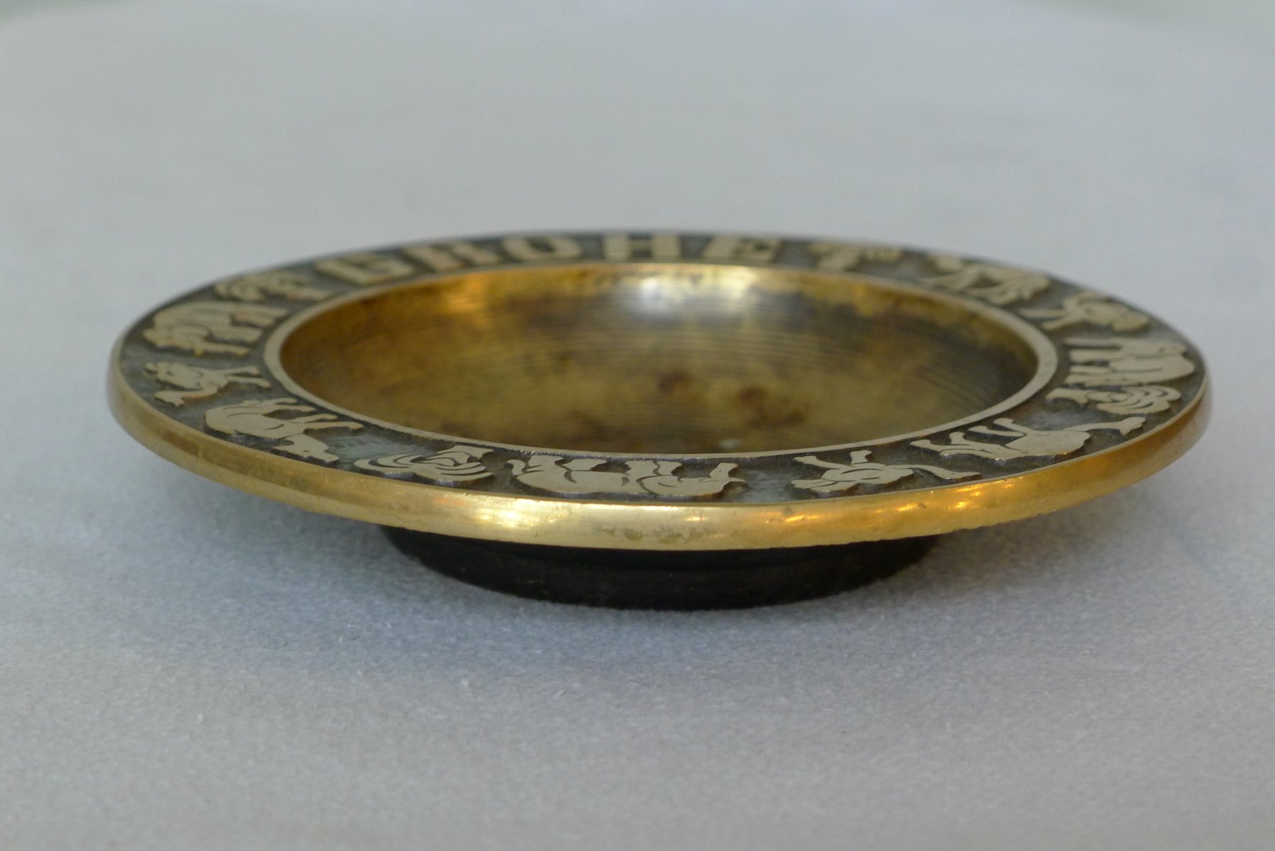 Ashtray made of bronzed brass. On the outer rim embossed relief with depictions of elephants, ostriches, dromedaries and palm trees, as well as the name ''GROHE''.