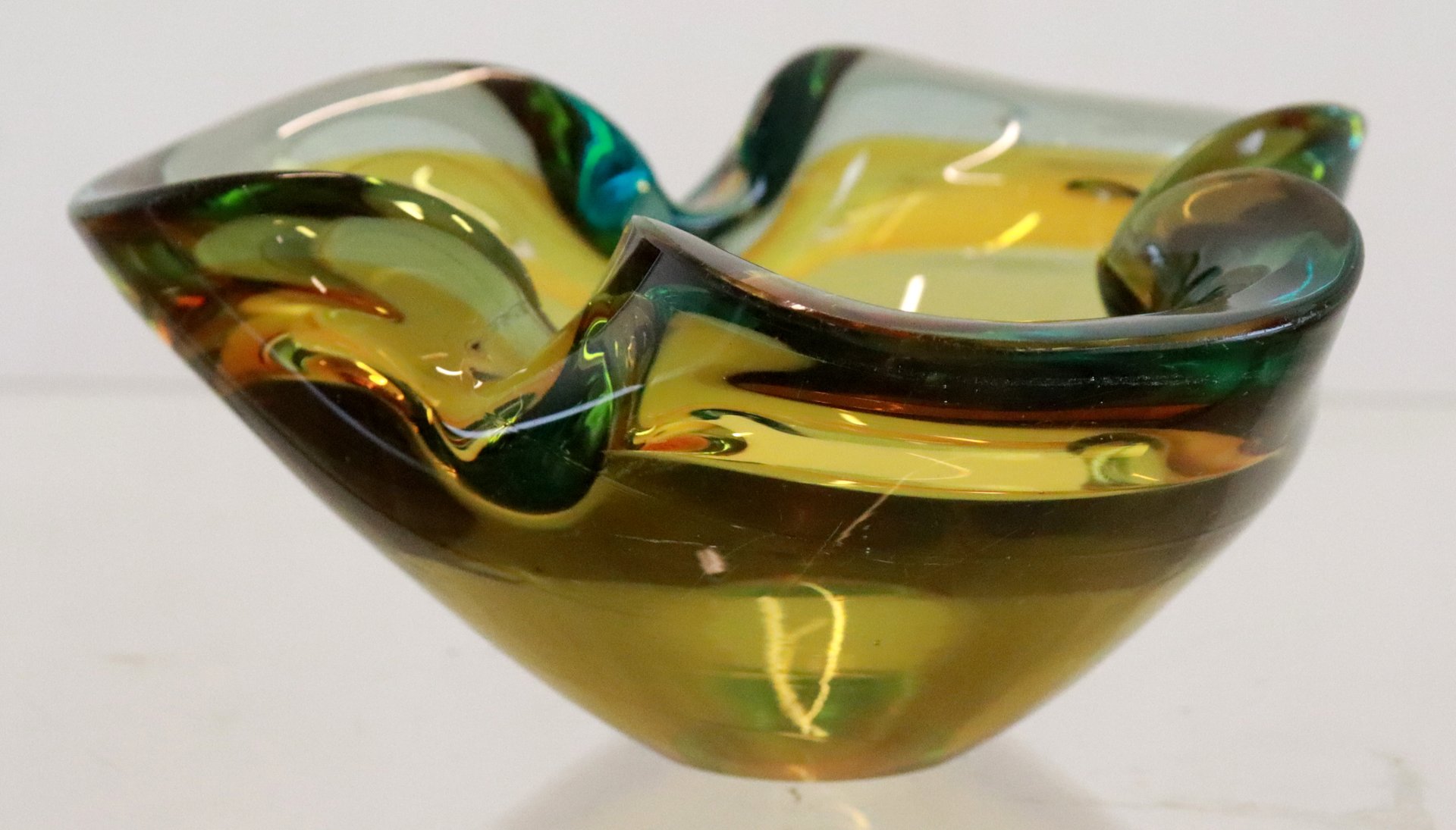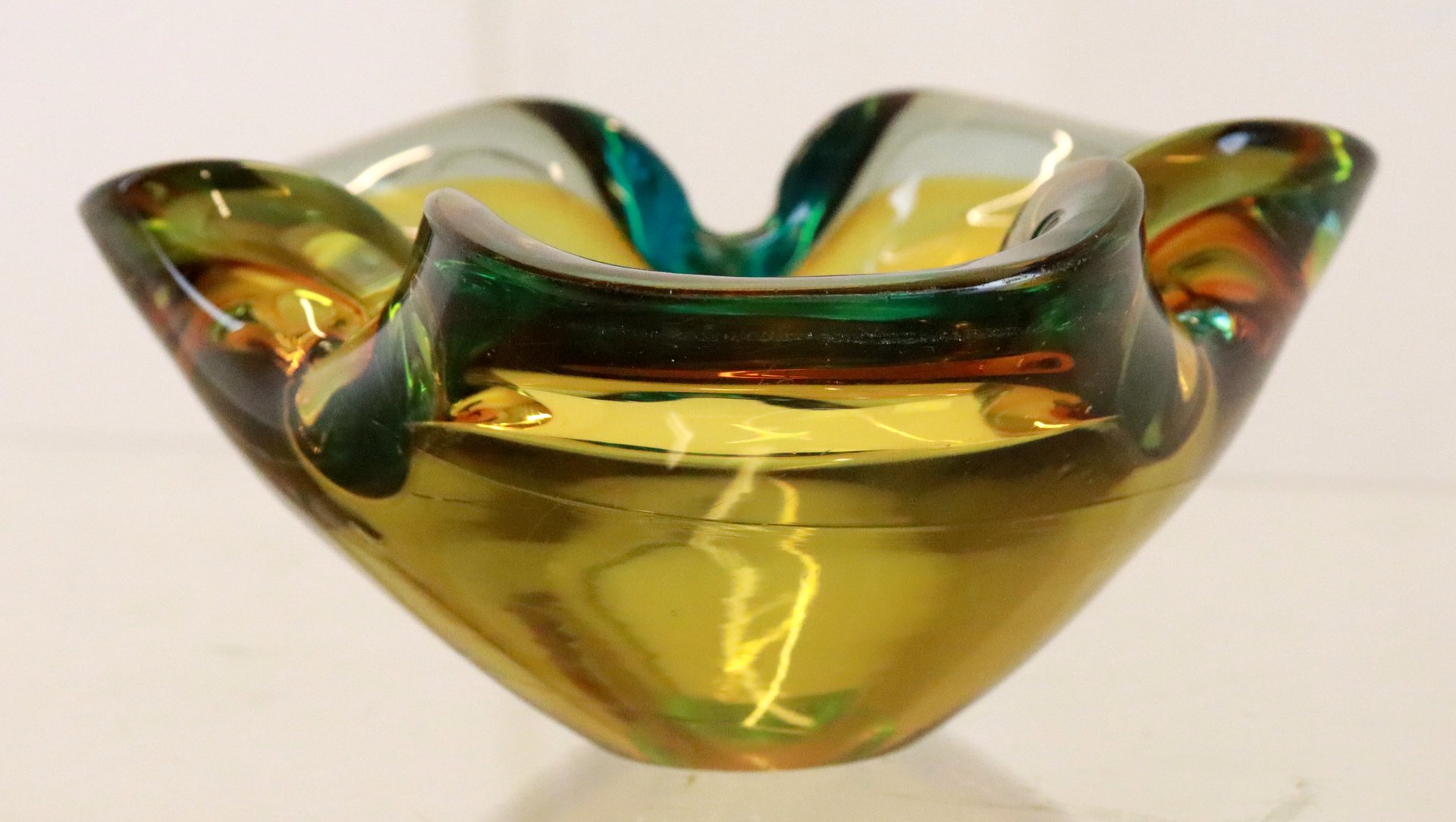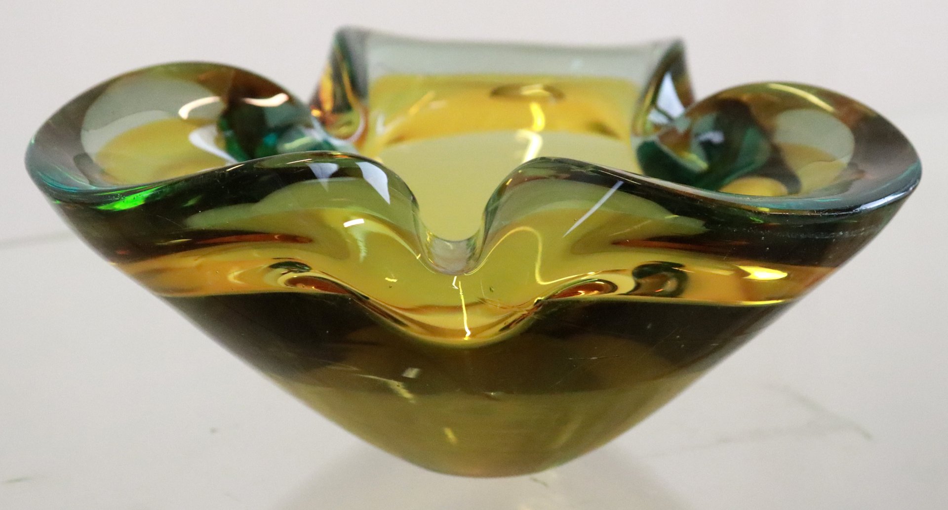 from the 70s, this very heavily executed "ashtray" is made of beautiful Murano glass. Very thick, beautifully blown and shaped glass with a very nice combination of colors. If you look from the side it looks yellow, if you look from above, you also discover green / petrol -like colors, a wonderful spectacle. Very decorative in the cupboard or on a beautiful piece of furniture. See the detailed photo, hardly to be called disturbing in daily life. Diameter: 17 cm height: 8 cm