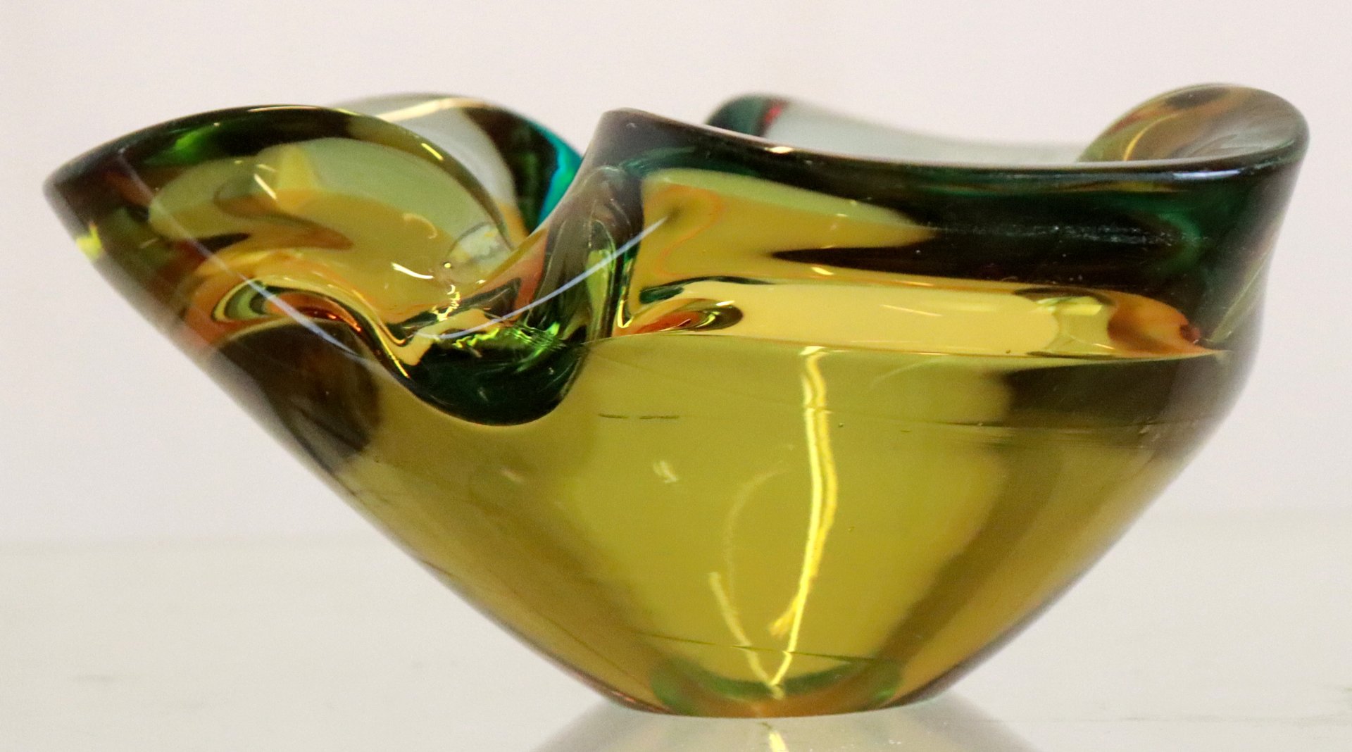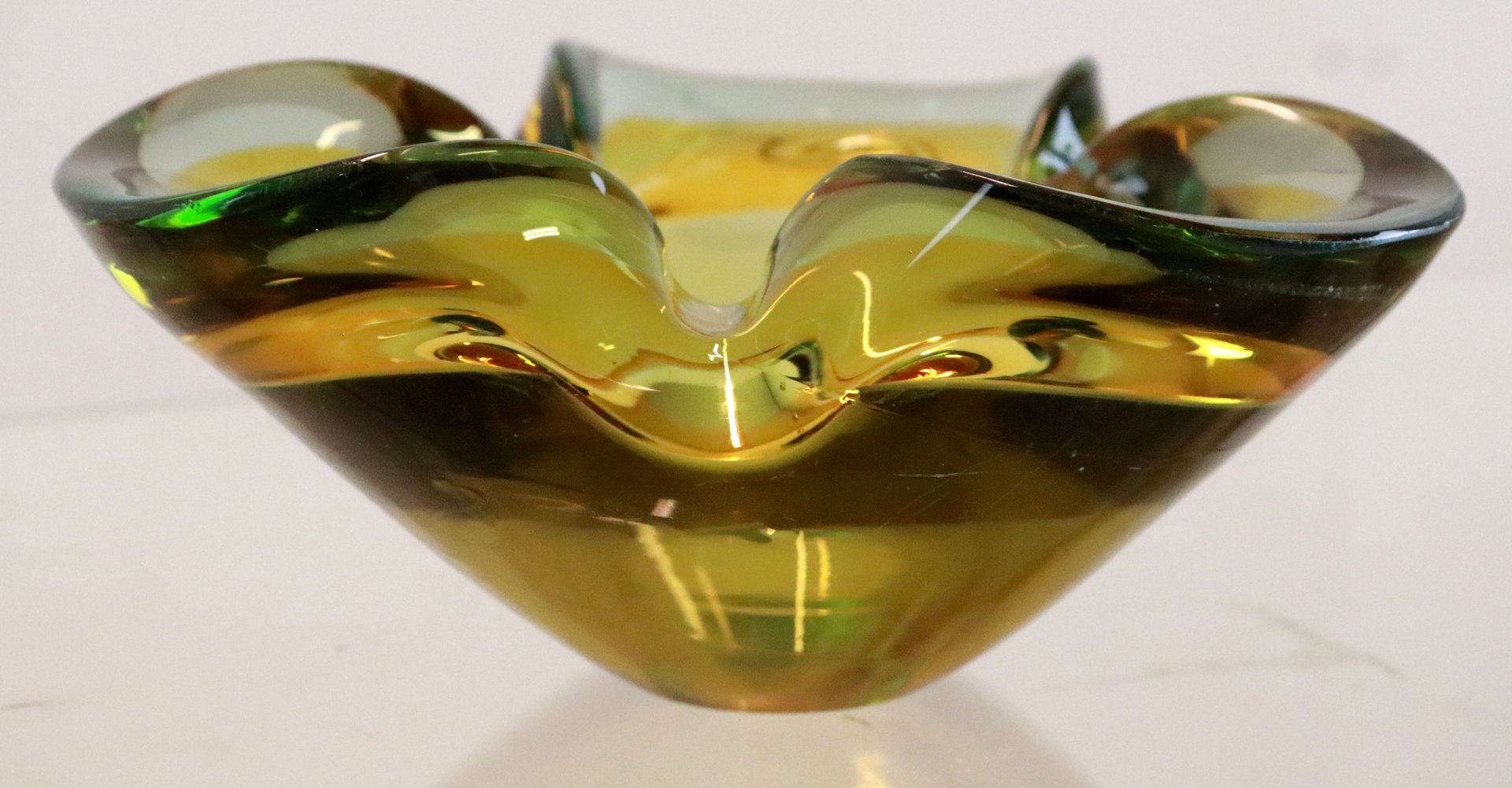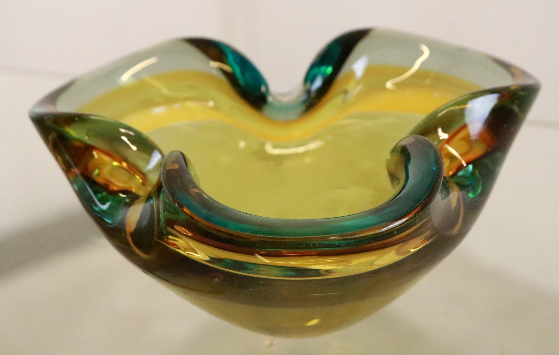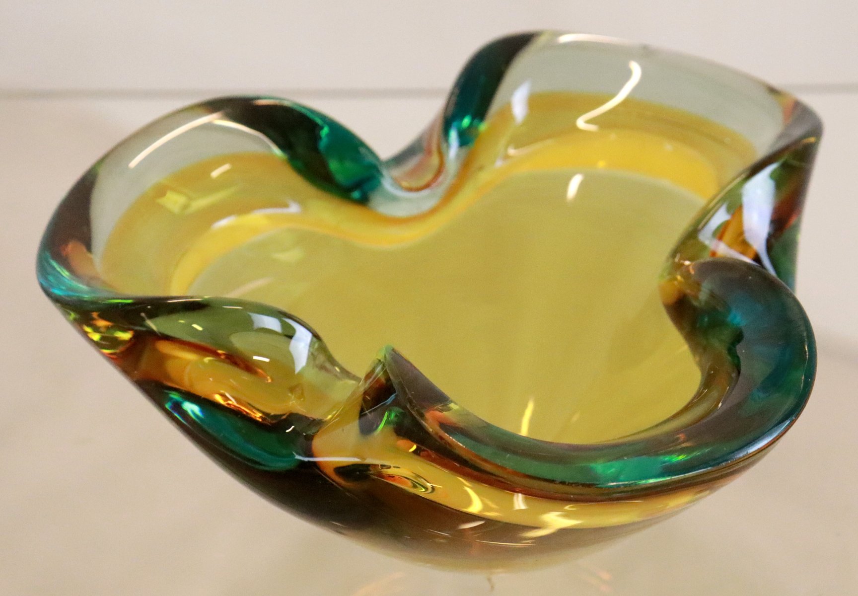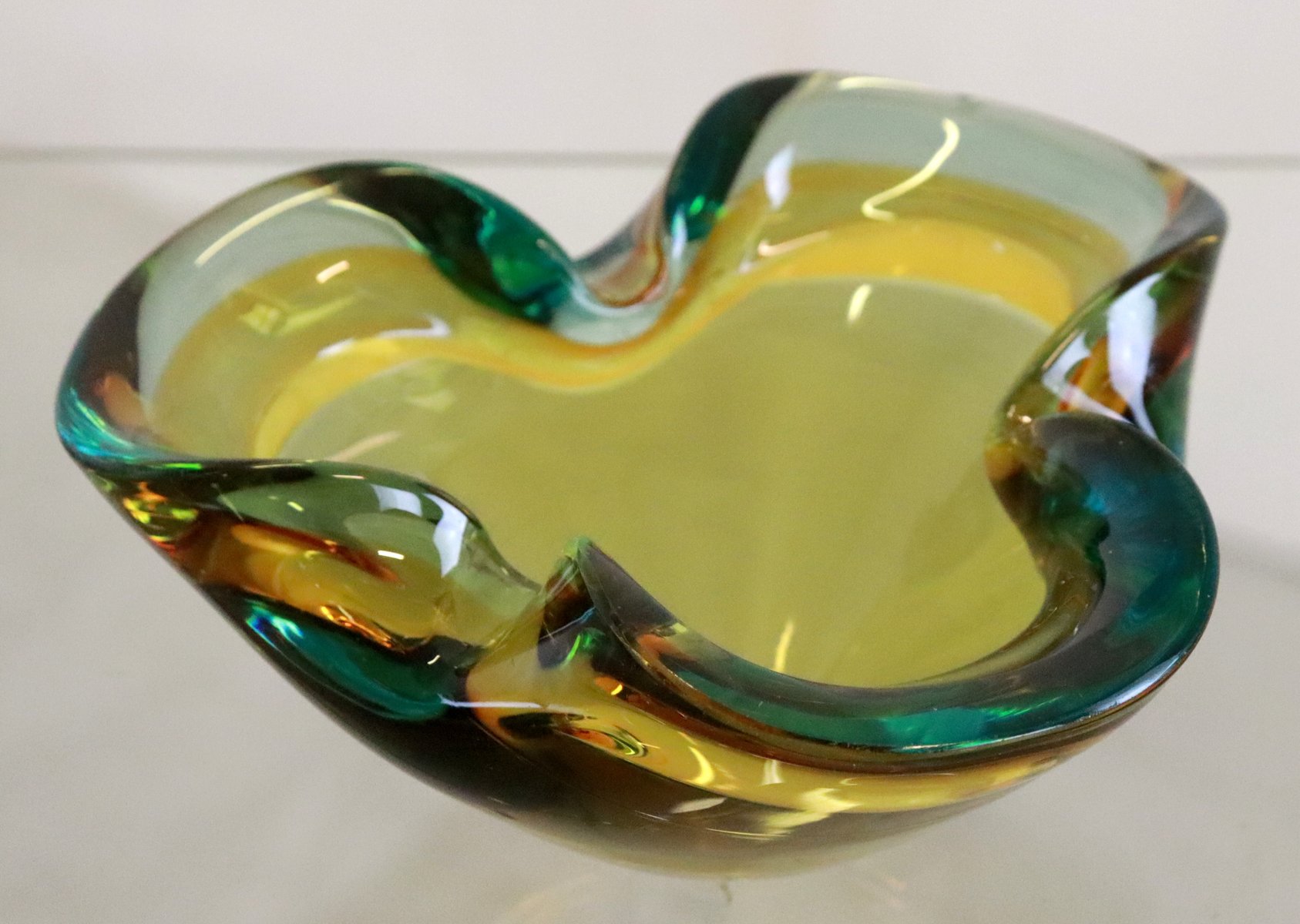 degli anni '70, questo "posacenere" molto ben eseguito è realizzato in un bellissimo vetro di Murano. Vetro molto spesso, ben soffiato e modellato, con una bella combinazione di colori. Se lo si guarda di lato sembra giallo, se lo si guarda dall'alto si scoprono anche colori simili al verde/benzina, uno spettacolo meraviglioso. Molto decorativo nella credenza o su un bel mobile. Vedere la foto dettagliata, difficilmente si può dire che disturba nella vita quotidiana. Diametro: 17 cm Altezza: 8 cm