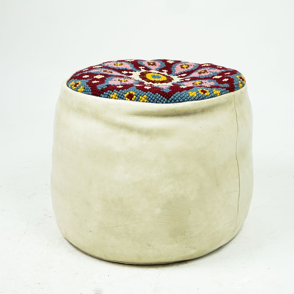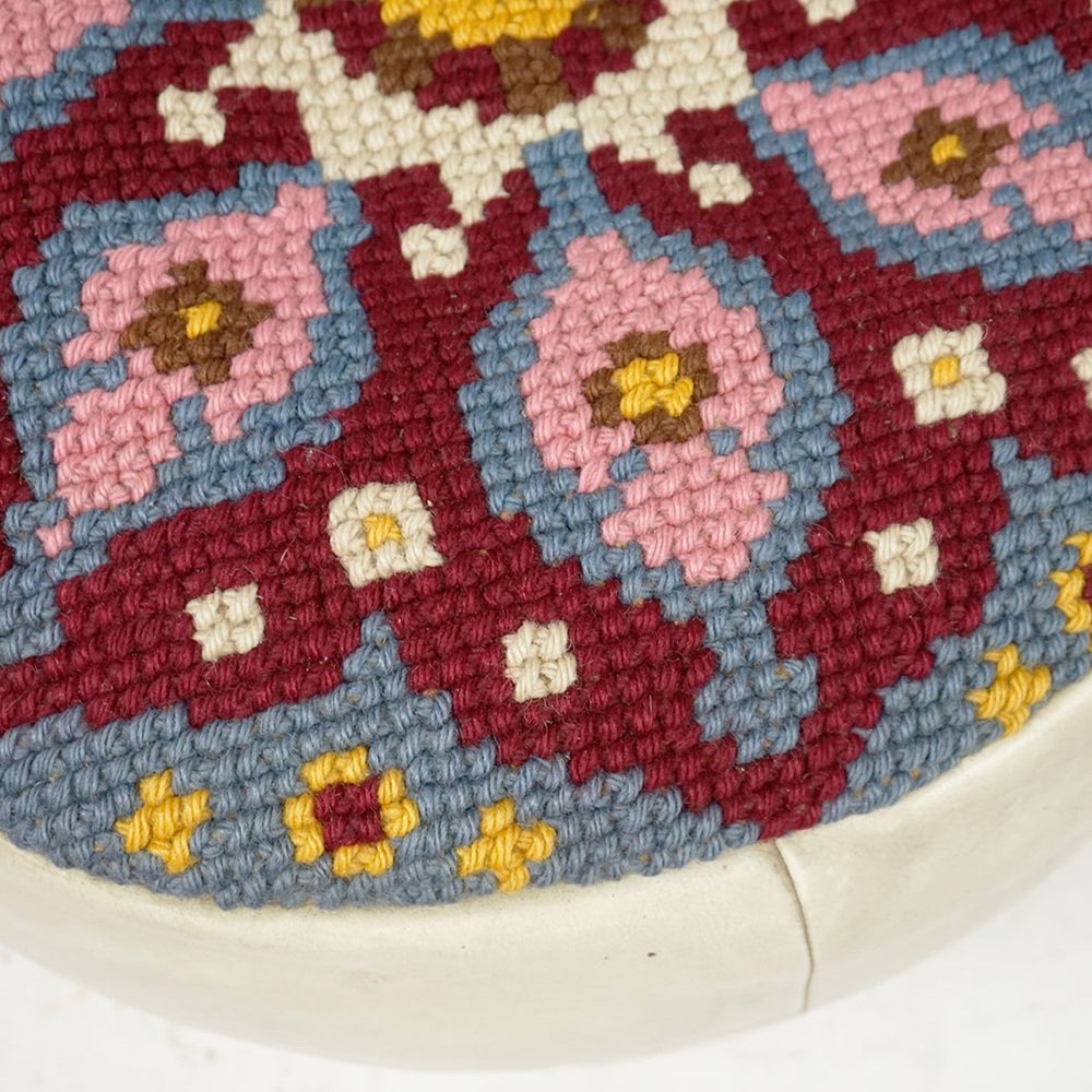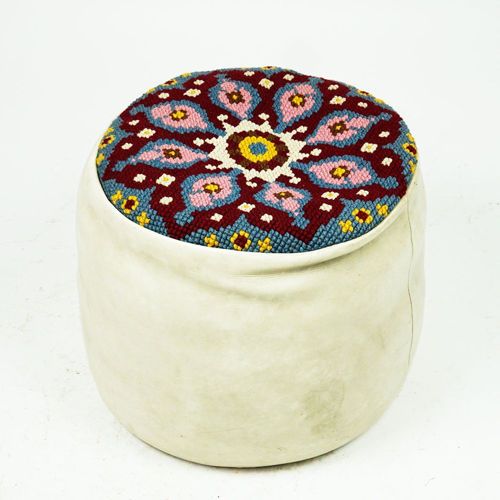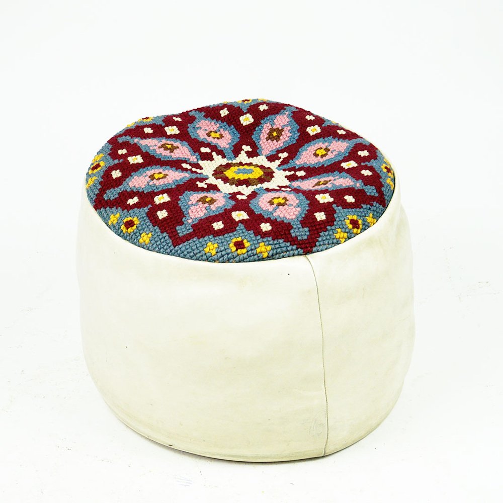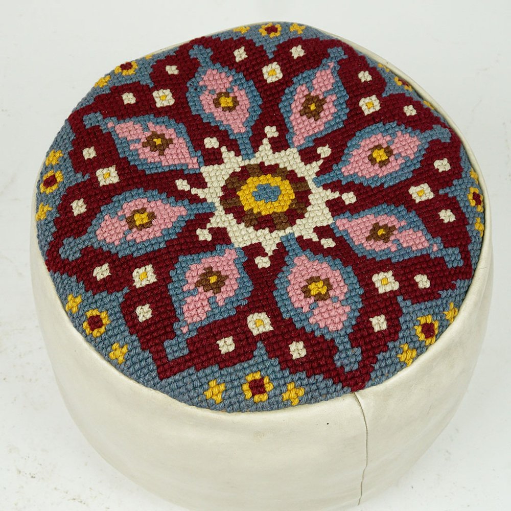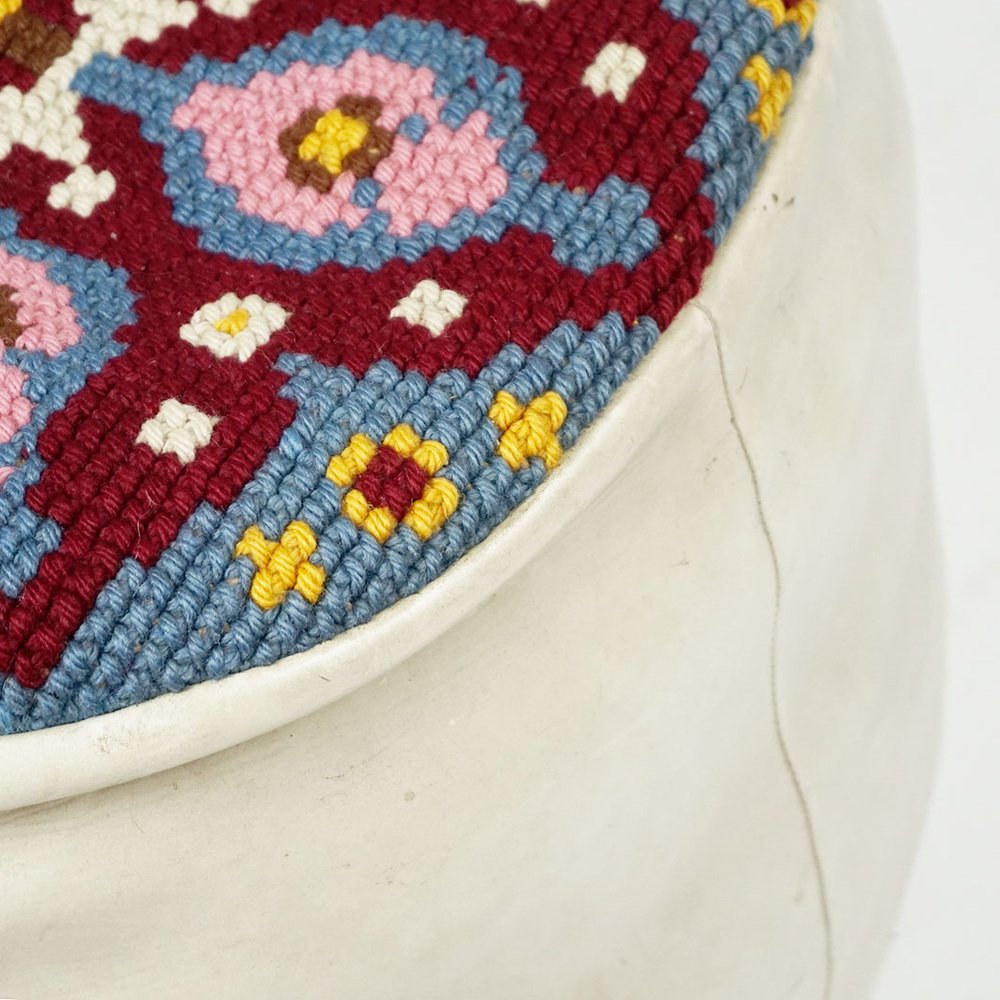 Questo affascinante pouf circolare in pelle bianca è stato progettato e prodotto negli anni '60, probabilmente in Francia. È realizzato in pelle bianca di prima qualità e ha una seduta ricamata a colori con ornamenti gialli, bianchi, rosa, bordeaux e blu. Le condizioni sono quelle originali dell'epoca, senza danni, con qualche segno di usura dovuto all'età e pronto all'uso. Sarà un perfetto highlight per i vostri interni in stile Midcentury Modern anni '60.