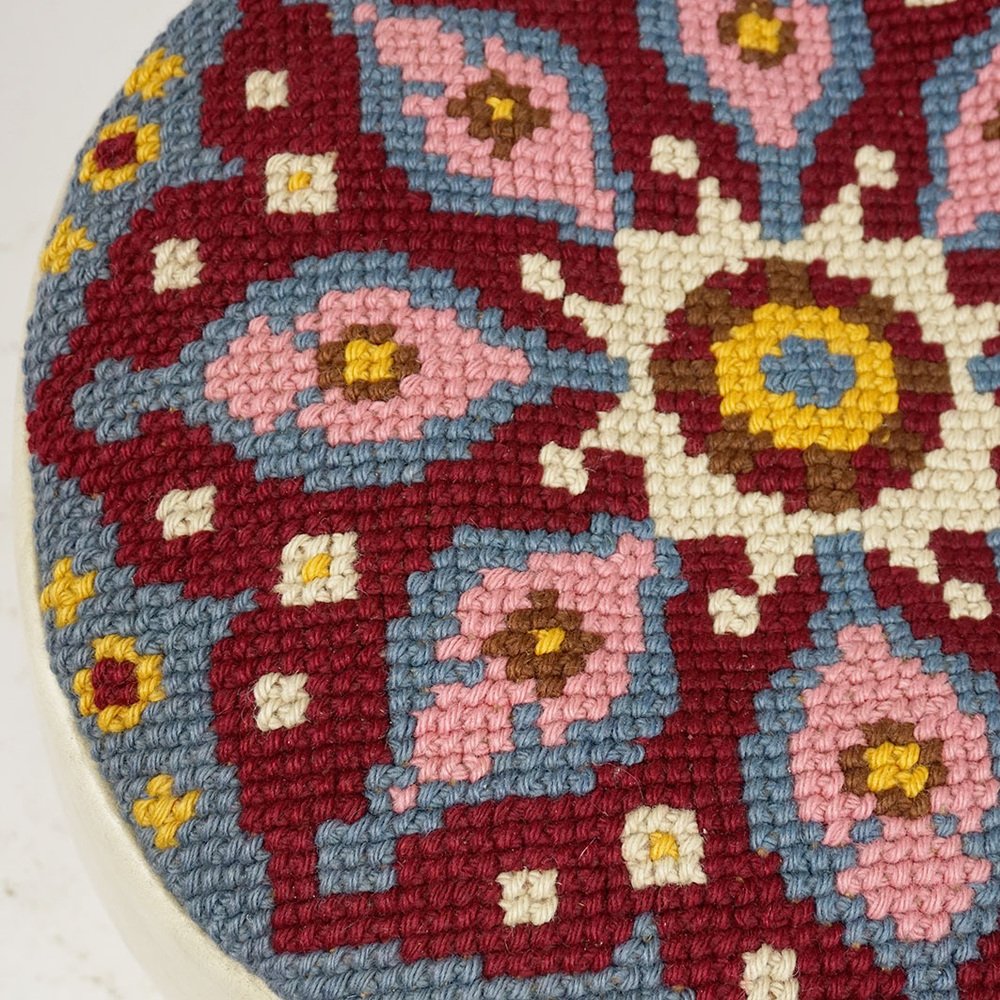 This charming white circular leather pouf has been designed and manufactured in the 1960s, probably in France. It is made of top quality white leather and has a colourful embroidered seat with yellow, white, pink, bordeaux and blue ornaments. The condition is original vintage without damages, some wear due to its age and ready for use. It will be a perfect highlight to your Midcentury Modern 60s style interior.