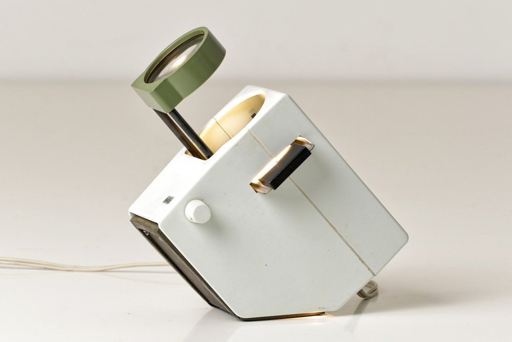 Proiettore di diapositive Designer: Dieter Rams Anno: 1962 Costruttore: Braun AG, Kronberg Paese: Germania Misure: H 14 cm L 18 cm P 17 cm Materiale: Melamina grigio chiaro, melamina verde, alluminio, melamina nera, dimmer laterale, cavo di collegamento e spina originali grigio chiaro. Interruttore a cavo secondario. Condizioni: buone condizioni Note particolari: lievi tracce di usura. È ormai abbastanza raro vedere il piccolo proiettore D 6. Il nostro alloggiamento in melamina non presenta rotture e solo piccoli difetti. Il funzionamento è pienamente garantito; l'incidenza della luce può essere focalizzata estendendo la lente. L'interruttore dimmer riduce la luminosità per diapositive molto luminose o se si desidera solo un po' di luce nello spot.