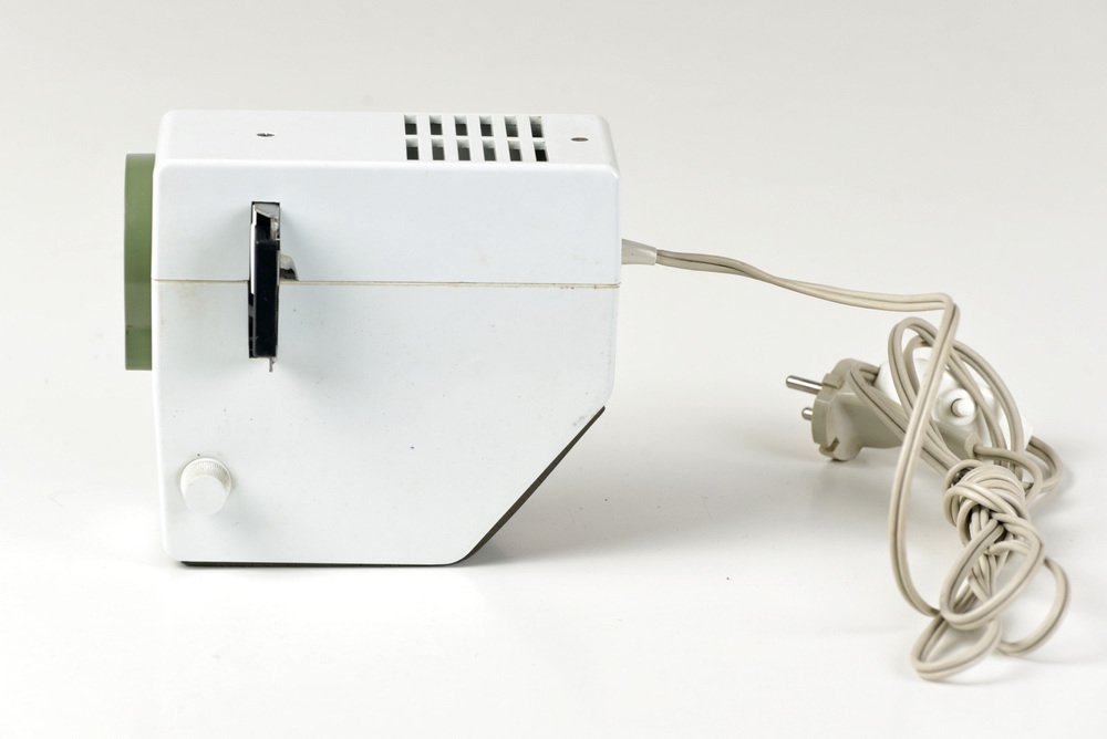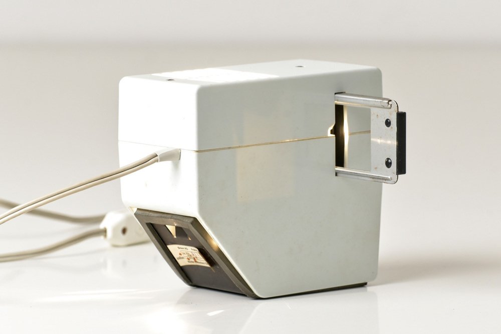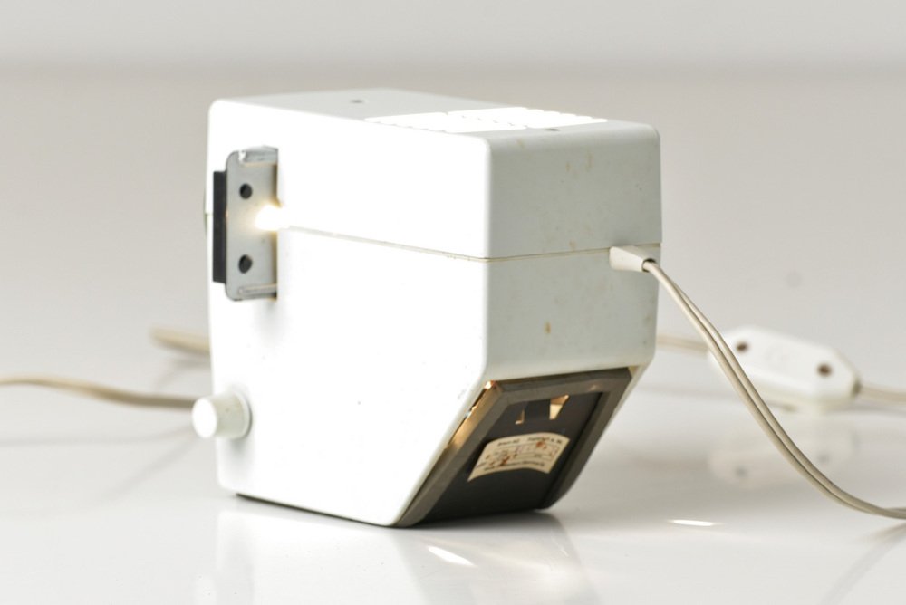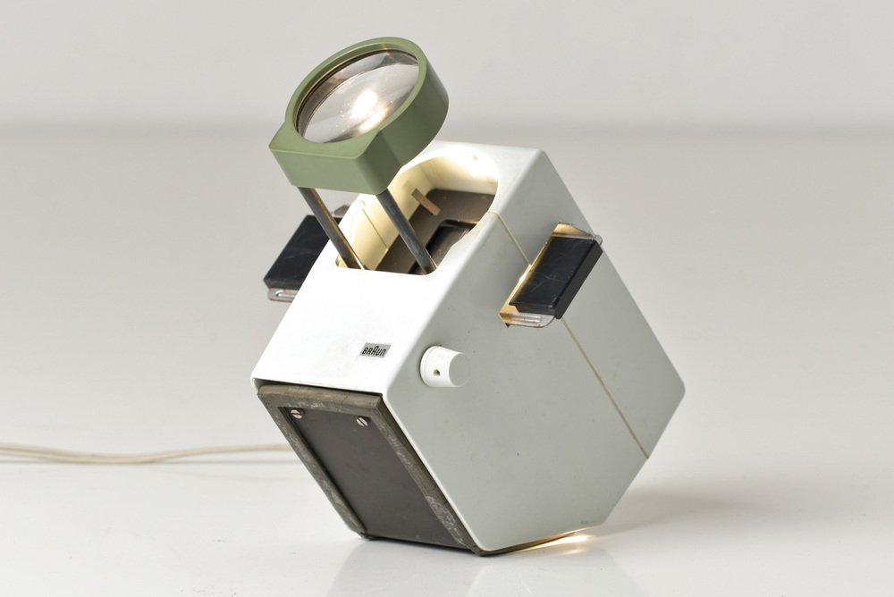 At the age of 30, Dieter Rams designed this device D6 Combiscope for BRAUN in Kronberg. This small slide projector made of matt, shimmering melamine in light gray has a second function that is extremely easy to use: the lens can be pulled out and the light can be focused to create a reflection in the room. Thanks to the slanted housing, higher surfaces can also be illuminated. When in use, a small fan inside switches on to cool the lamp. Basically, this device shows the entire radical consequence of the design of this time at BRAUN. Formally reduced to the utmost, the object is designed down to the last detail, even the nameplate is designed in Braun's own type.