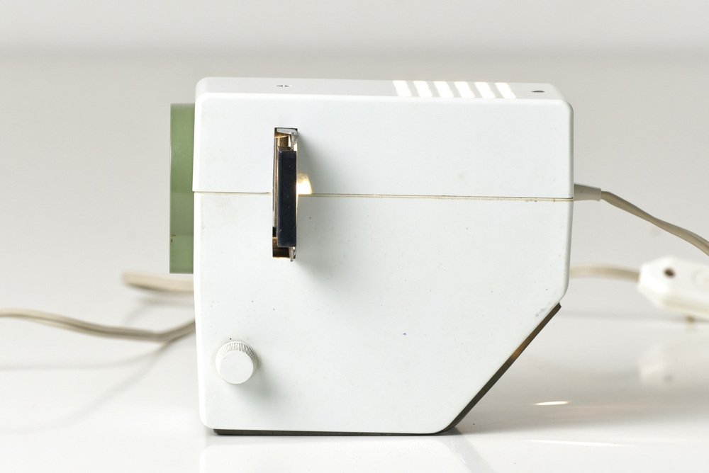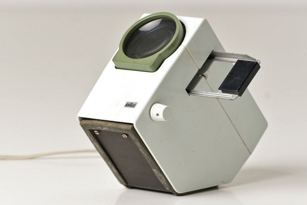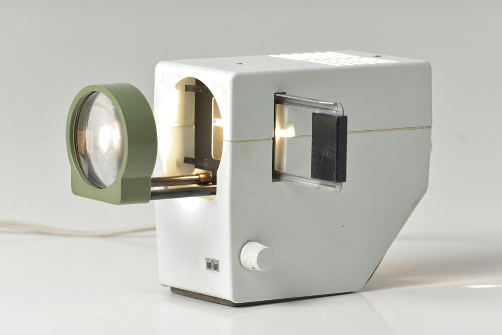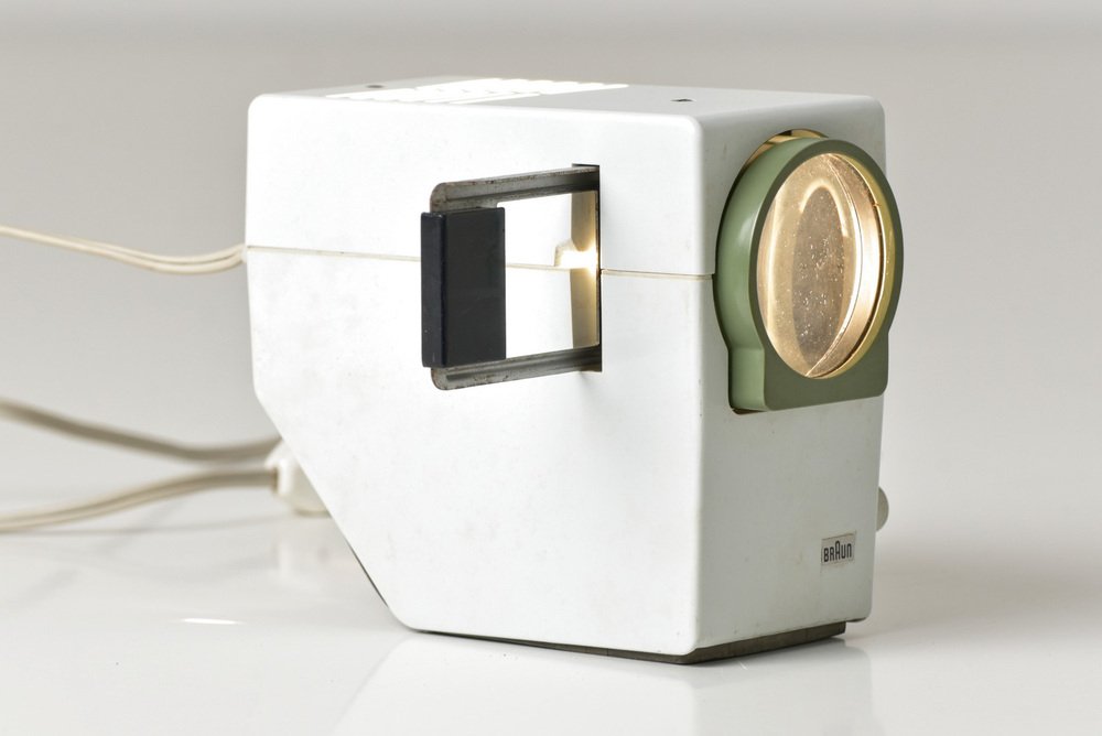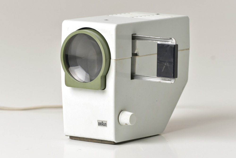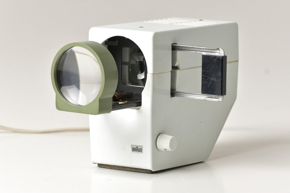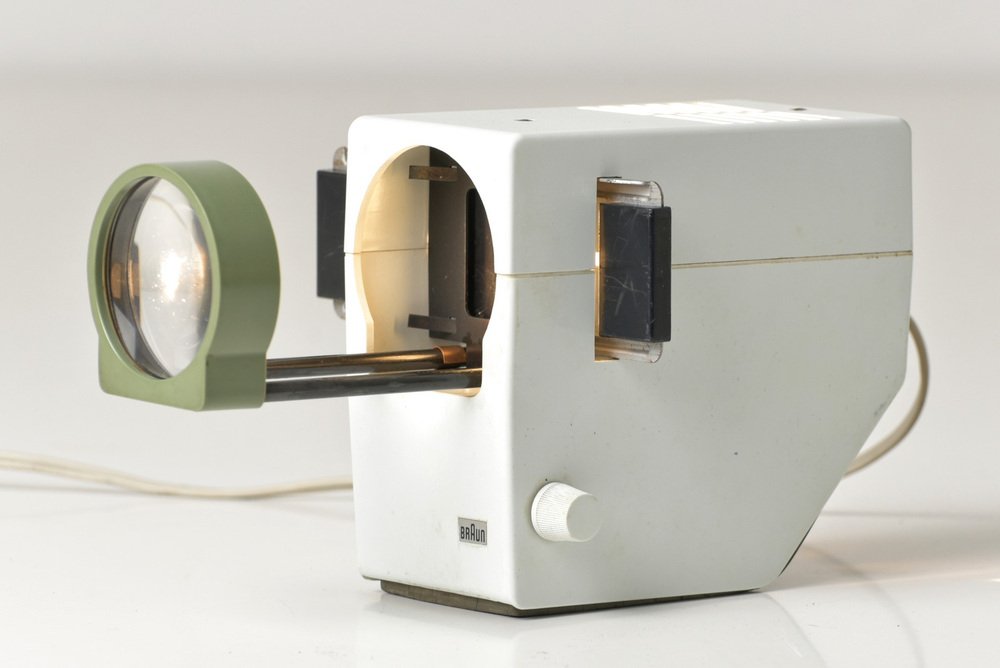 Slide Projector Designer: Dieter Rams Year: 1962 Manufacturer: Braun AG, Kronberg Country: Germany Measurements: H 14 cm W 18 cm D 17 cm Material: Melamine light gray, melamine green, aluminum, melamine black, dimmer on the side, light gray original connection cable and plug. Cord switch secondary. Condition: good condition Special Remarks: slight traces of wear. It is now quite rare to see the small D 6 projector. Our melamine housing has no breaks and only small defects. The function is fully guaranteed; the light incidence can be focused by extending the lens. The dimmer switch reduces the brightness for very bright slides or if only a little light is desired in the spot.