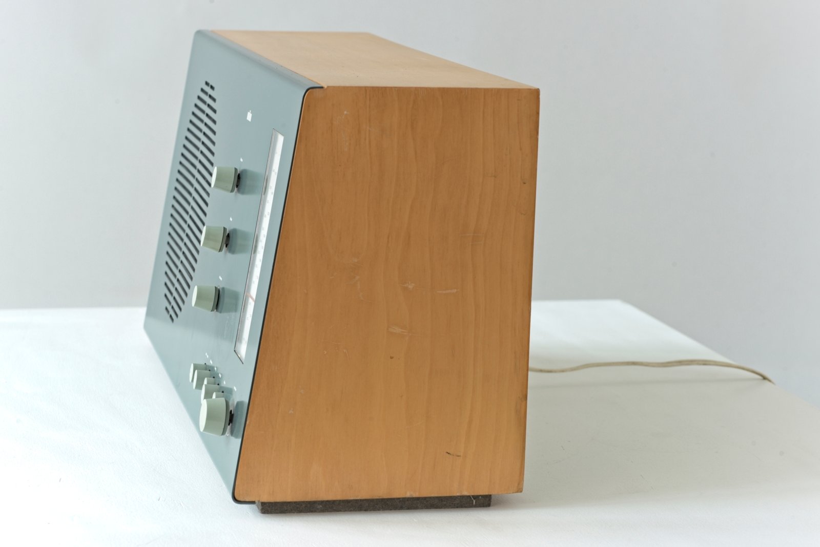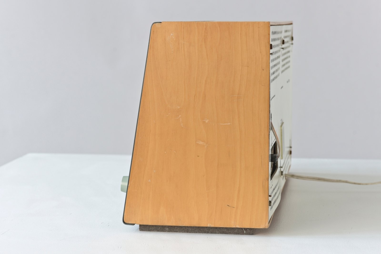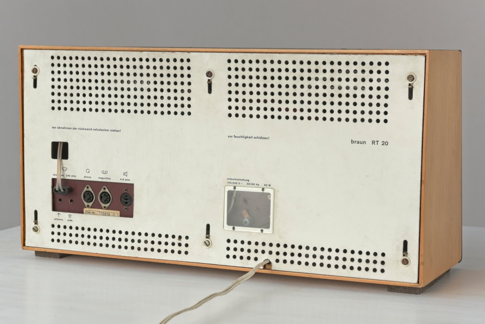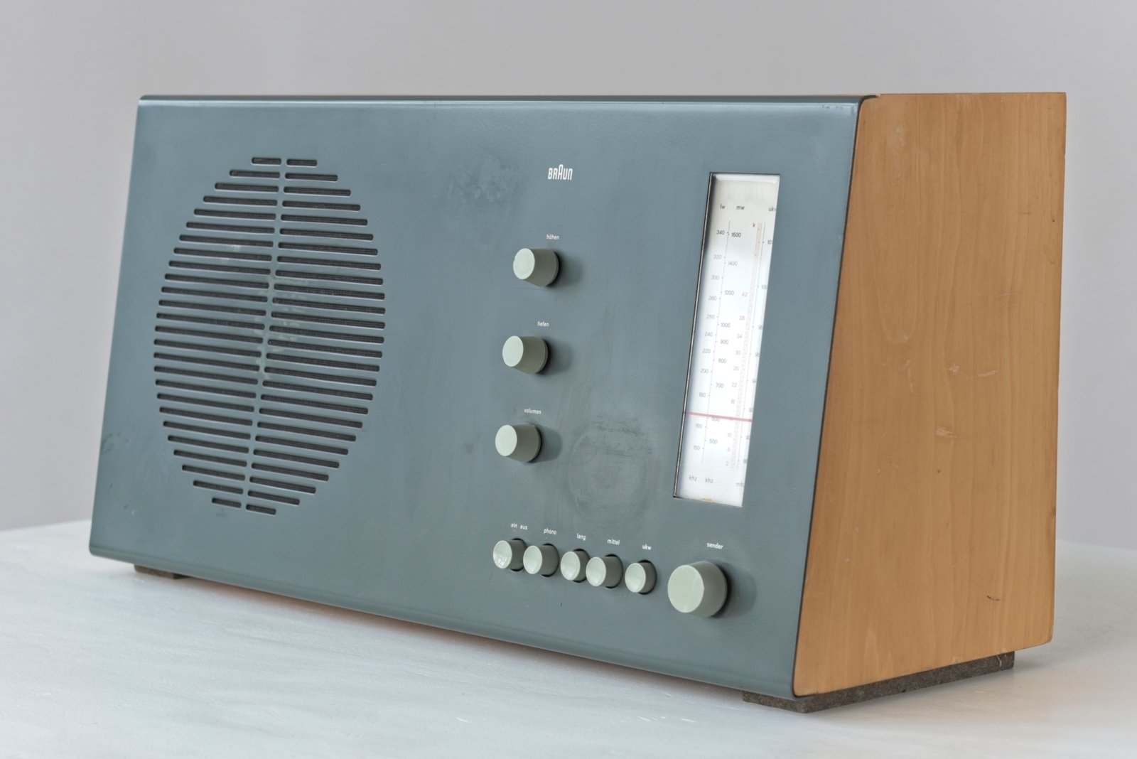 All'età di 29 anni, Dieter Rams ha progettato questa radio da tavolo per BRAUN a Kronberg. Completamente staccato dai modelli del predecessore, il ricevitore mostra un nuovo linguaggio di design e un nuovo concetto di funzionamento. I pulsanti sono disposti orizzontalmente o verticalmente a seconda della loro funzione e hanno diversi disegni di superficie. Progettato originariamente per la ricezione long, medium e VHF, si poteva anche collegare un phono (giradischi). La parte frontale smussata dà all'apparecchio un ulteriore dinamismo, le etichette sono serigrafate e sono per lo più difettose, ma qui ancora buone.
