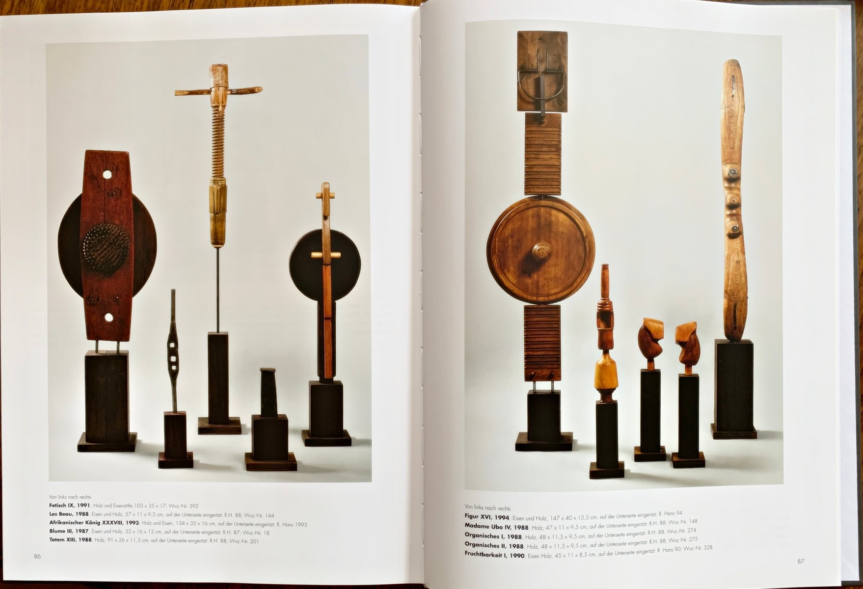 Così, Hans senza alcuna artificiosità presenta le simmetrie astratte degli oggetti di legno e metallo e li colloca interamente la tradizione artistica su un piedistallo. Inoltre, egli integra questo nell'opera. Perché come componente inferiore, la presa non solo prepara la scultura, ma rilassa, scatena o rafforza la sua connessione alla terra. Con questa erezione, egli dà alle sculture un'ulteriore vita propria, per così dire una seconda esistenza, e dà loro una nuova identità con un nuovo nome. "Mostrano la loro personalità, una più, un'altra meno, come è nella vita, o nell'arte" Cosa significa per tutti loro, il loro lavoro è del passato in questo qui e ora. Essi rivelano la loro bellezza originale e il mistico che ispira la nostra immaginazione.