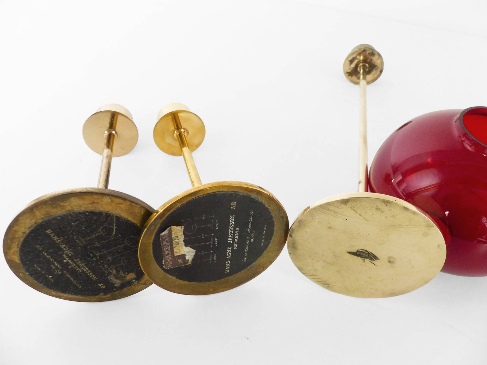 Raro set di sette portacandele modello NR135 in ottone dorato e vetro soffiato rosso, disegnato da Hans-Agne Jakobsson per Liljeholmens Stämningsljus e prodotto da Hans-Agne Jakobsson AB Markaryd, Svezia.