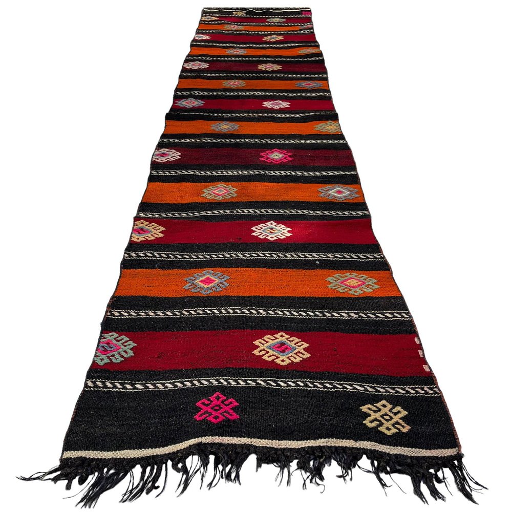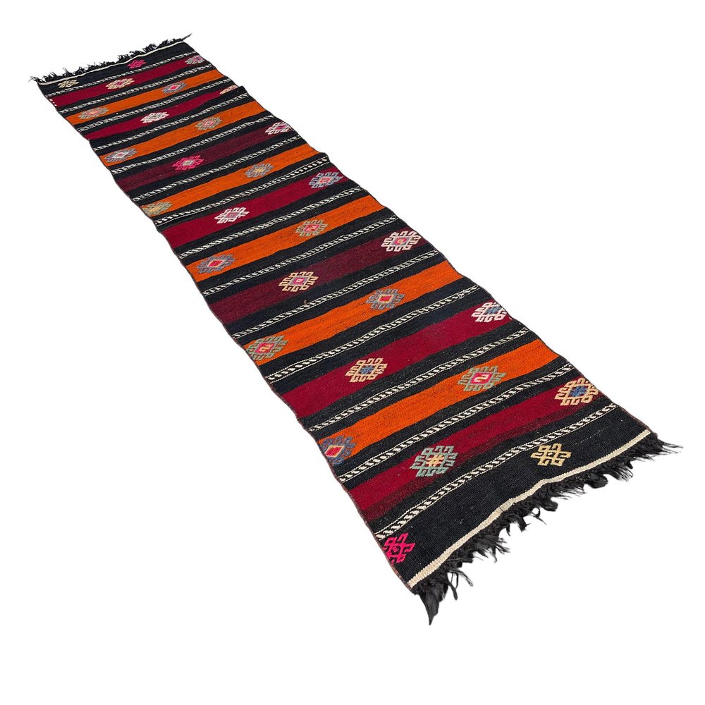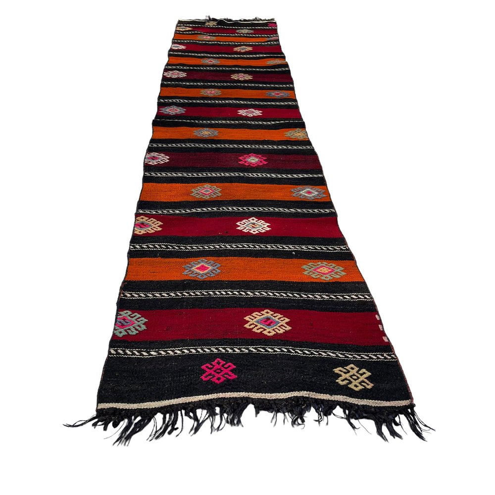 This traditional Turkish kilim rug, also known as a vintage Anatolian Turkish kilim, is a stunning piece measuring 290 by 68 centimetres. This handmade rug is made from high quality materials including cotton and wool to ensure excellent durability and long lasting use. The rug is sent by a small company in Germany, which ensures that it gets to you in perfect condition. The rug's 1960s age will add character and charm to any room, and its handcrafted craftsmanship is sure to impress. The dimensions of the rug are 68 centimeters in width and 290 centimeters in length, which makes it perfect for medium to large rooms. The soft, muted colors of the Kilim rug are naturally dyed, creating a beautiful hue that blends well with different color palettes. The quality of the rug's materials and craftsmanship ensure that it will stand the test of time and retain its beauty and practicality for years to come. This traditional Turkish Kilim rug is ideal for use in any room and will add a touch of elegance and warmth to your home decor. The rug's durable materials make it perfect for high-traffic areas like living rooms, dining rooms, and even bedrooms. The seller professionally cleans all rugs prior to shipment to ensure optimal cleanliness and instant enjoyment for the customer. The seller also guarantees that no child labor has gone into the manufacture of this rug as it is produced under fair and decent working conditions. The seller is involved in the Care & Fair initiative against child labor in the rug trade, showing its commitment to ethical and responsible production practices. Get this uniquely beautiful traditional Turkish Kilim rug home now and add a touch of elegance and warmth to your home decor today.