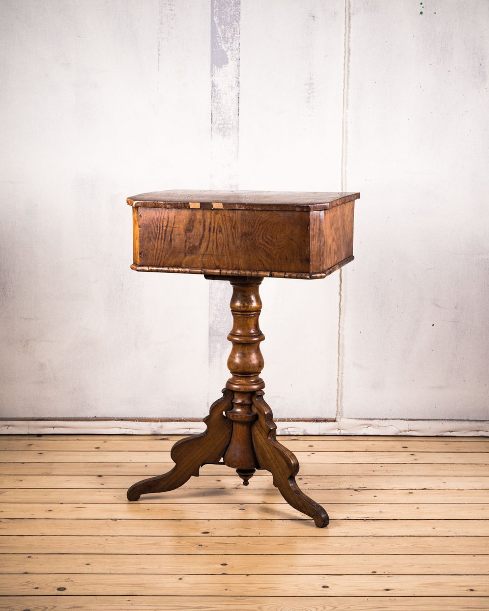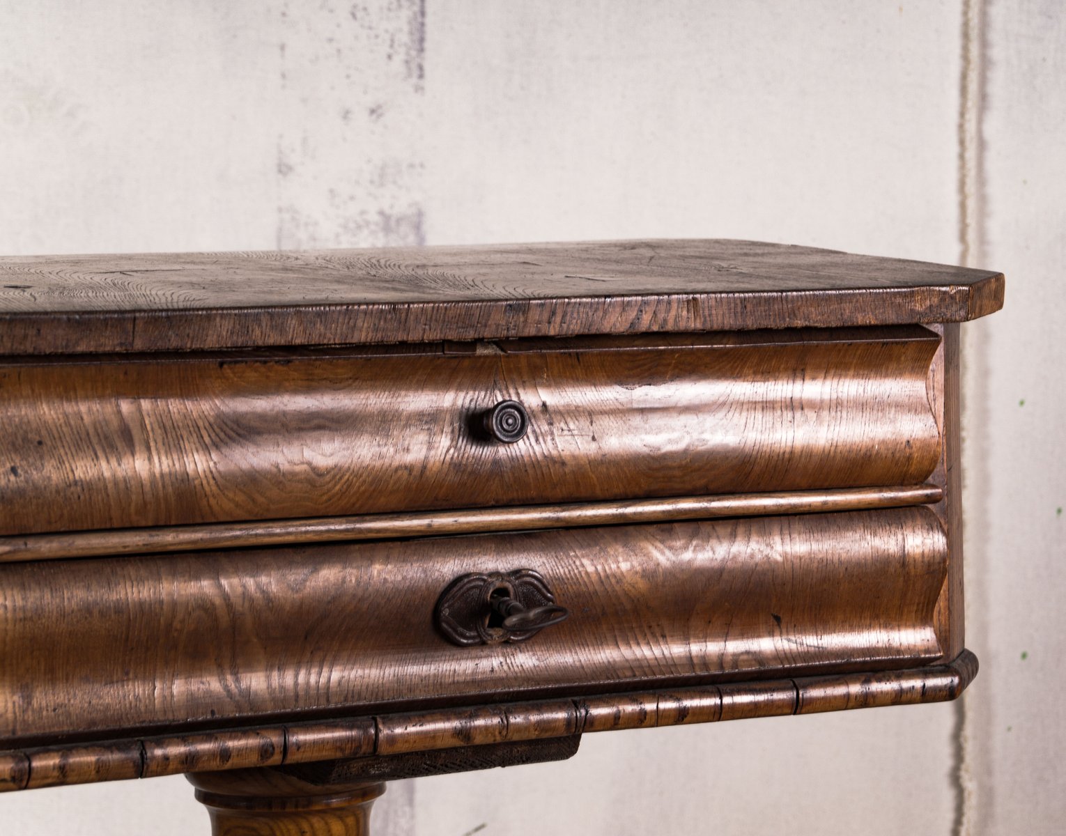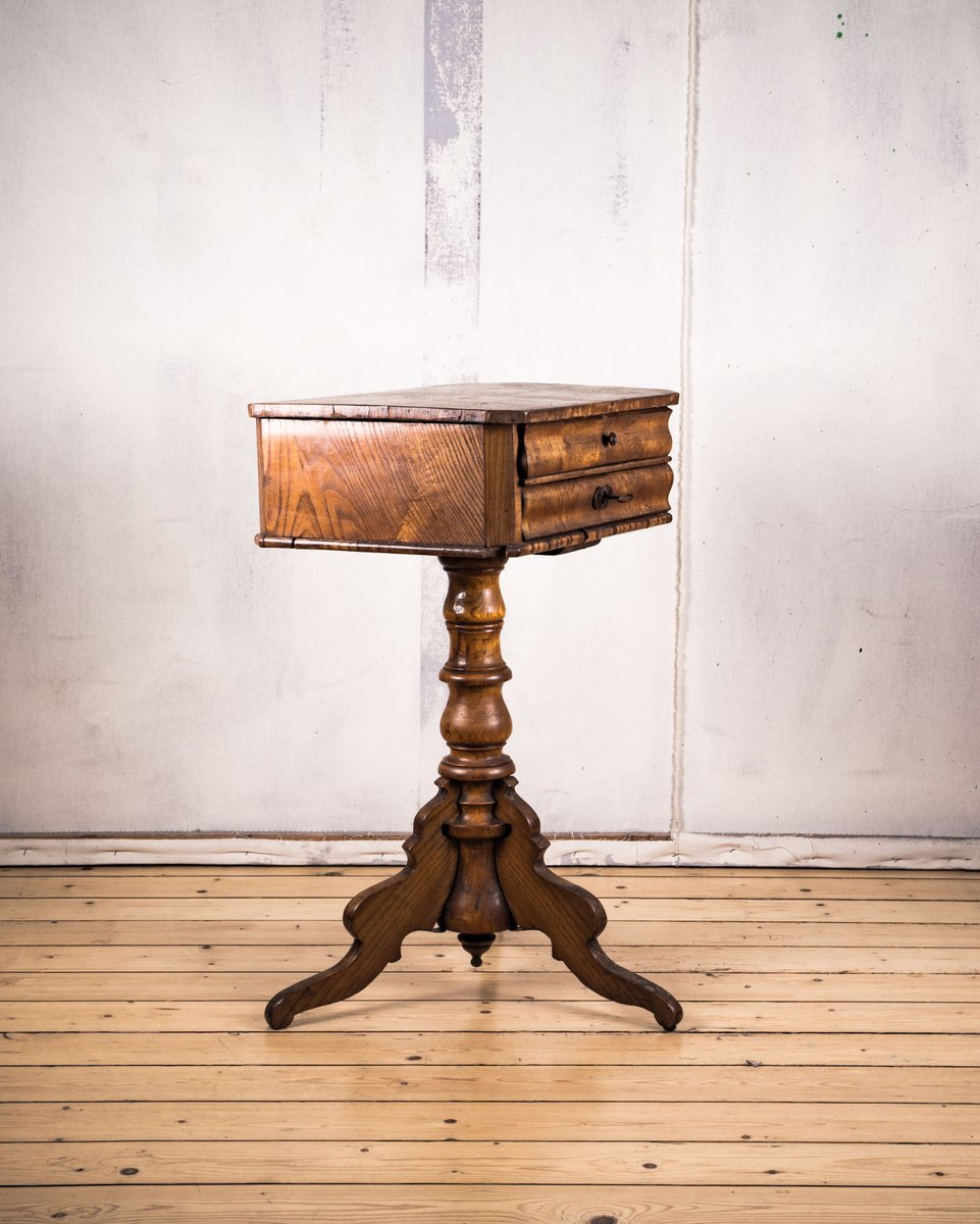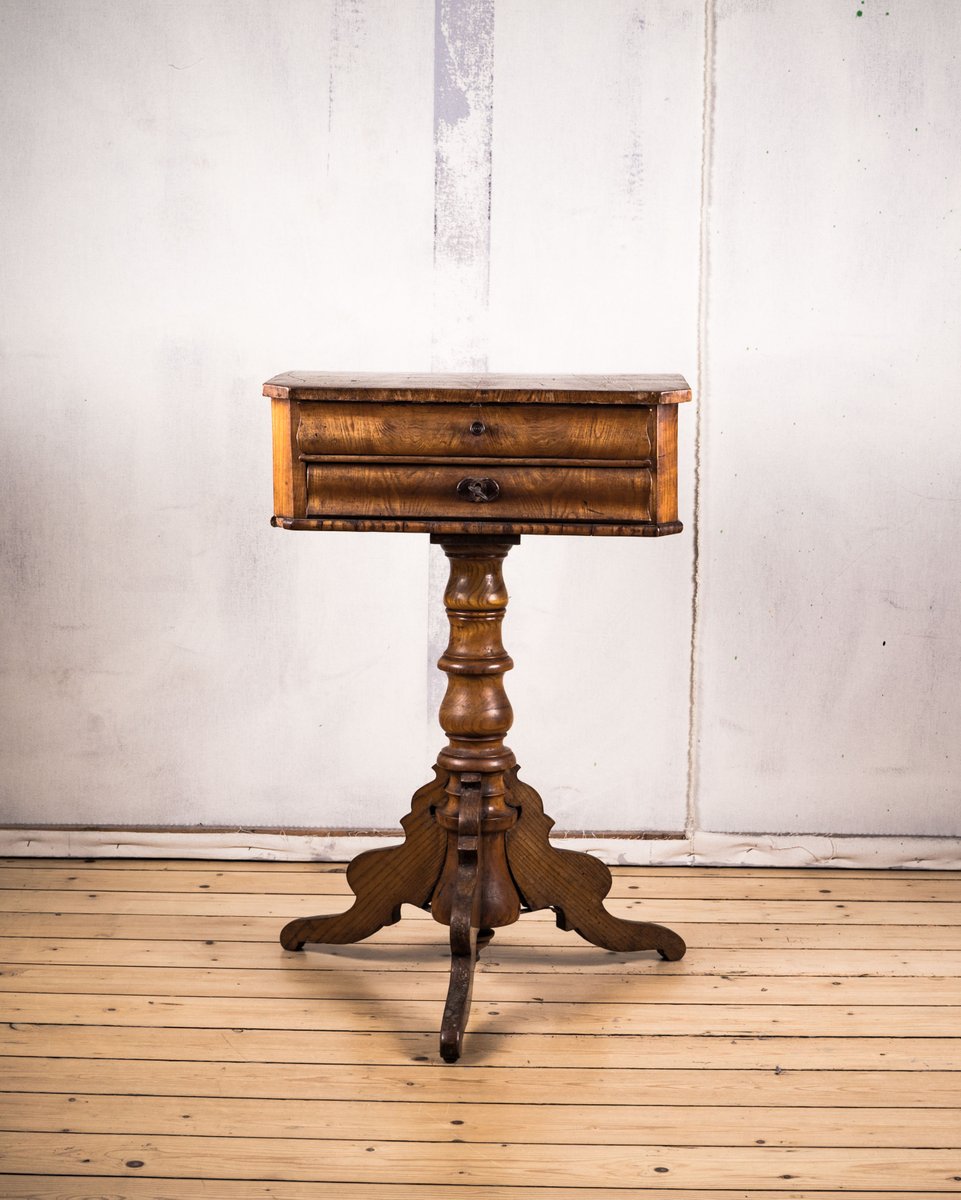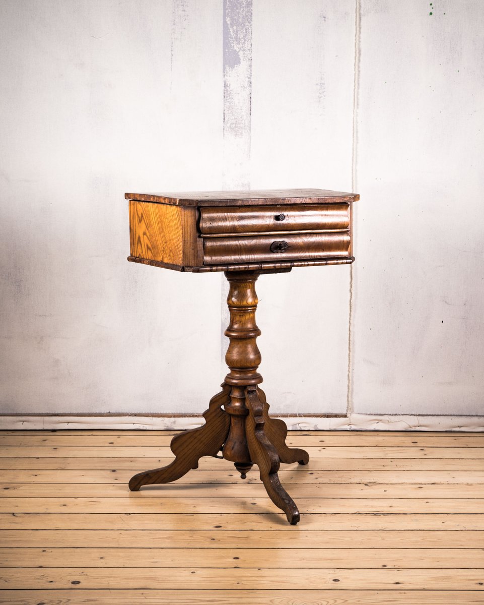 This sewing table dates from the second half of the 19th century and combines classic design with practical functionality. Crafted from walnut, partly veneered on softwood, it features a three part serpentine base resting on a turned central support. The top contains two drawers, the upper one with a practical compartmentalized section for sewing accessories. The rectangular tabletop offers a generous working surface. Thanks to its versatility, the table can be used flexibly as a functional piece of furniture, a decorative highlight in living or working spaces, or a stylish addition to historic interiors. Its timeless simplicity, combined with sculptural appeal, makes it a true eyecatcher.