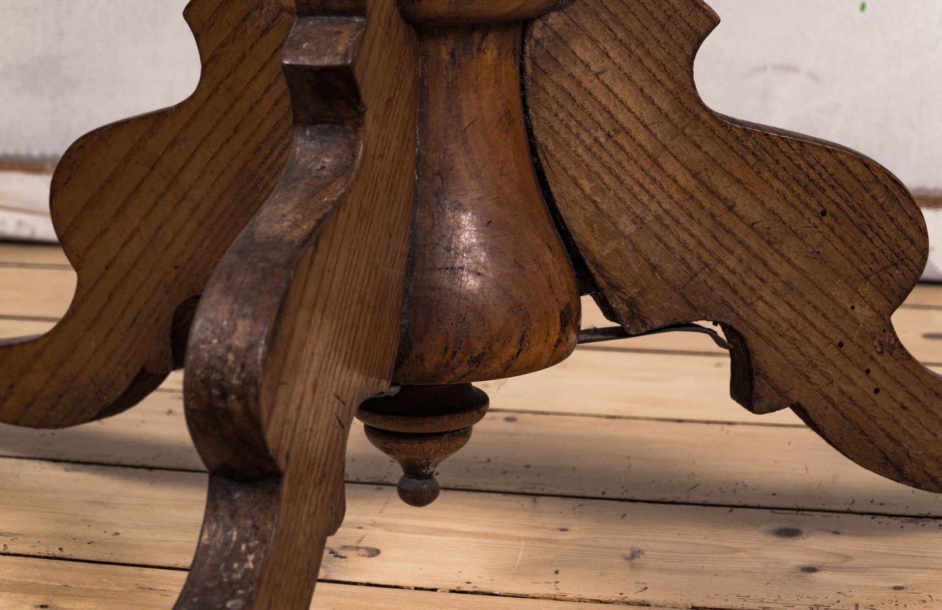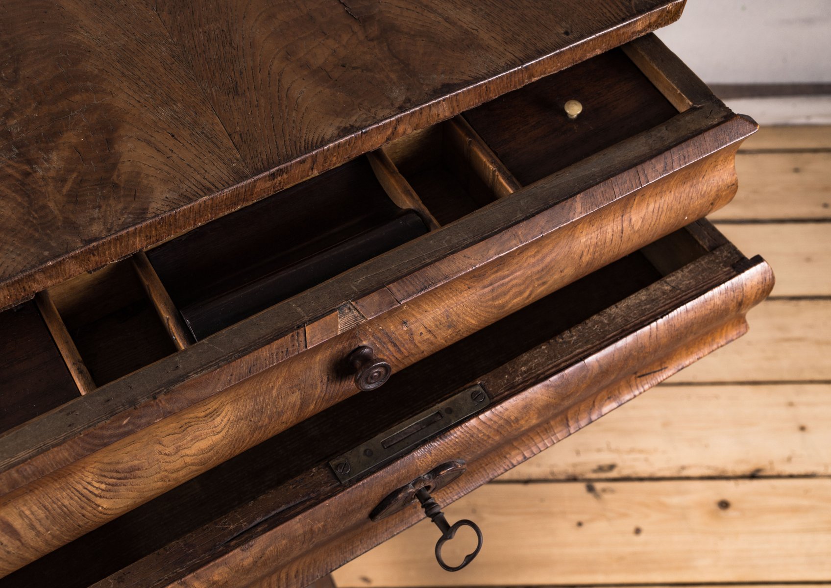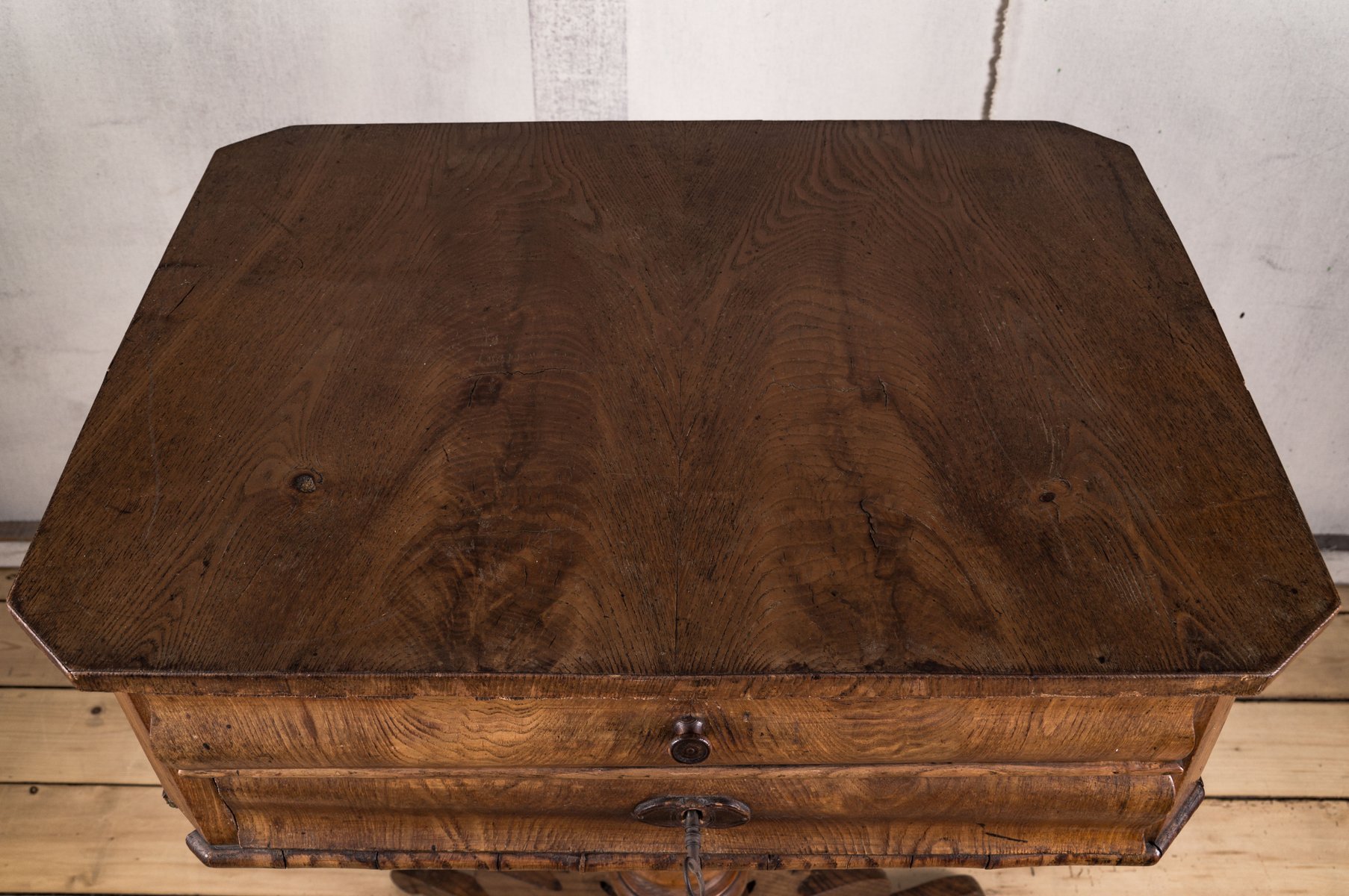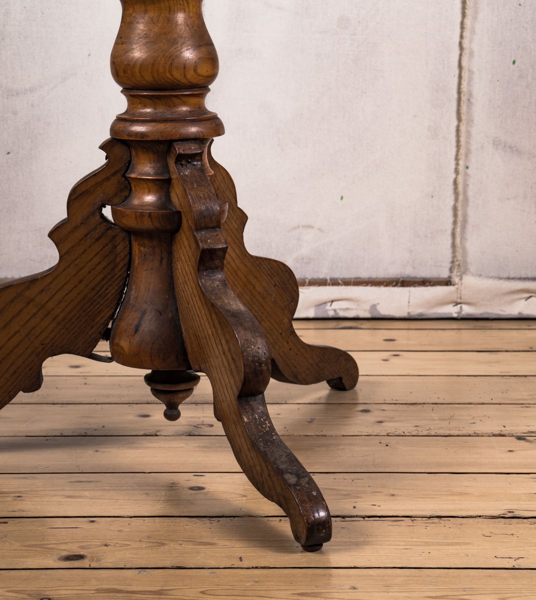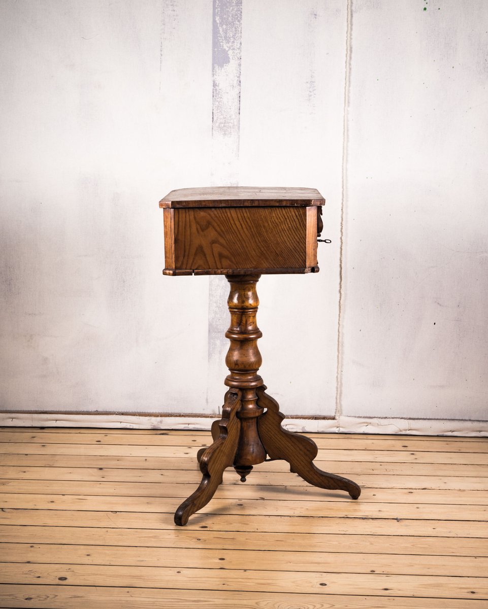 This sewing table dates from the second half of the 19th century and combines classic design with practical functionality. Crafted from walnut, partly veneered on softwood, it features a three part serpentine base resting on a turned central support. The top contains two drawers, the upper one with a practical compartmentalized section for sewing accessories. The rectangular tabletop offers a generous working surface. Thanks to its versatility, the table can be used flexibly as a functional piece of furniture, a decorative highlight in living or working spaces, or a stylish addition to historic interiors. Its timeless simplicity, combined with sculptural appeal, makes it a true eyecatcher.