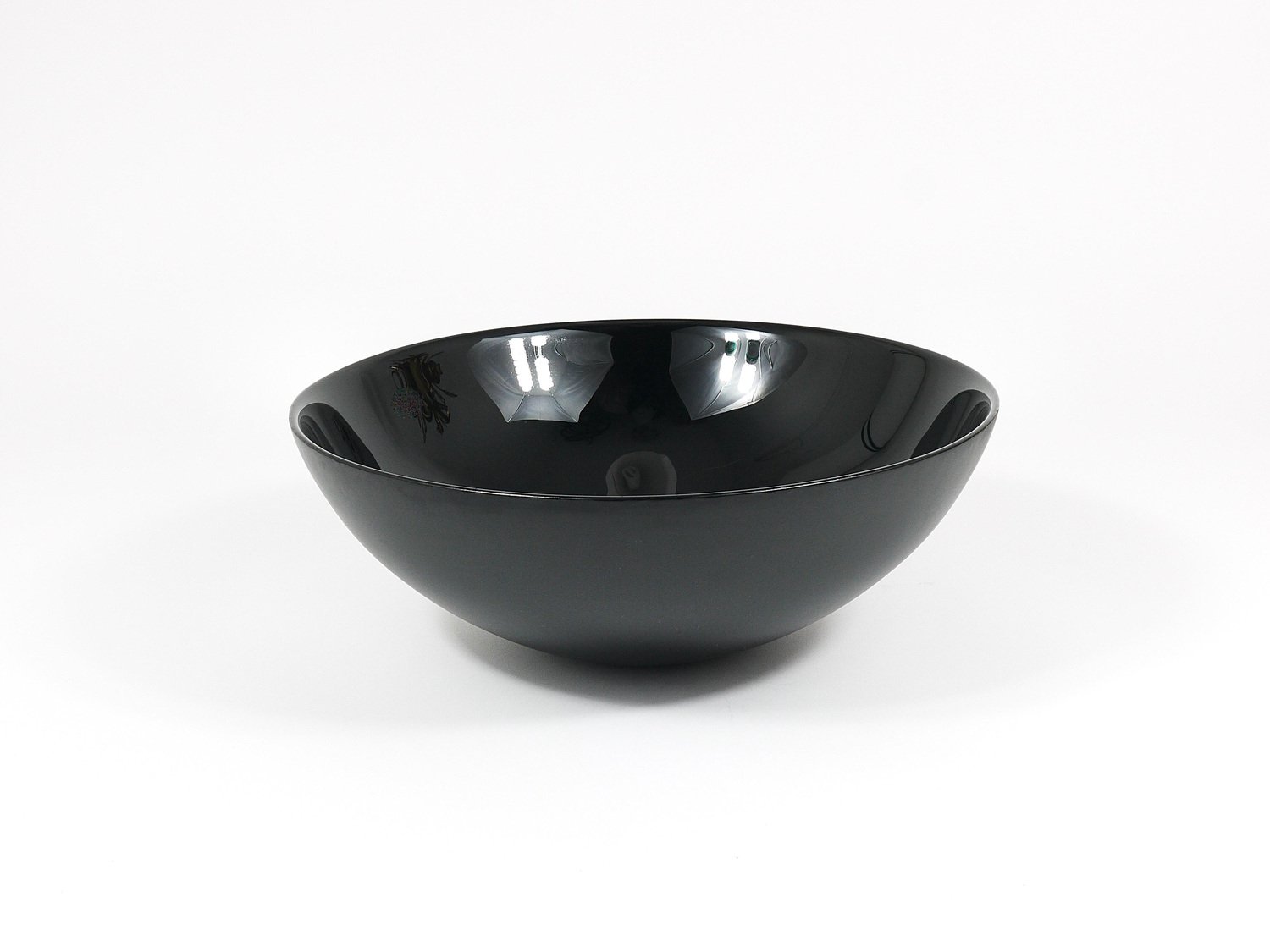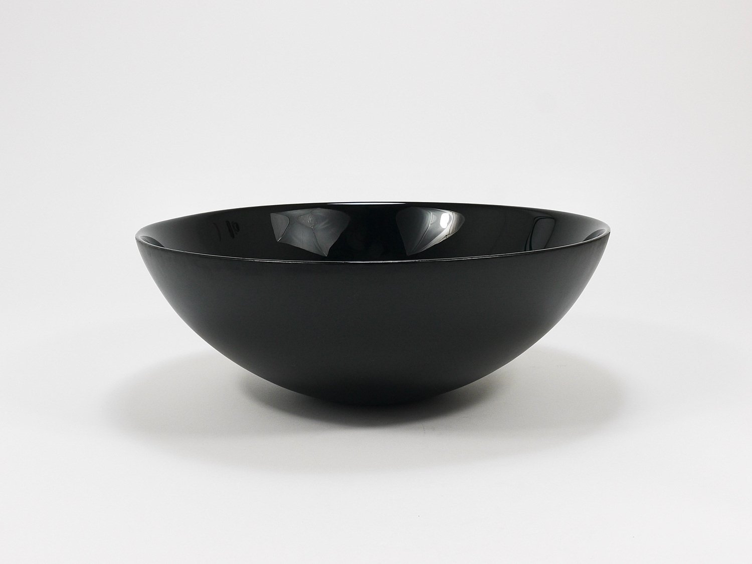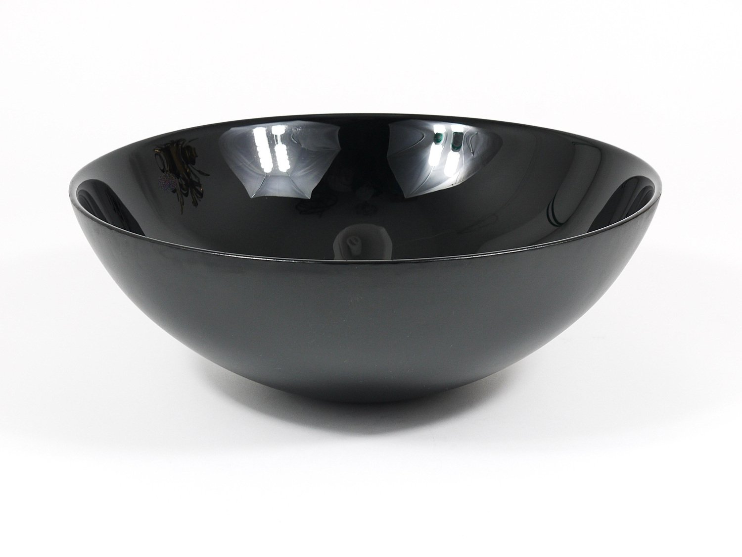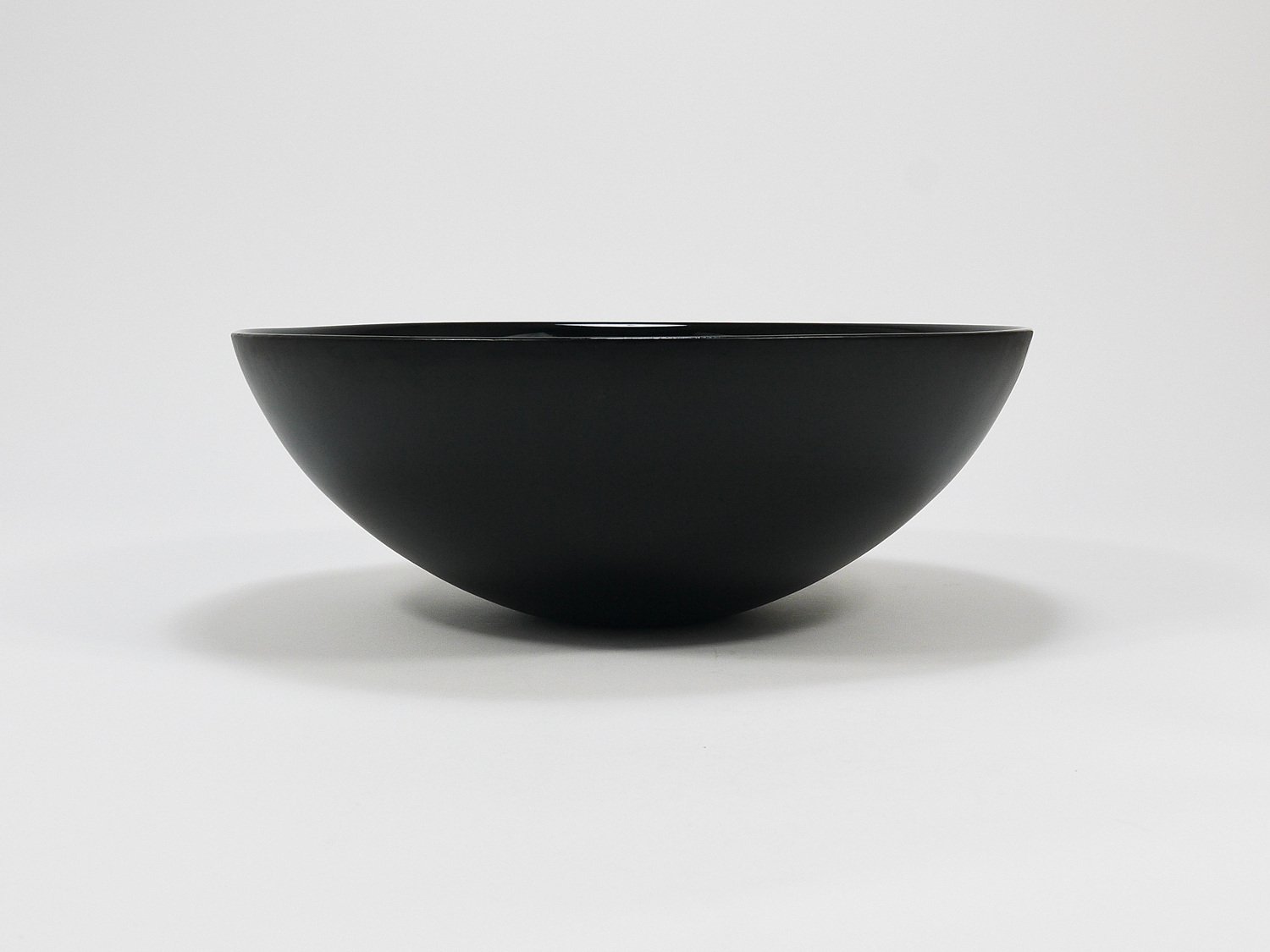 A straight and large, 14 inches diameter postmodern centerpiece glass bowl from the 1980s. Crafted from deep black glass, this bowl stands out with its reduced, elegant design, featuring a high-gloss interior and a matte exterior. It is part of the Riedel Mesa Collection, created through the collaboration between Claus Joseph Riedel (Austria) and Mesa Design (Italy) from 1986 to 1996. The bowl is very solid and in good condition with only minor signs of wear, like a few unavoidable fine scratches and light aging on its exterior . It is marked "Riedel" on the underside. This piece is not only highly decorative—ideal for display on a shelf or in a cabinet—but also makes an excellent fruit bowl. We currently offer more pieces from the Riedel Mesa Collection in our other listings. Mesa, founded in the 1980s, is a producer of handmade luxury home accessories. They collaborated with renowned designers such as Gio Ponti, Cetti Serbelloni and Bruno Munari.