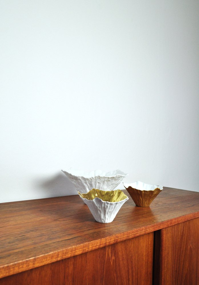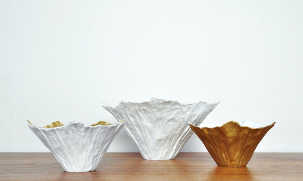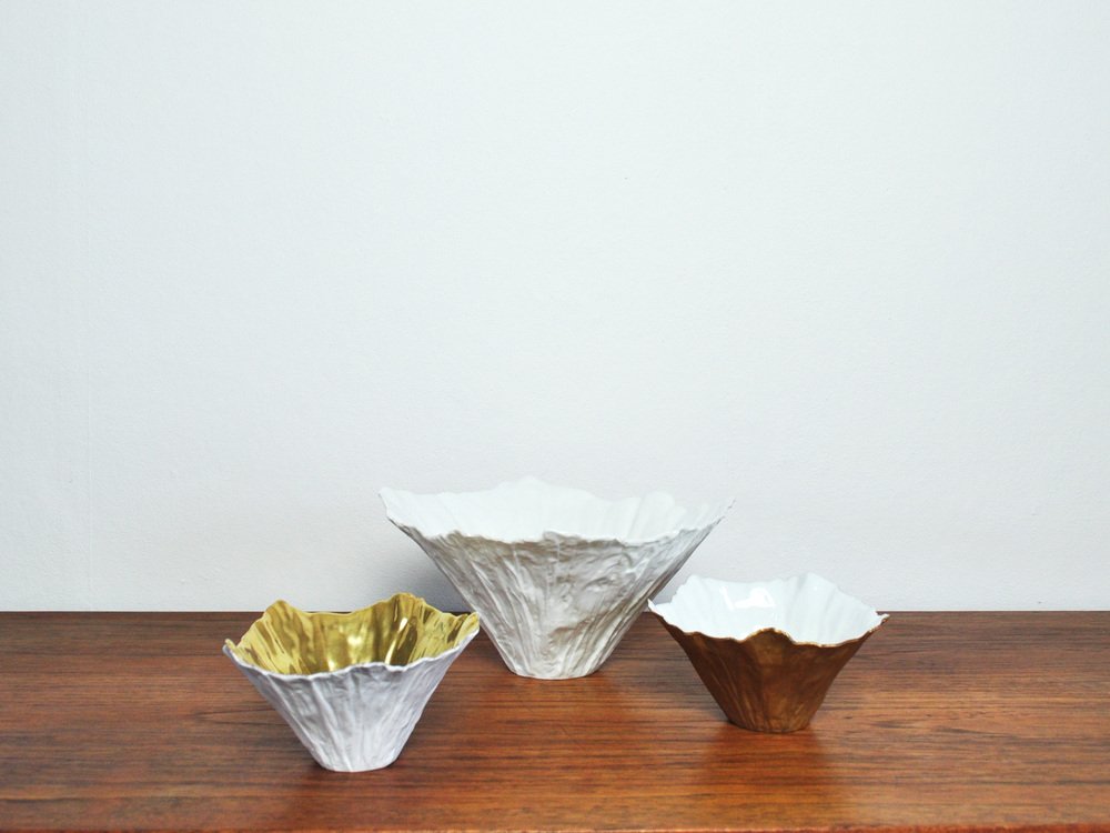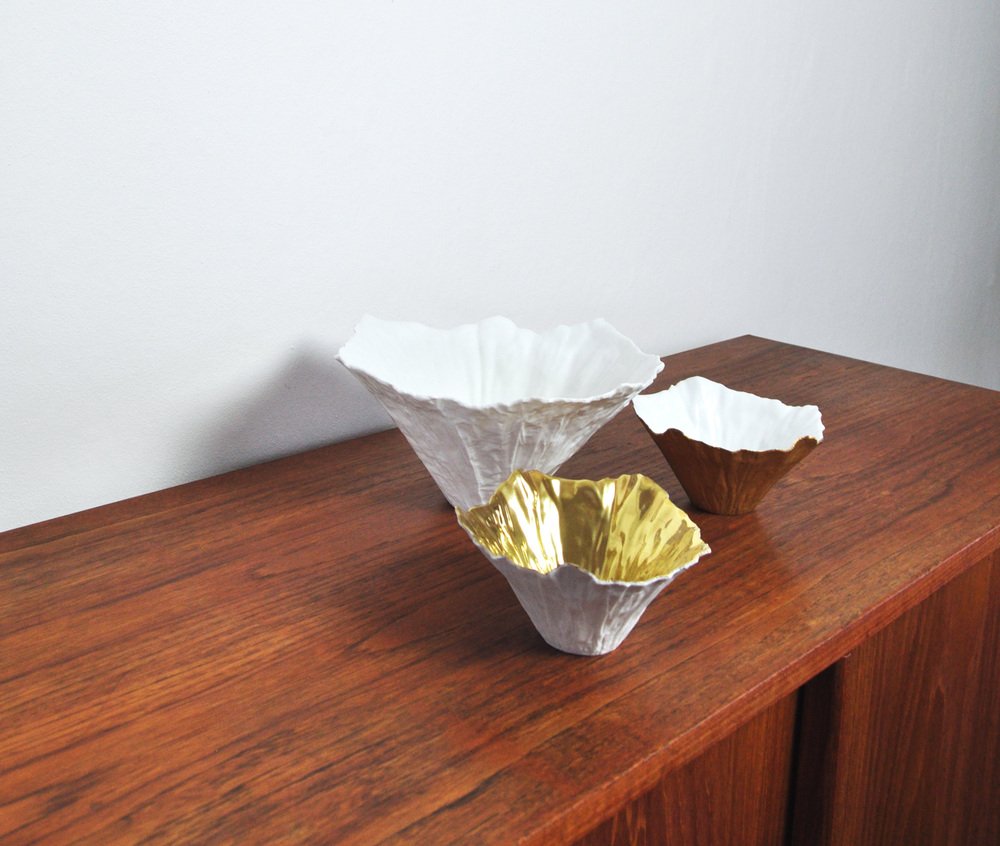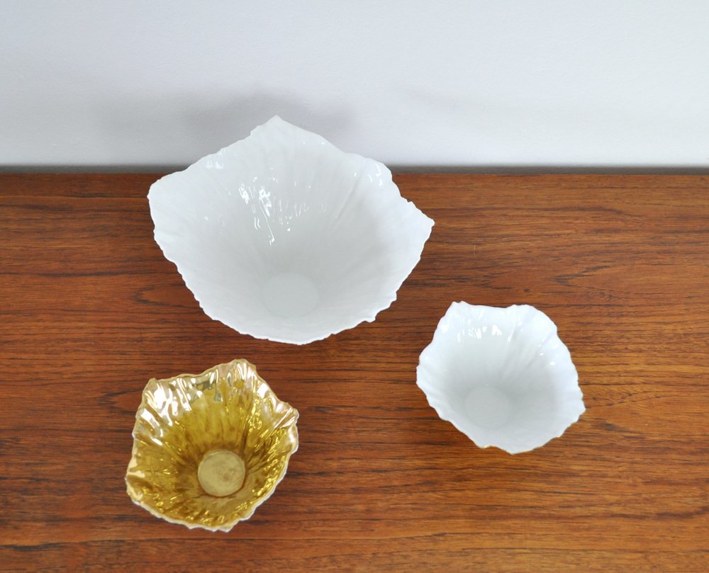 Scodelle dorate in porcellana bianca di Violase Lunn per Royal Copenhagen, set di 3