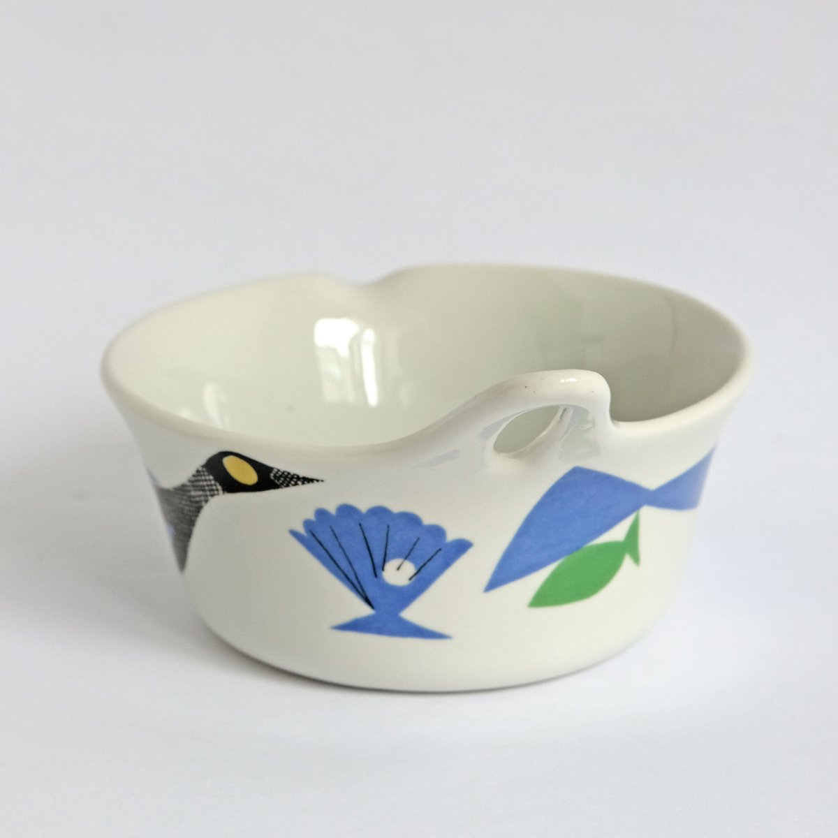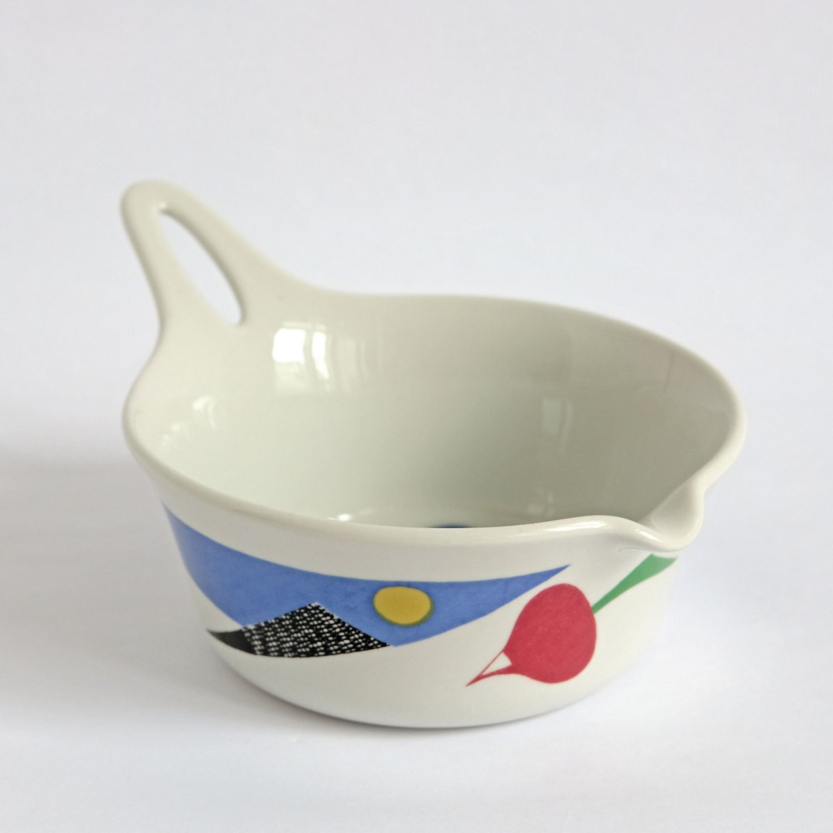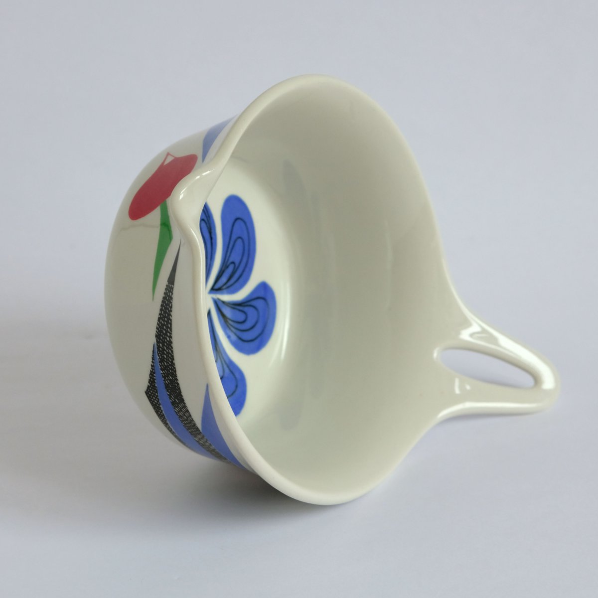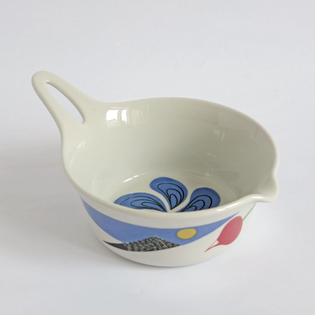 From 1955 to 1960, Bongard took freelance design positions designing tableware for Figgjo, specialized in porcelain and, Polaris Fabrikker, specialized in stainless steel. In 1960, Bongard moved into an art director role at the Fredrikstad-based PLUS, for whom he, outside of broad managerial guidance, provided designs for ironwork, textiles, braided wooden bowls, and furniture in braided manila rope. His enameled-steel Conform Tray Table (1962) remains a cherished piece from this phase—its teak framing and general Jetsons-esque geometry emblematic of the midcentury Scandinavian aesthetic form.