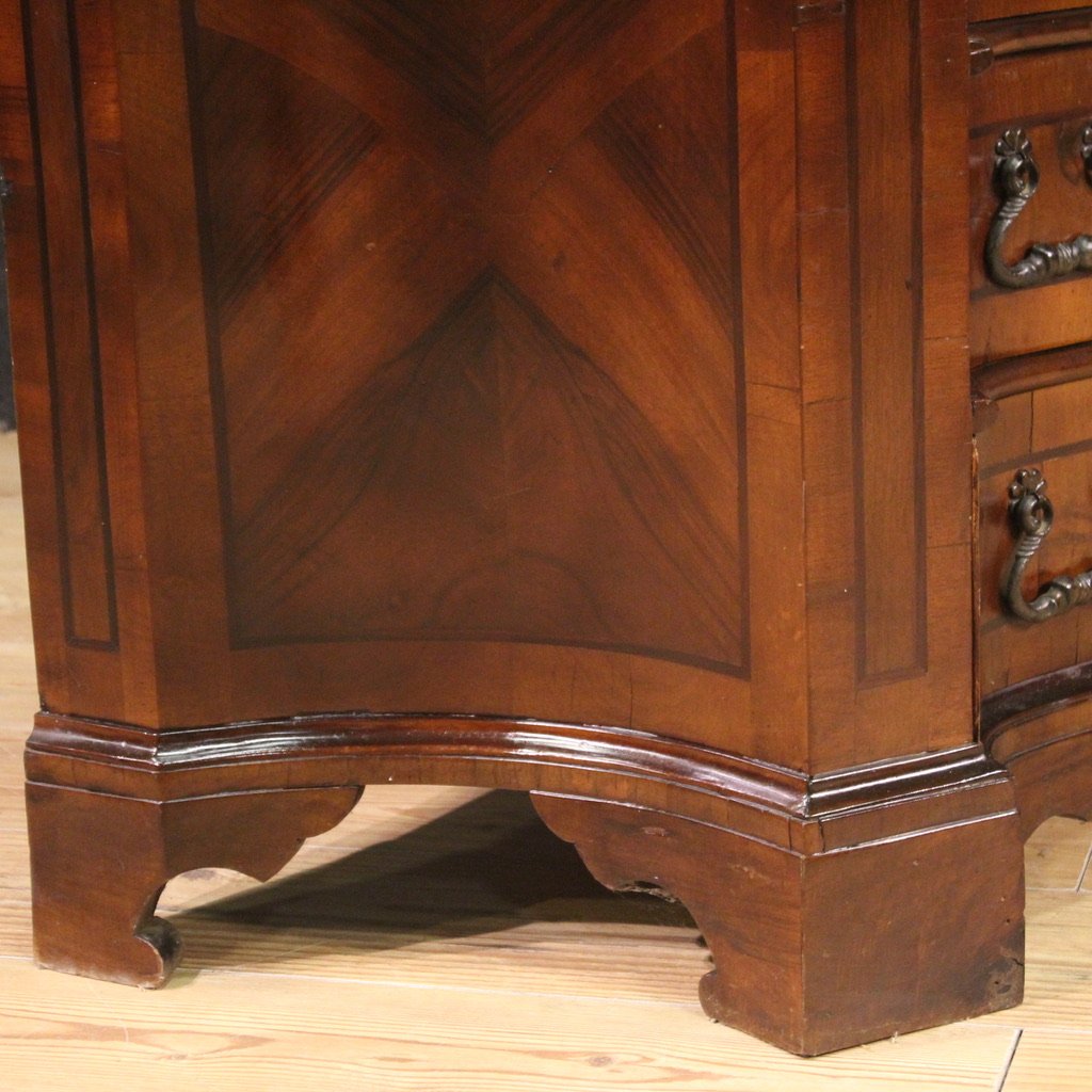 Venetian bureau from the mid-20th century. Furniture with a wavy front and sides, inlaid with walnut and mahogany wood, beautiful lines and pleasant furnishings. Bureau equipped with three large external drawers plus fall-front. The interior of the furniture is equipped with four small drawers, a central compartment for documents and a writing surface of good size and service. Desk for the living room or study, for antique dealers and interior decorators, of good size and great impact. Complete with a working key, it shows some signs of wear. Overall in good condition.